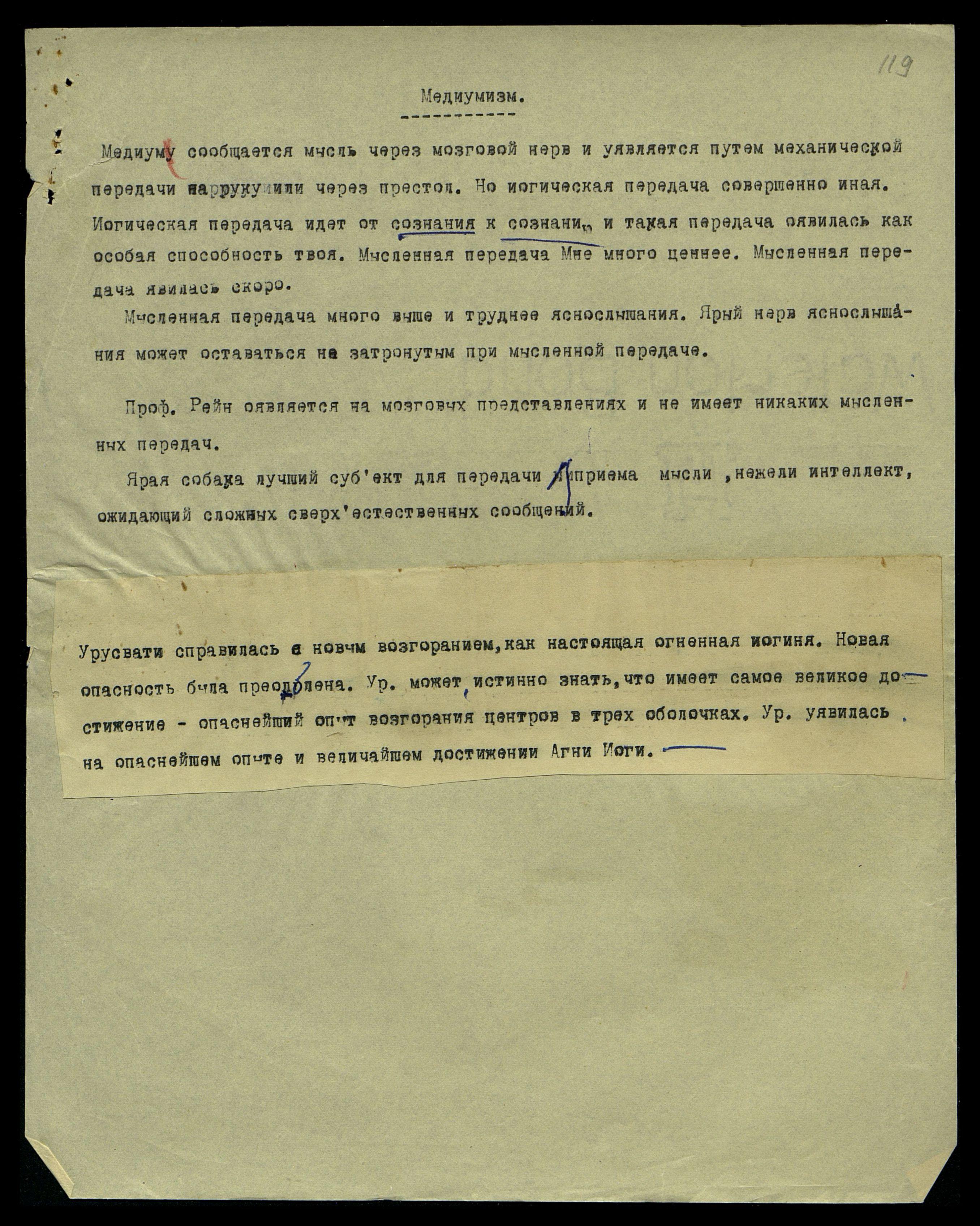 Медиуму сообщается мысль через мозговой нерв и уявляется путем механической передачи на руку или через престол. Но йогическая передача совершенно иная.