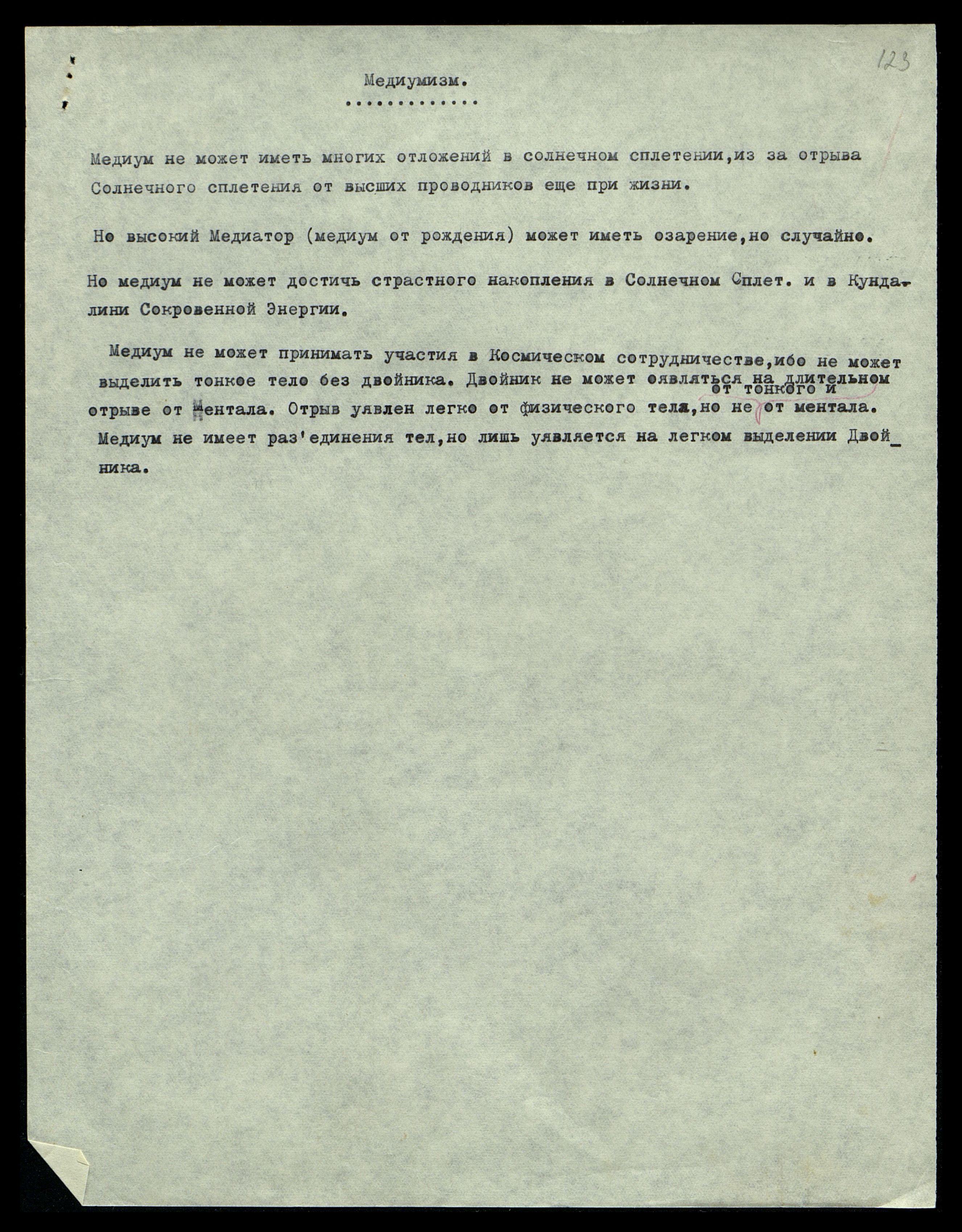 Медиум не имеет нервной нити, привязывающей его Солнечное Сплетение к позвоночнику, потому его тонкие тела разъединены от физического. Преждевременный отрыв Солнечного Сплетения от позвоночника, или медиумизм, не дает возможности тонким телам проявляться на высших планах и тем самым получать питание из хранилищ психической энергии.
