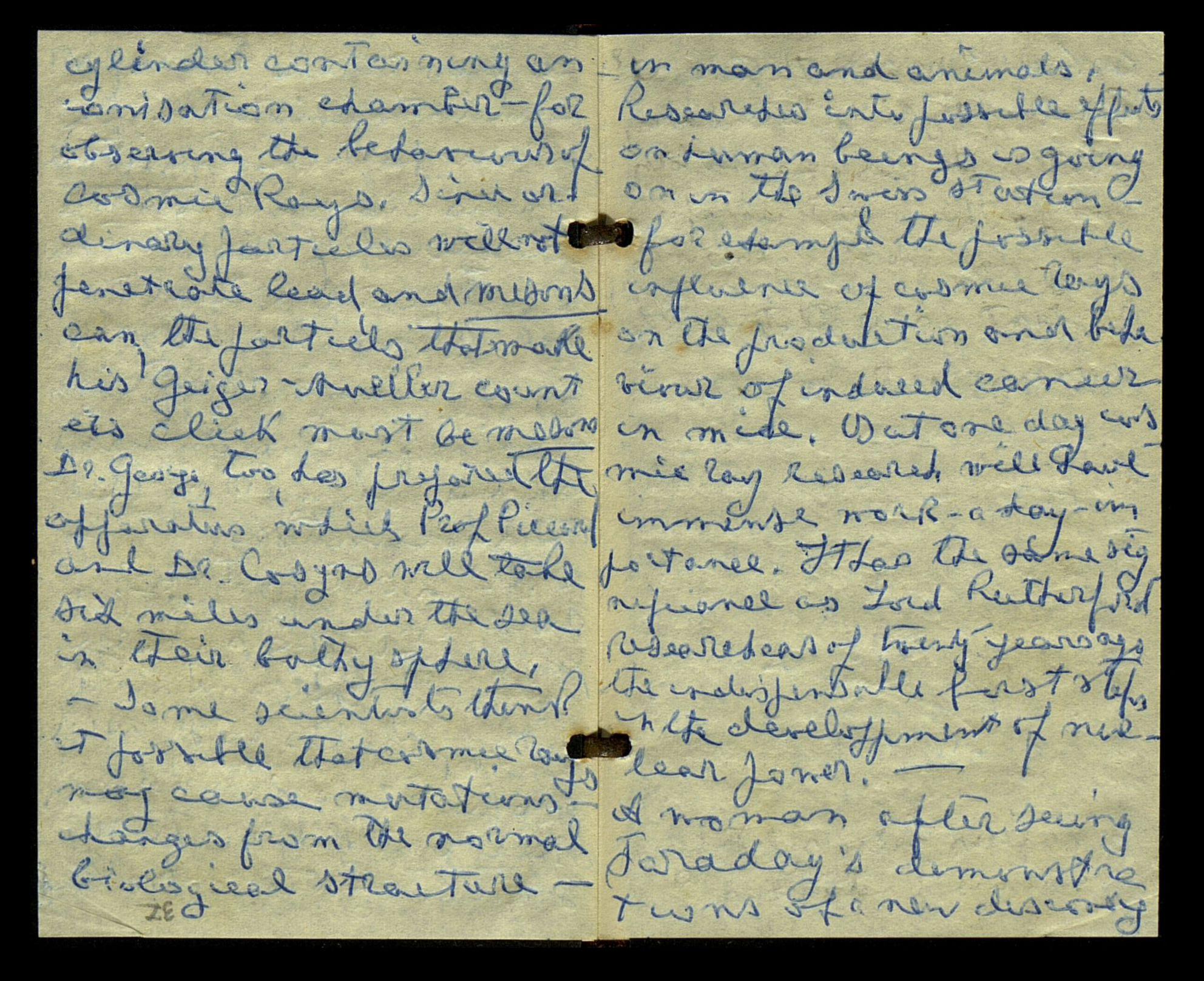 Another big technical advance was made by Prof. Blackett when working at the Cavendish Laboratory in Cambridge. He made the rays take their own photographs in the cloud-chamber. And was a few day's a head of the American Anderson in publishing photographs of positive electron tracks which first proved the existence of a new particle the positron. In his Manchesters Laboratories Prof. Blackett has a realy international team which includes a Czeh, an American, an Egyptian, a chinese, two Indians and a number of British scintists.