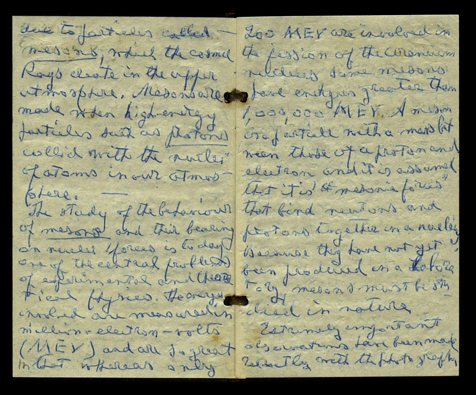 due to particles [одно слово неразборчиво] mesons, which the cosmic rays create in the upper atmosphere. Mesons are made when high energy particles such as photons collide with the nucleus of atoms in our atmosphere. The study of the behaviour of mesons and their bearing of nuclei focus is today one of the central problems of experimental and theoretical physics. The energy charges are measured the millions electron-volts (MEV) and are so great that where as only 200 MEV are involved in the fassion of the Uranium nucleus, same mesons have energies greater that 1 000 000 MEV. A meson is a particle with a mass between those proton and electron and it is assumed that it is mesonic forces that find neutrons and protons together in the nuclei. Because they have not yet been produced in the laboratory, mesons must be studied in nature. Extremely important observations have been made recently with the photography