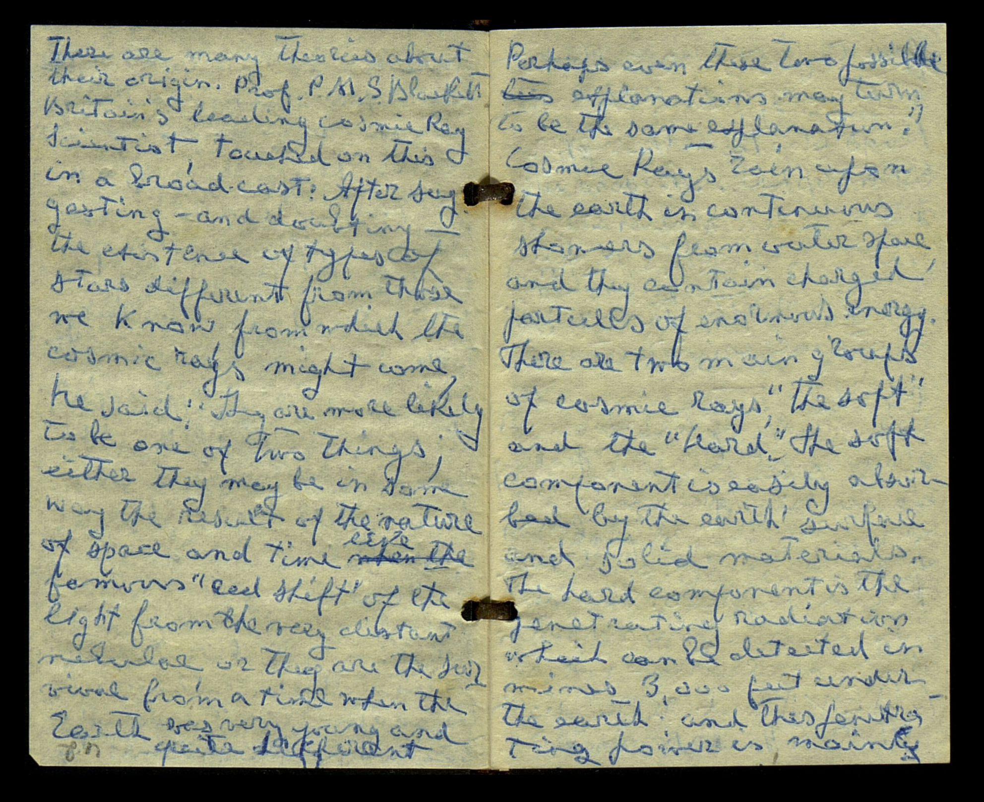 [англ: Об их происхождении существует множество теорий. Проф. П.М.С. Блэк в Великобритании, ведущий ученый, занимающийся космическими лучами, коснулся этого в передаче. Предложив и составив схему существования типа звезд, отличных от известных нам, из которых могут исходить космические лучи, он сказал: они могут быть одним из двух; то есть они могут быть каким-то образом результатом природы пространства и времени, вроде знаменитого «красного смещения» света из очень далеких туманностей, или они являются пережитком тех времен, когда Земля была очень молодой и [два слова неразборчивы]. Возможно, даже эти два возможных объяснения могут оказаться одним и тем же объяснением. Космические лучи [одно слово неразборчиво] падают на Землю непрерывными ливнями из космоса, и они содержат заряженные частицы огромной энергии. Есть две основные группы космических лучей - мягкие и жесткие. Мягкий компонент легко поднимается над слоем поверхности Земли и твердых материалов. Жесткий компонент - это генерирующее излучение, которое можно обнаружить на расстоянии 3000 миль под Землей, и эта генерирующая энергия в основном]