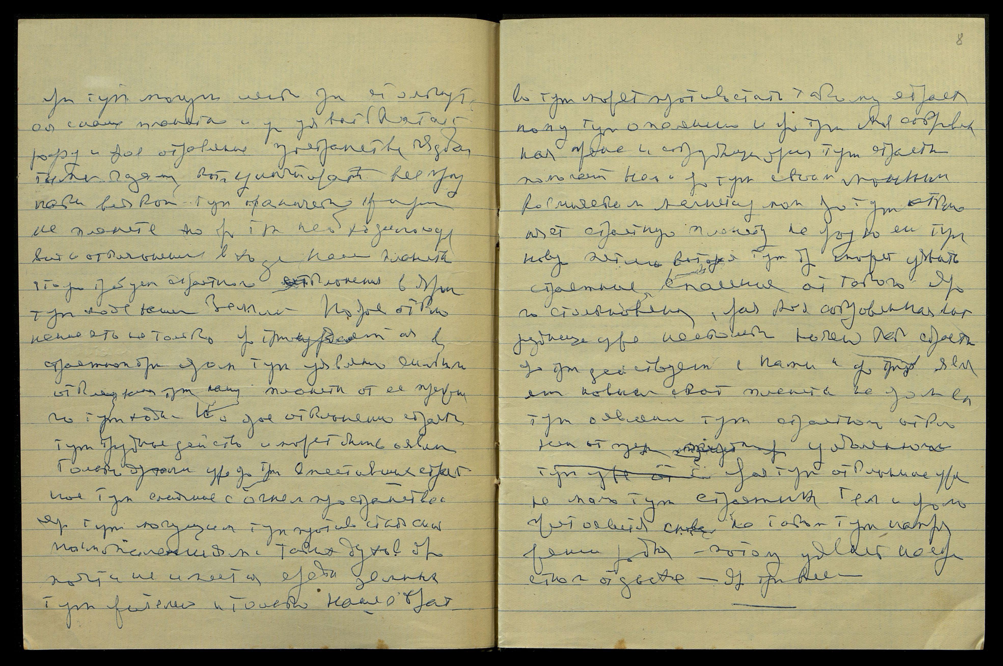 7/ХI. Яро ярая знает, насколько Мне нужна твоя помощь во всем, и яро родная старается явить Мне её, родная. Но яро не волнуйся за Катр[ин]. Яро тут ярая [уже] понимает, что нельзя являться на раздражении, яро ярый нуждается в добром и внимательном отношении. Ярому осталось немного, и яро нужно ей дотянуть, яро дотянуть. Но яро не так уж трудно угодить старику, он очень не требователен, но нуждается в ласке и яром сердечном отношении, но ярая тут страстно оявлена на ярой тут раздражительности и нетерпеливости. Яро ояви ей необходимость доброго отношения. Яви, яви, родная, свое сердце и вдохни в неё желание уявить старику радость на последнем пути ему. Яро, яро оявись на прекрасном ей уроке, и ярая поймет, что ярая неправа, уявляя ему страстно ярое тут раздражение и яро тут страстный гнет от его присутствия. Яро, яро чует, что ярая ждет не дождется освободиться от него, но яро тут мечтает получить наследство от него, но ярая тут страстно жаждет уявиться на ярой тут свободе. Яро, яро уяви ей тут страстную признательность, уявленную [слово неразборчиво]. Яро, яро тут ояви, любимая,
