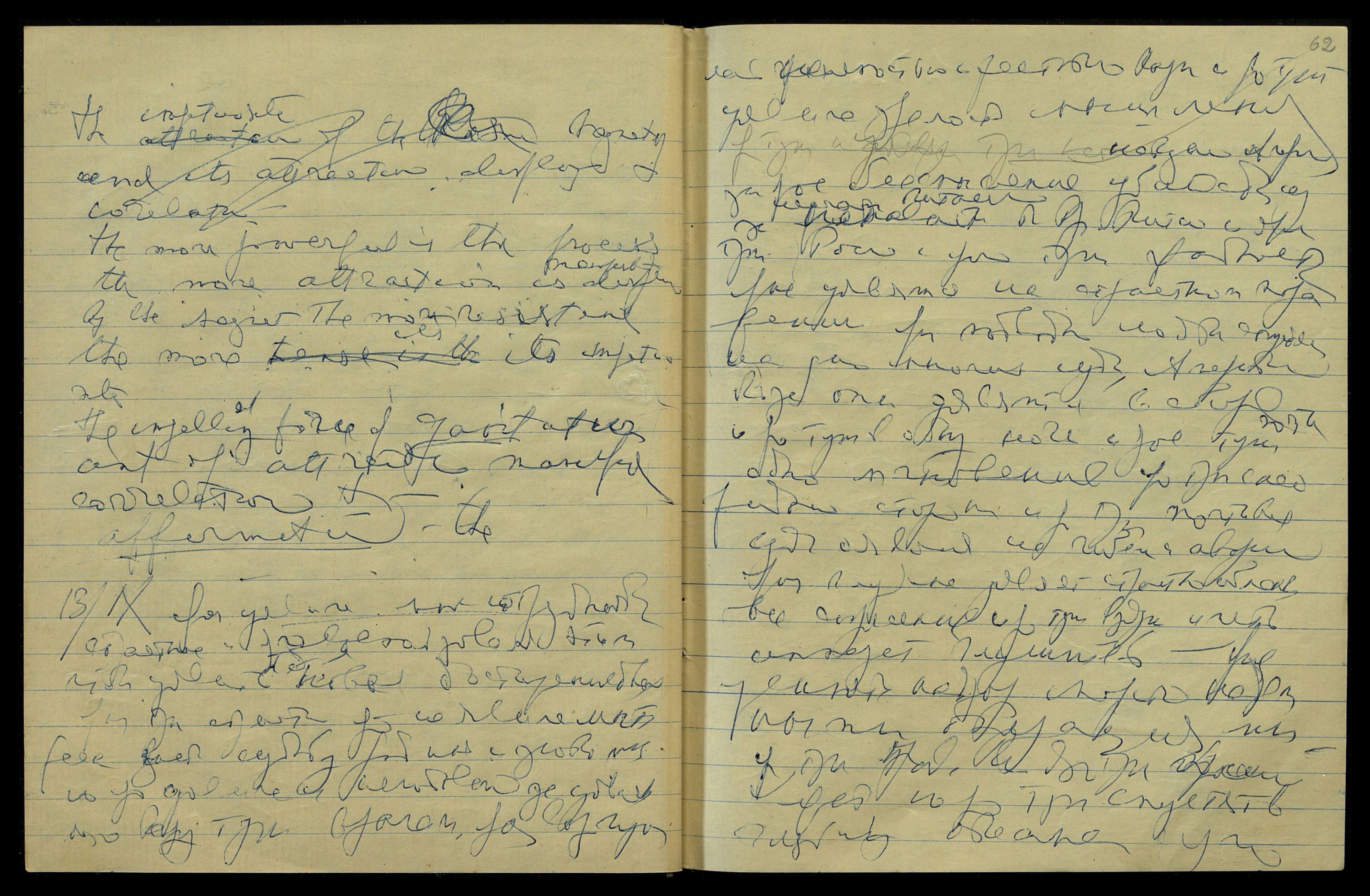 12/IX. Ярый Мой Новый страстный Луч уявлен не только как Луч страстного сотрудничества Космического, но и как новый Луч напряженной Космической любви, и ярая может сотрудничать со Мною на самых высших сферах, но ярая [слово неразборчиво] Мне нужна. Ярая уявляет сотрудничество всего организма, и ярая тут Мне нужна на ярой тут снова определенной худобе. Яро никак[ого] сыра, ни масла с хлебом, но только немного с картофелем, и яро не нужно молока днем, но [слово неразборчиво], и тогда чашку кофе с мол[оком]. Яро можешь уявить творог с солью и тмином. Мож[но] spagetti и блинч[ики] с творогом. Яро определенно Мне нужно похудеть. Яро тут целую неделю без капусты масла и сметаны, и молока — только чашка чаю, или кофе холодн[ый] с мол[оком]. Оявись на диете Мне нужной снова из-за ярого Моего нового Луча.