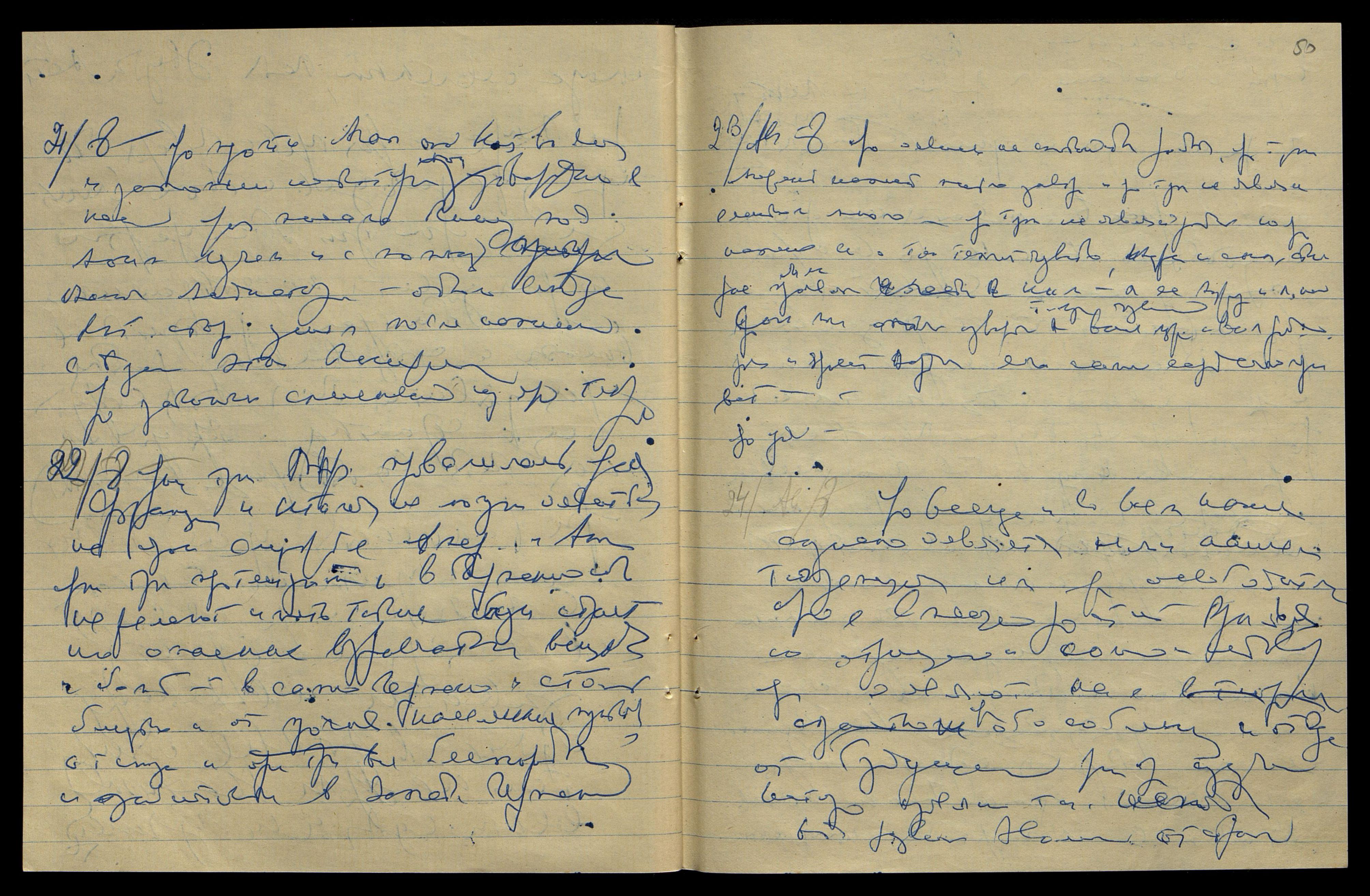 22/8. Ярая тут Конф[еренция] провалилась. Ярая Франция и Италия не могут оявиться на ярой службе Амер[ике] и Анг[лии]. Ярые тут протестуют и в Германии, ибо не желают иметь такие базы страстно опасных взрывчатых веществ и бомб — в самой Германии и столь близко и от прочих населенных пунктов — отсюда и беспорядки и забастовки в Западной Германии.