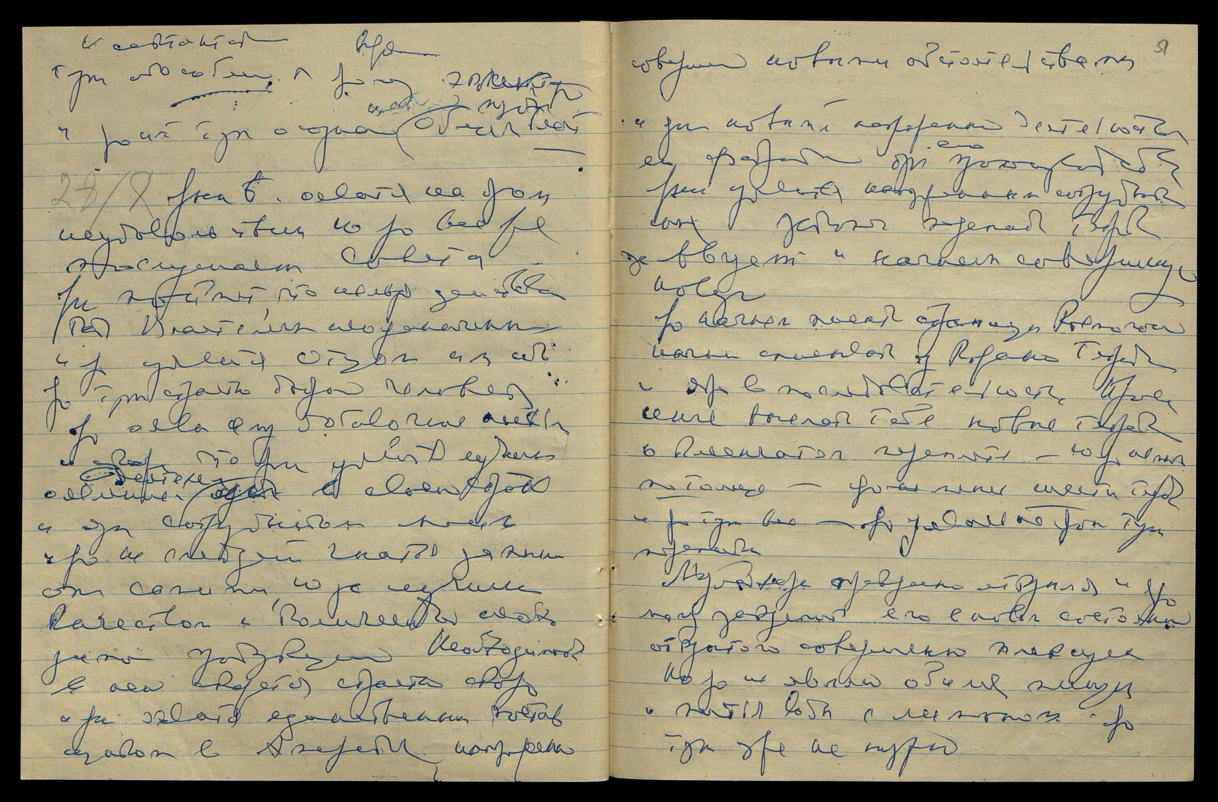 23/8. Яро оявись на спокойствии, родная, яро тут можешь написать письмо завтра и яро тут не являй слишком много. Яро тут не являй, родная, но яро напиши ей о той теплоте чувств мужа и сына, которые были проявлены к ним — к ее мужу и к ней. Сын мой [слово неразборчиво] луч[шие] чув[ства] к ваш[ему] мужу и вам, родная [слово неразборчиво], и просит передать его самый сердечный привет.