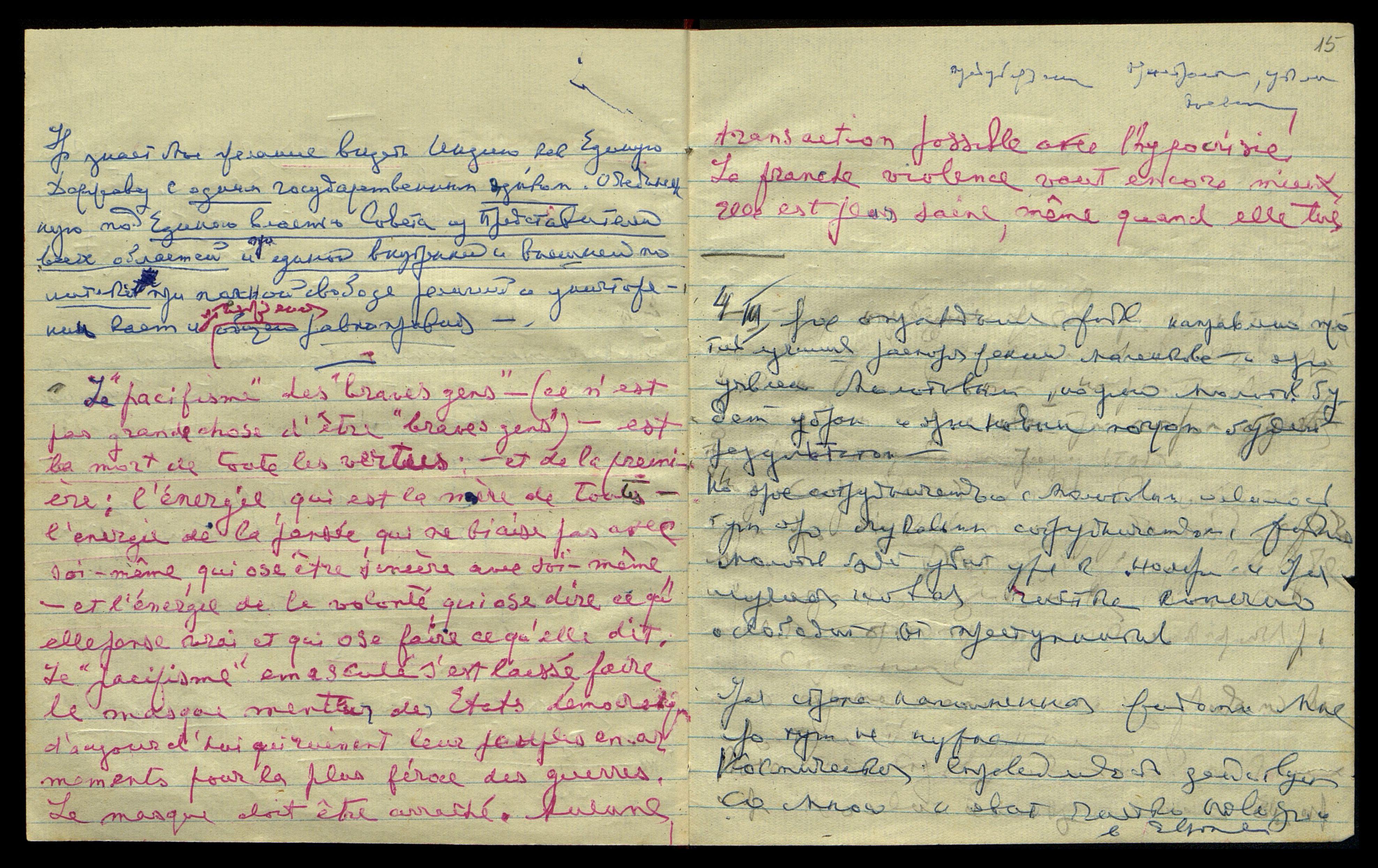 Le pacifisme les "braves gens" (ce n'est pas grande chosé d'être "braves gens") est la mort de toute des vertus et de la première: l'énergie, qui est la mère de toutes - l'énergie de la pensée, qui ne biaise pas avec soi - même, qui ose être sincère avec soi - même, et l'énergie de la volonté qui ose dire ce quelle ponse; et qui ose faire c'est quelle dit. Le pacifisme émasculés est laissé faire le masque mente des États démocratiques d'augourel sui quiruinant leur peuples en par moments pour la plus féroce des guerres. Le masque doit être arraché. Aucuns transaction possible avec l'hypocrisie! Le franche violence vote encore mieux ries est je saine même quand elle tus. [фр.: Пацифизм "храбрецов" (недорого стоит слыть "храбрецами") — гибель всех добродетелей, и первой — матери всех энергий, энергии мысли, честной и искренней с самим собой, и энергии воли, смеющей говорить, что думает, и делать, что говорит. Бессильный пацифизм — маска авгуров демократических государств, под которой они заставляют свои народы вести самые ожесточенные войны. Маску надо сорвать. Никакого сотрудничества с лицемерием! Откровенное насилие, даже молчаливое, смеется над здравым умом, даже когда оно убивает.]