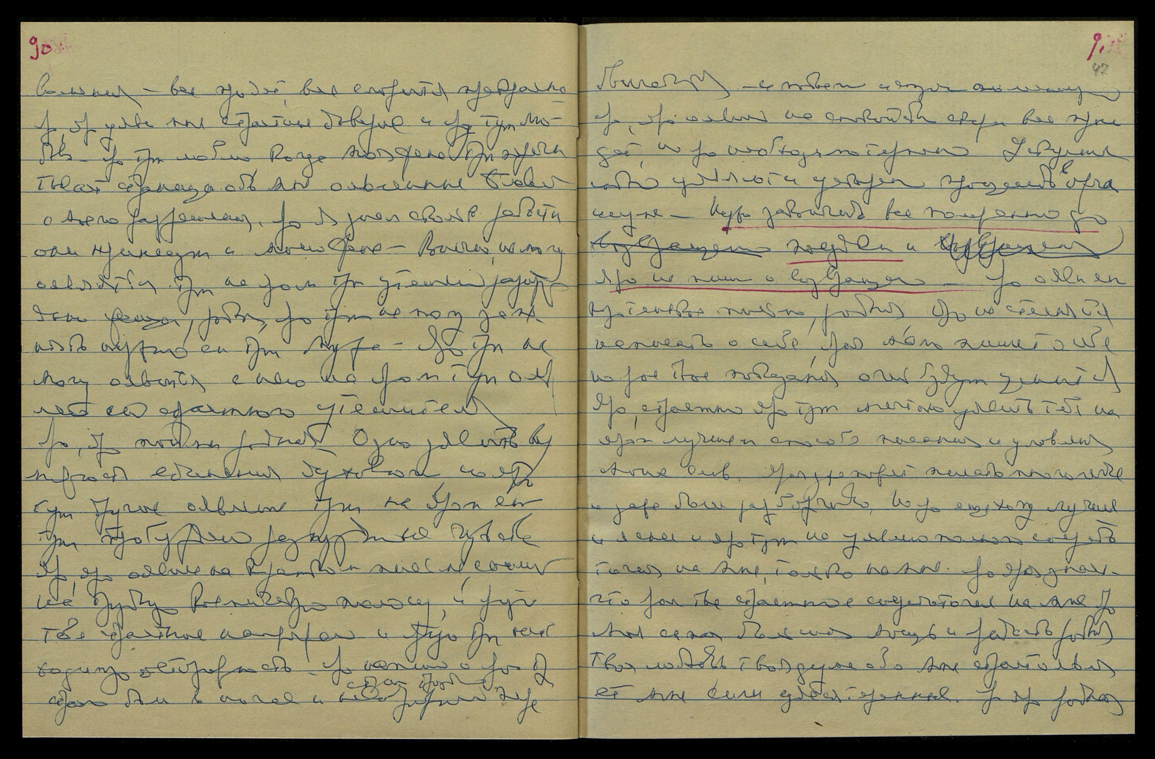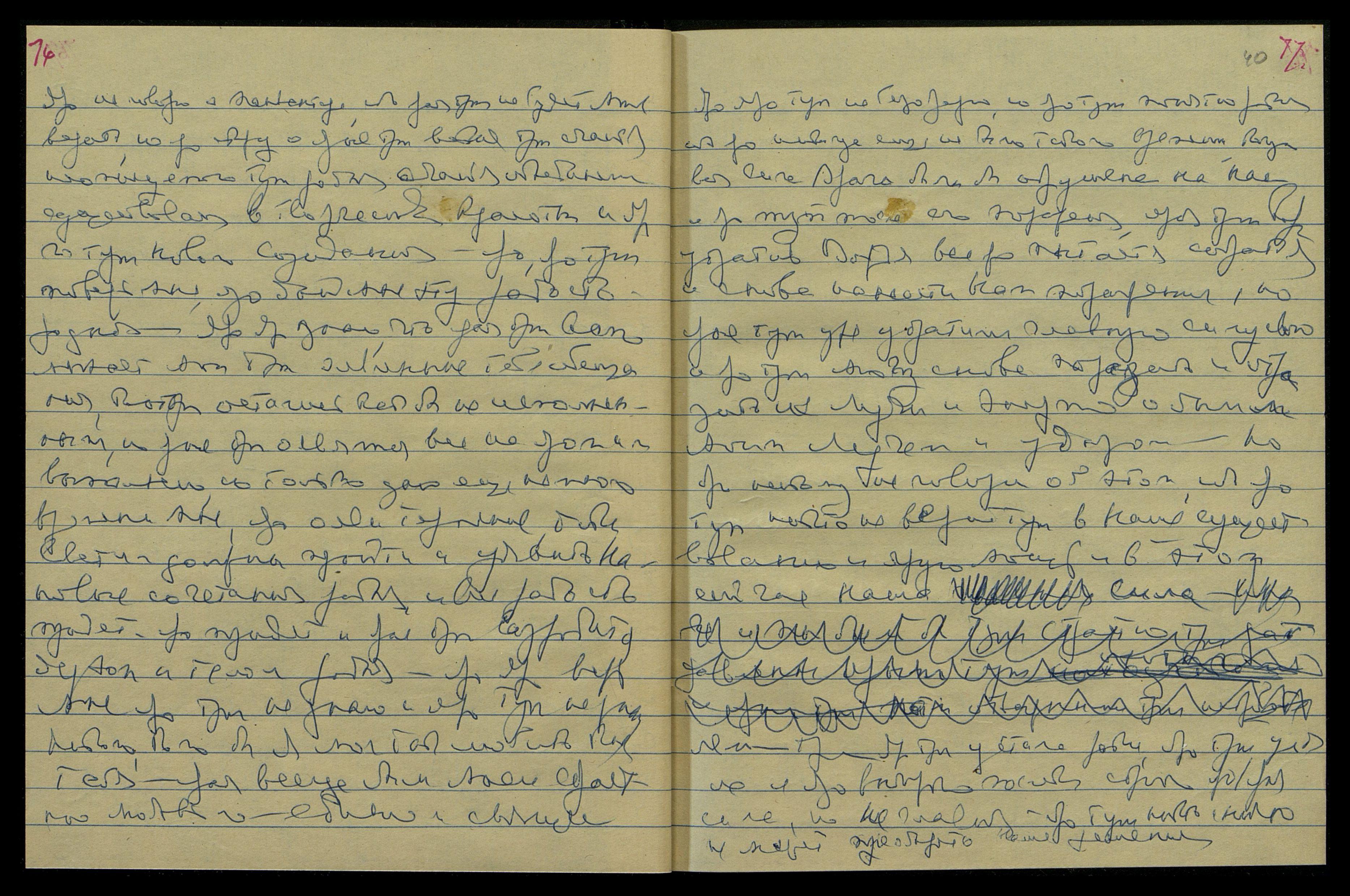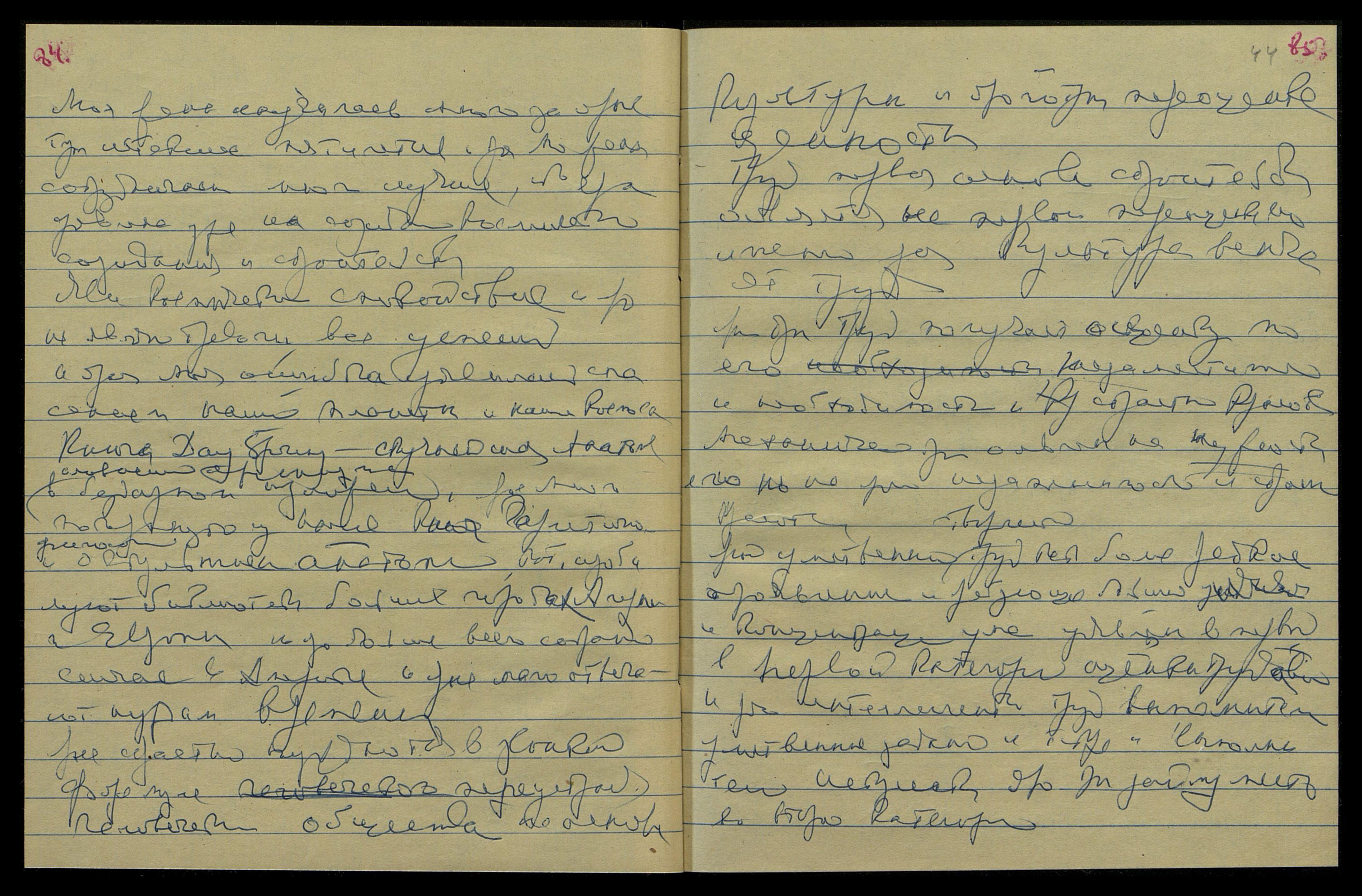 Яро, яро оявись на кратком письме, сошлись на трудную космическую полосу и ярое тебе страстное напряжение и ярую тут необходимую осторожность. Яро напиши о ярой тут страстной боли в ногах и невозможности* передвигаться и подъем[а] и спуск[а] по лестнице.