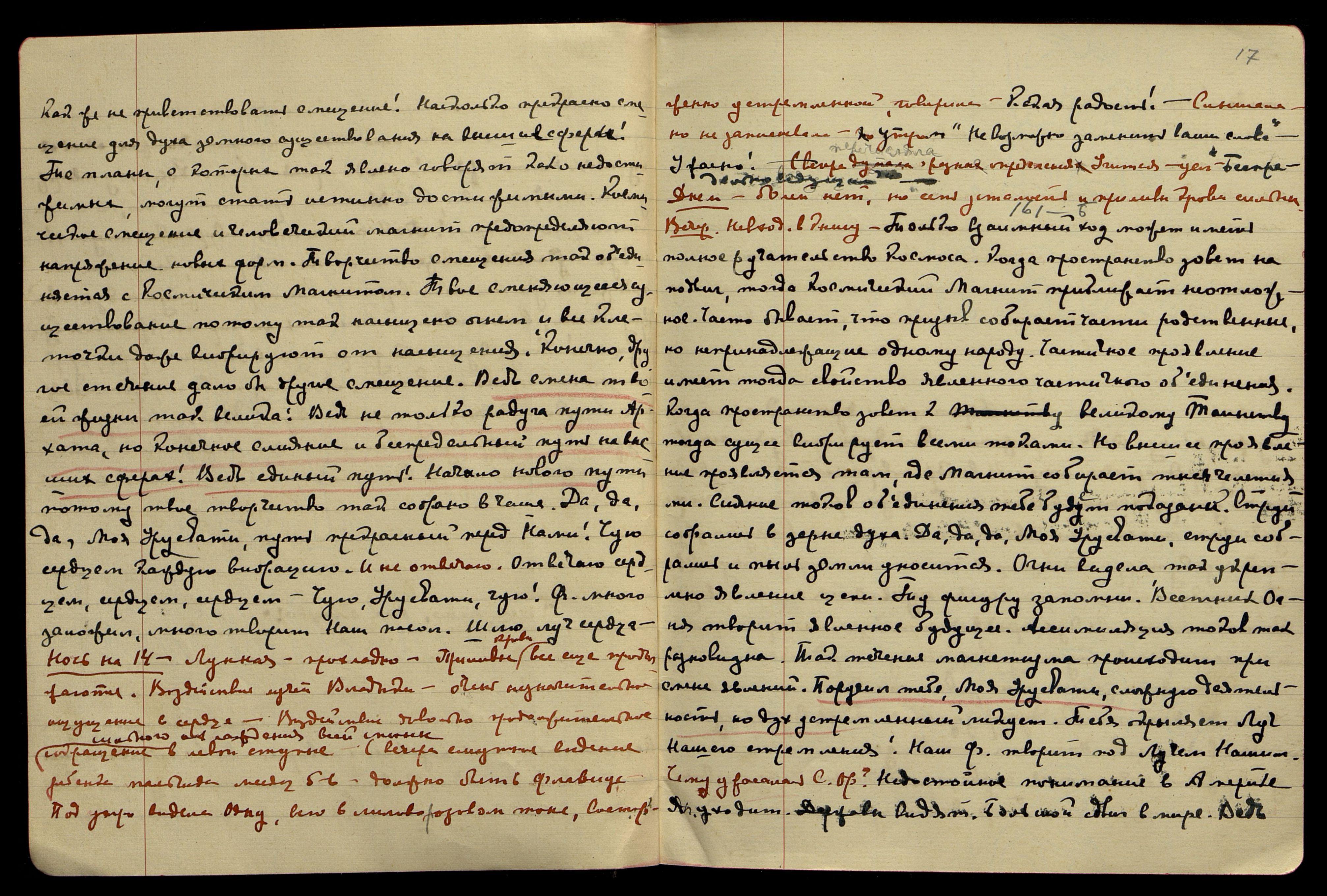 Ночь на 14 [сентября]. Лунная, прохладно. Приливы крови всё ещё продолжаются. Воздействия лучей Владыки очень незначительны, ощущение в сердце. Воздействие, довольно продолжительное, сильного охлаждения всей спины, сокращение в левой ступне. С вечера смутное видение ребёнка − мальчика месяц[ев] 5-6. Должно быть, Флавиус. Под утро видела Ояну, всю в лилово-розовом тоне, восторженно устремлённой, говорила: "Какая радость!" Слышала, но не записывала, утром: "Невозможно заменить ваши слова. − Ужасно!" С вечера перечисляла разные определения Учителя, усл[ышала]: "Беспредельно идущий".