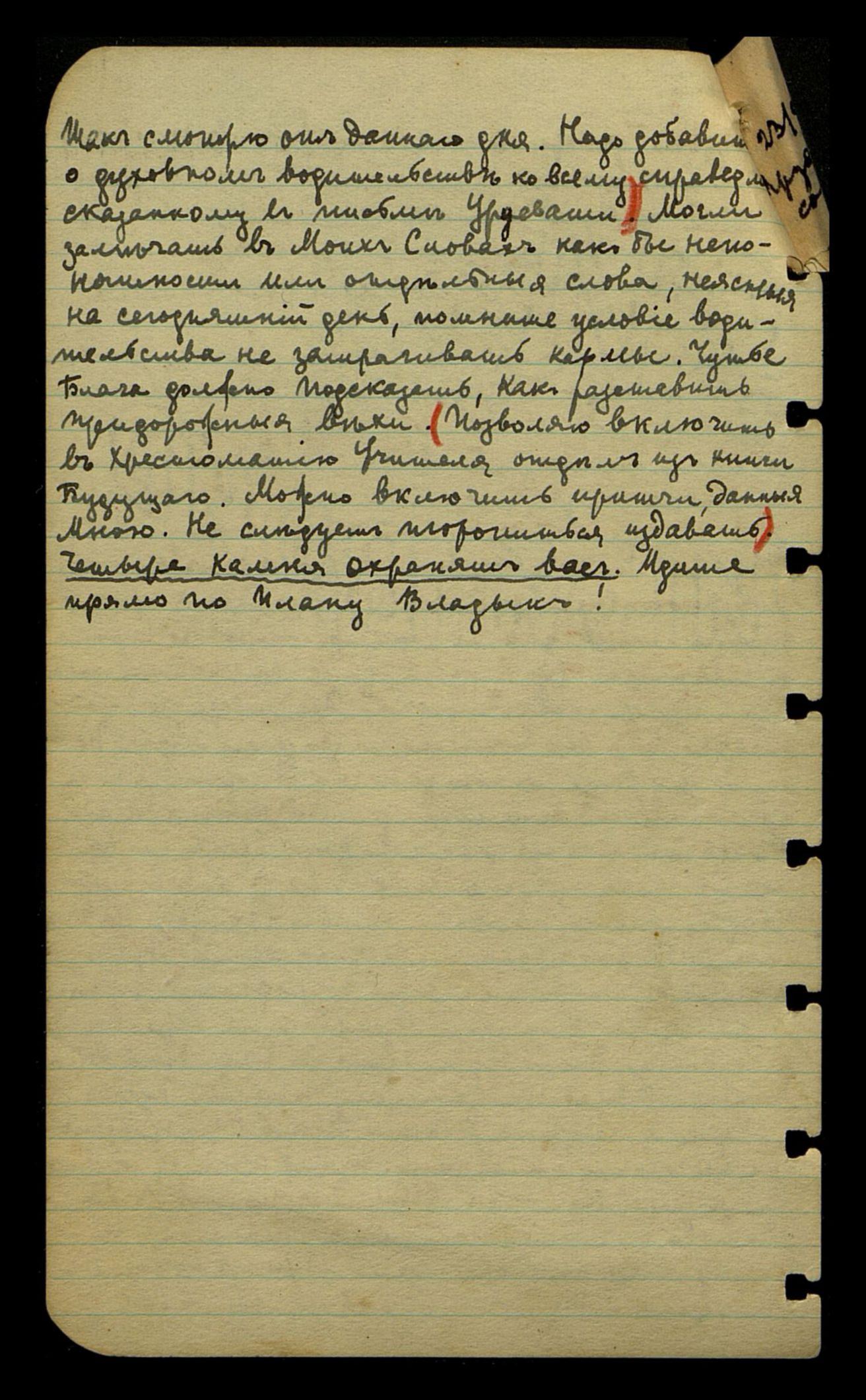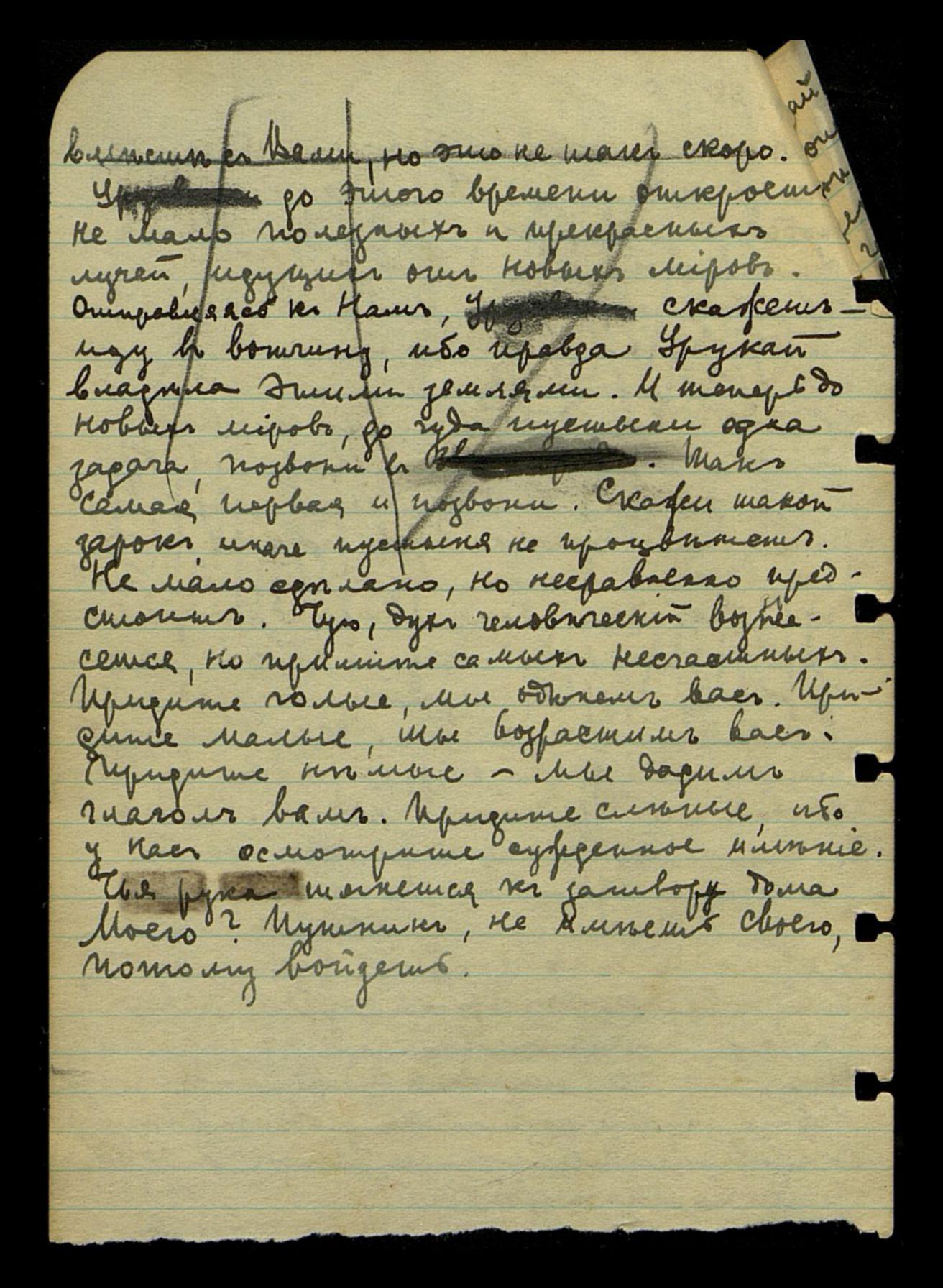 вместе с Вами, но это не так скоро. Урусвати до этого времени откроет немало полезных и прекрасных лучей, идущих от новых миров. Отправляясь к Нам, Урусвати скажет - иду в вотчину, ибо, правда, Урукай владела этими землями. И теперь до новых миров, до чуда пустыни одна задача, позвони в [стёрто слово "Звенигороде"]. Так самая первая и позвони. Скажи такой зарок, иначе пустыня не процветет. Не мало сделано, но несравненно предстоит. Чую, дух человеческий вознесется, но примите самых несчастных. Придите голые, мы оденем вас. Придите малые, мы возрастим вас. Придите немые, мы дадим глагол вам. Придите слепые, ибо у нас осмотрите сужденное имение. Чья рука тянется к затвору дома Моего? Путник, не имеешь своего, потому войдешь.