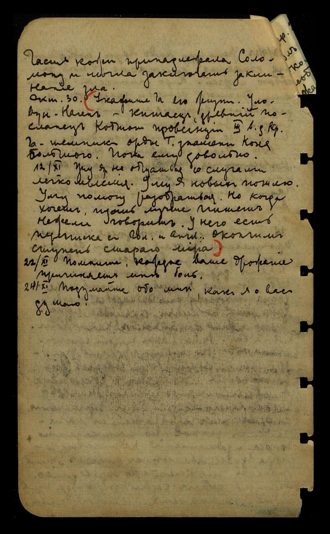 окт[ябрь] 30. Укажите Ча[хем Булле] его жизни. Уловци Начен – китаец, древний посланец Кобтот провинции, III в. до Р. Хр. Ча[хем Булла] – темник орды Т[амерлана] знамени Коня Большого. Пока ему довольно.