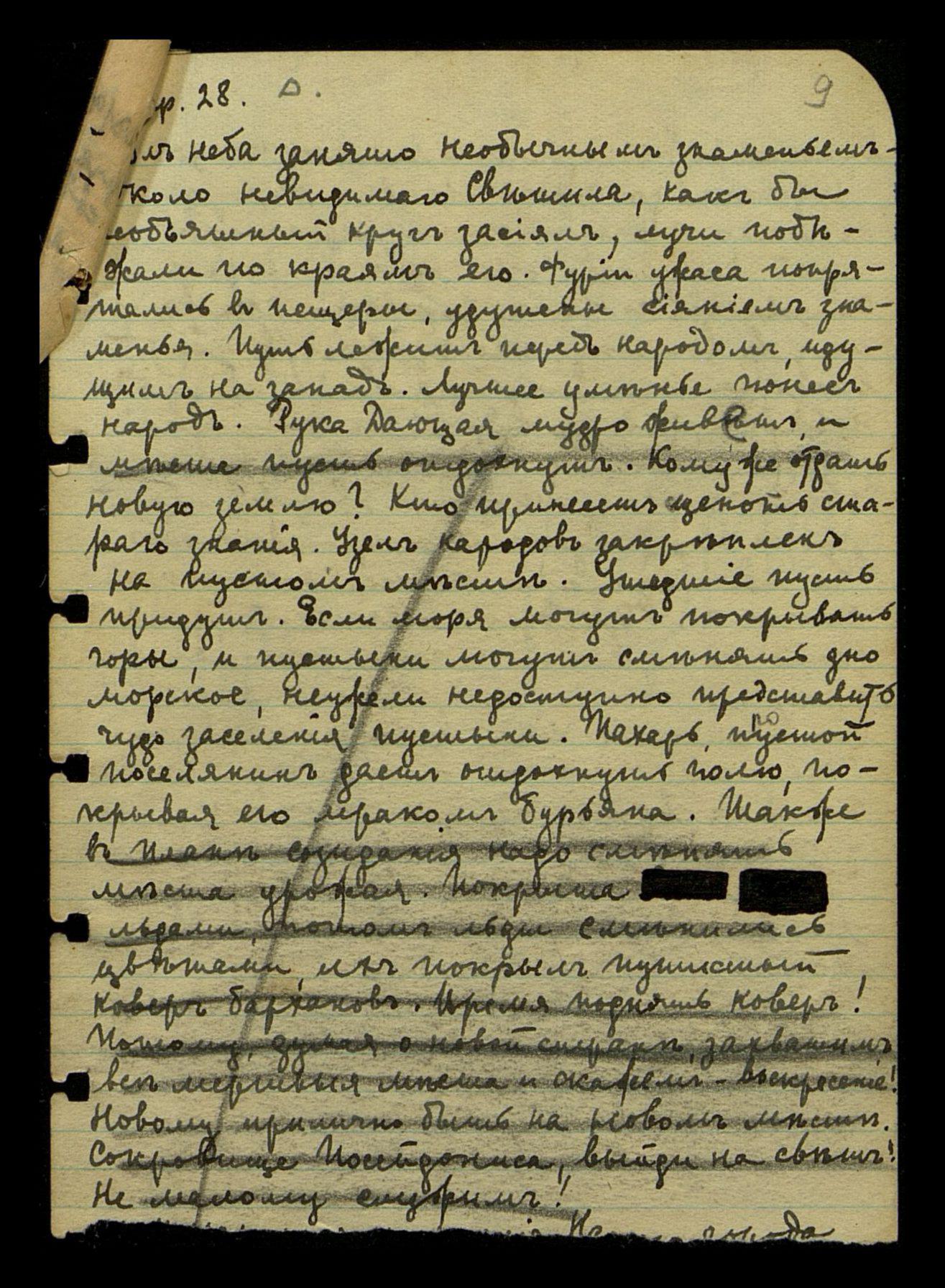 Покрыта [несколько слов стёрто] льдами, потом льды сменились цветами, их покрыл пушистый ковёр барханов. Время поднять ковёр! Потому, думая о новой стране, захватим все мёртвые места и скажем - воскресение! Новому прилично быть на новом месте. Сокровище Посейдониса, выйди на свет! Не малому служим!
