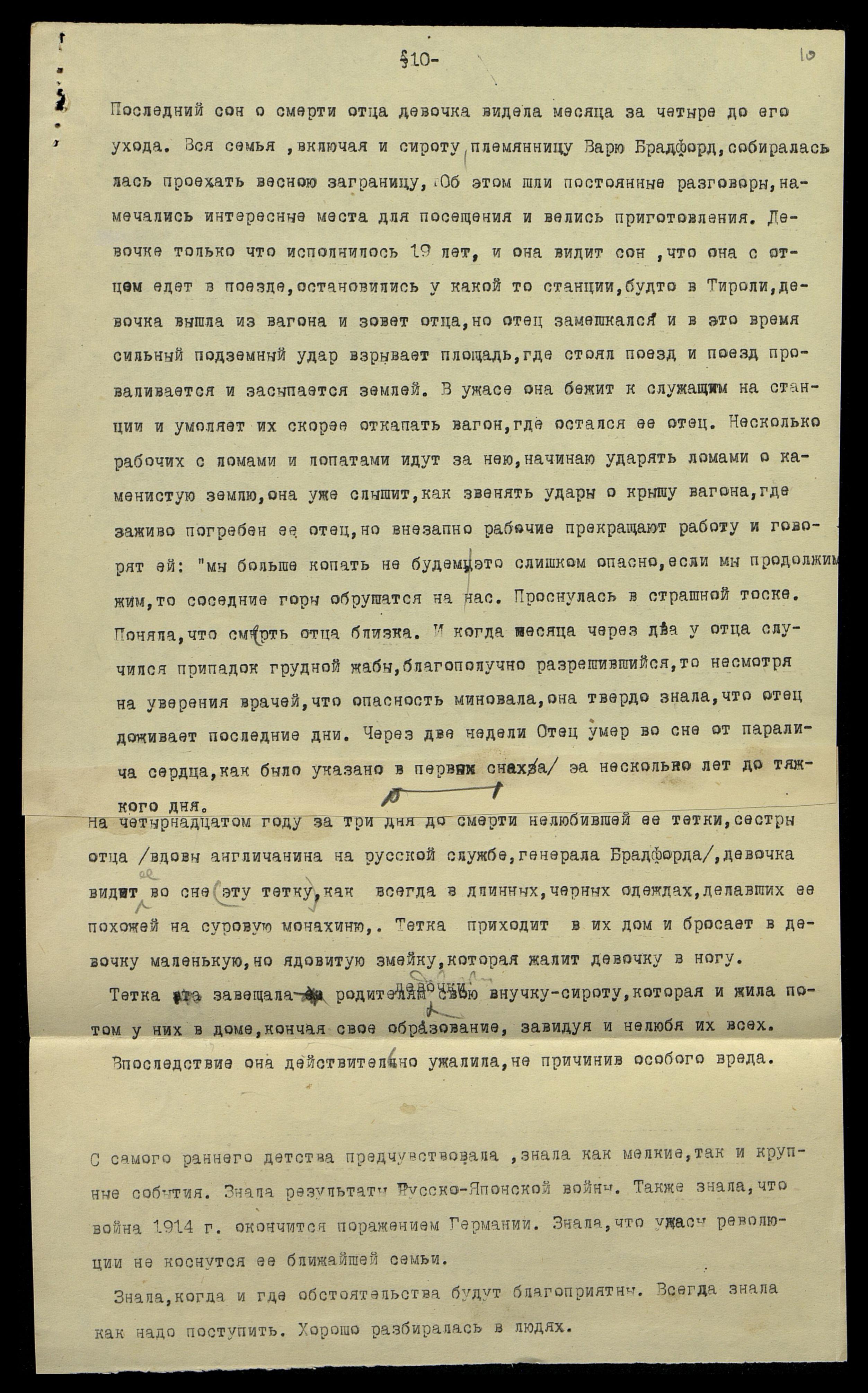 Последний сон о смерти отца девочка видела месяца за четыре до его ухода. Вся семья, включая и сироту, племянницу Варю Брадфорд, собиралась поехать весною за границу. Об этом шли постоянные разговоры, намечались интересные места для посещения и велись приготовления. Девочке только что исполнилось 19 лет, и она видит сон, что она с отцом едет в поезде, остановились у какой-то станции, будто в Тироле, девочка вышла из вагона и зовет отца, но отец замешкался, и в это время сильный подземный удар взрывает площадь, где стоял поезд, и поезд проваливается и засыпается землей. В ужасе она бежит к служащим на станции и умоляет их скорее откопать вагон, где остался ее отец. Несколько рабочих с ломами и лопатами идут за нею, начинают ударять ломами о каменистую землю, она уже слышит, как звенят удары о крышу вагона, где заживо погребен ее отец, но внезапно рабочие прекращают работу и говорят ей: "Мы больше копать не будем, это слишком опасно, если мы продолжим, то соседние горы обрушатся на нас". Проснулась в страшной тоске. Поняла, что смерть отца близка. И когда месяца через два у отца случился припадок грудной жабы, благополучно разрешившийся, то, несмотря на уверения врачей, что опасность миновала, она твердо знала, что отец доживает последние дни. Через две недели отец умер во сне от паралича сердца, как было указано в первых снах, за несколько лет до тяжкого дня.