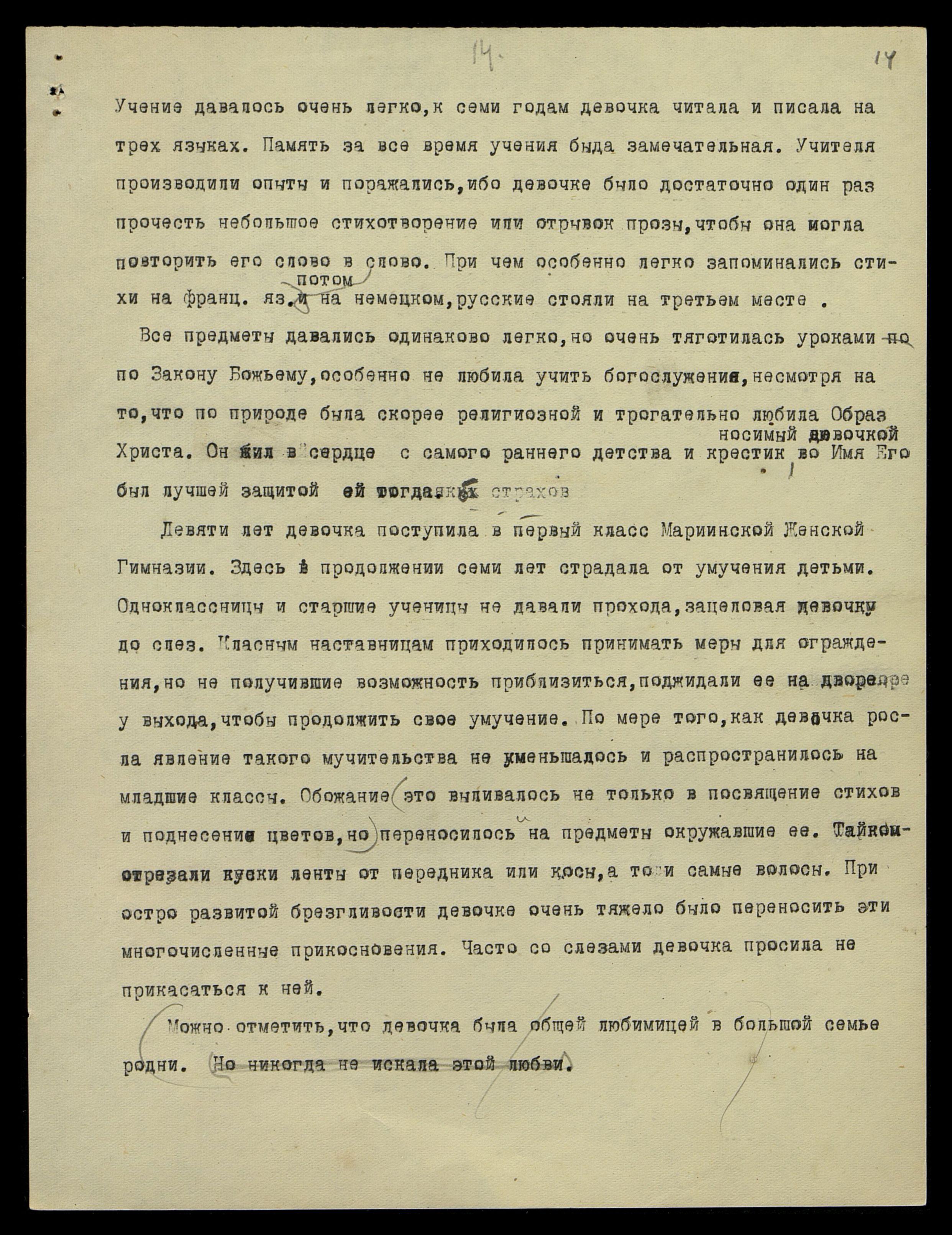 Учение давалось очень легко, к семи годам девочка читала и писала на трех языках. Память за все время учения была замечательная. Учителя производили опыты и поражались, ибо девочке было достаточно один раз прочесть небольшое стихотворение или отрывок прозы, чтобы она могла повторить его слово в слово. Причем особенно легко запоминались стихи на французском яз[ыке], потом на немецком, русские стояли на третьем месте.