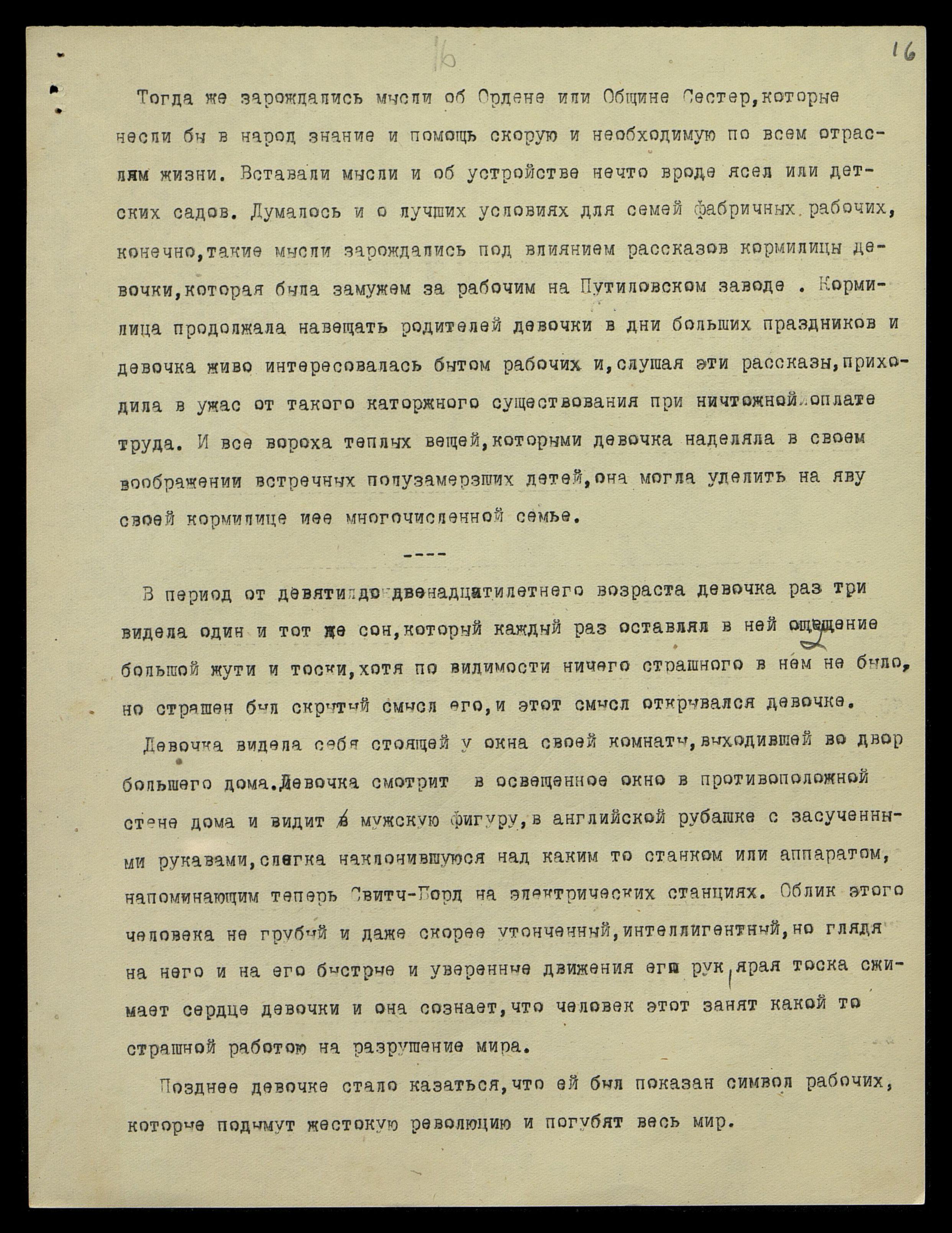 Тогда же зарождались мысли об Ордене или Общине Сестер, которые несли бы в народ знание и помощь скорую и необходимую по всем отраслям жизни. Вставали мысли и об устройстве нечто вроде ясель или детских садов. Думалось и о лучших условиях для семей фабричных рабочих; конечно, такие мысли зарождались под влиянием рассказов кормилицы девочки, которая была замужем за рабочим на Путиловском заводе. Кормилица продолжала навещать родителей девочки в дни больших праздников, и девочка живо интересовалась бытом рабочих и, слушая эти рассказы, приходила в ужас от такого каторжного существования при ничтожной оплате труда. И все вороха теплых вещей, которыми девочка наделяла в своем воображении встречных полузамерзших детей, она могла уделить наяву своей кормилице и ее многочисленной семье.