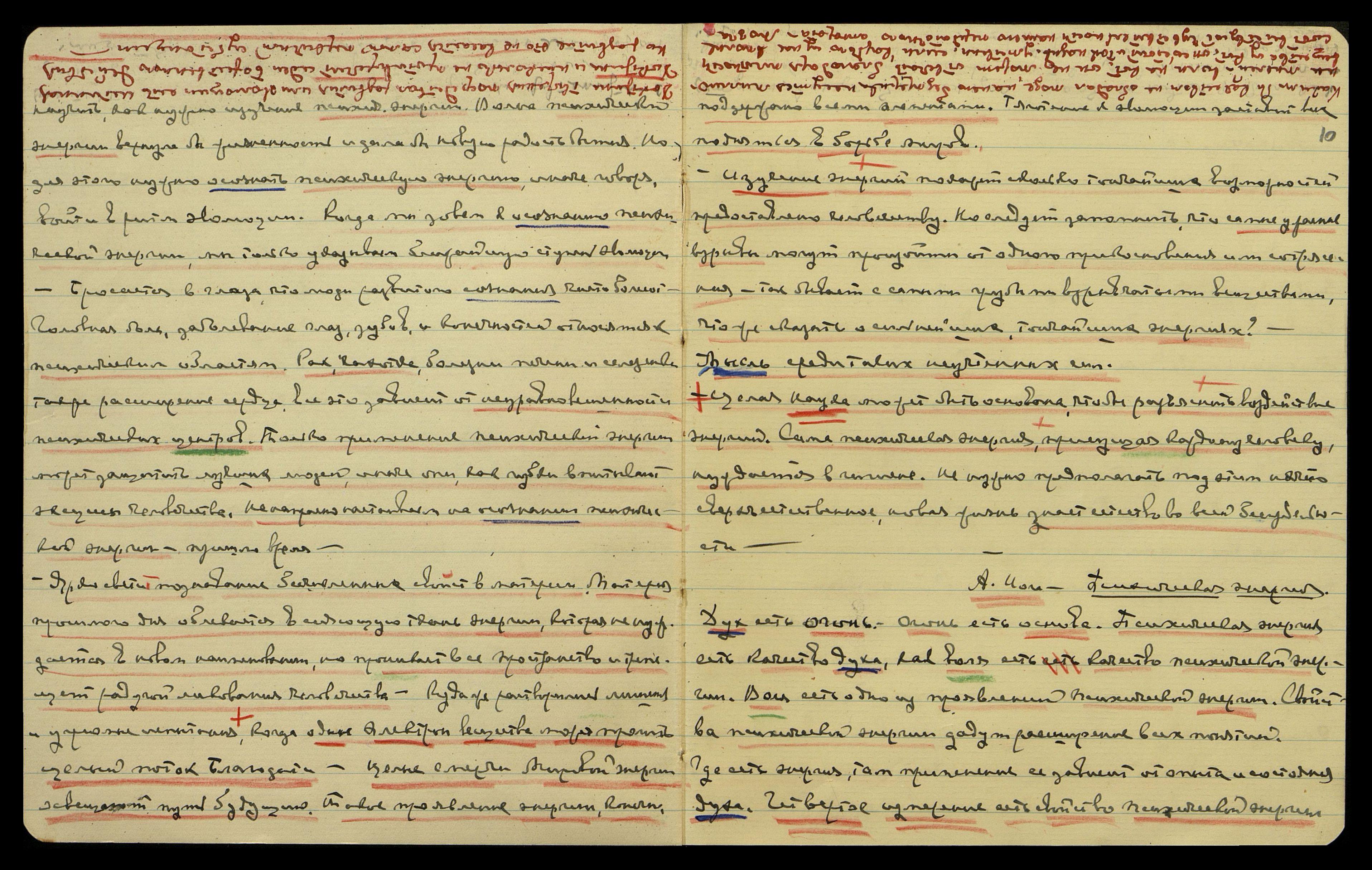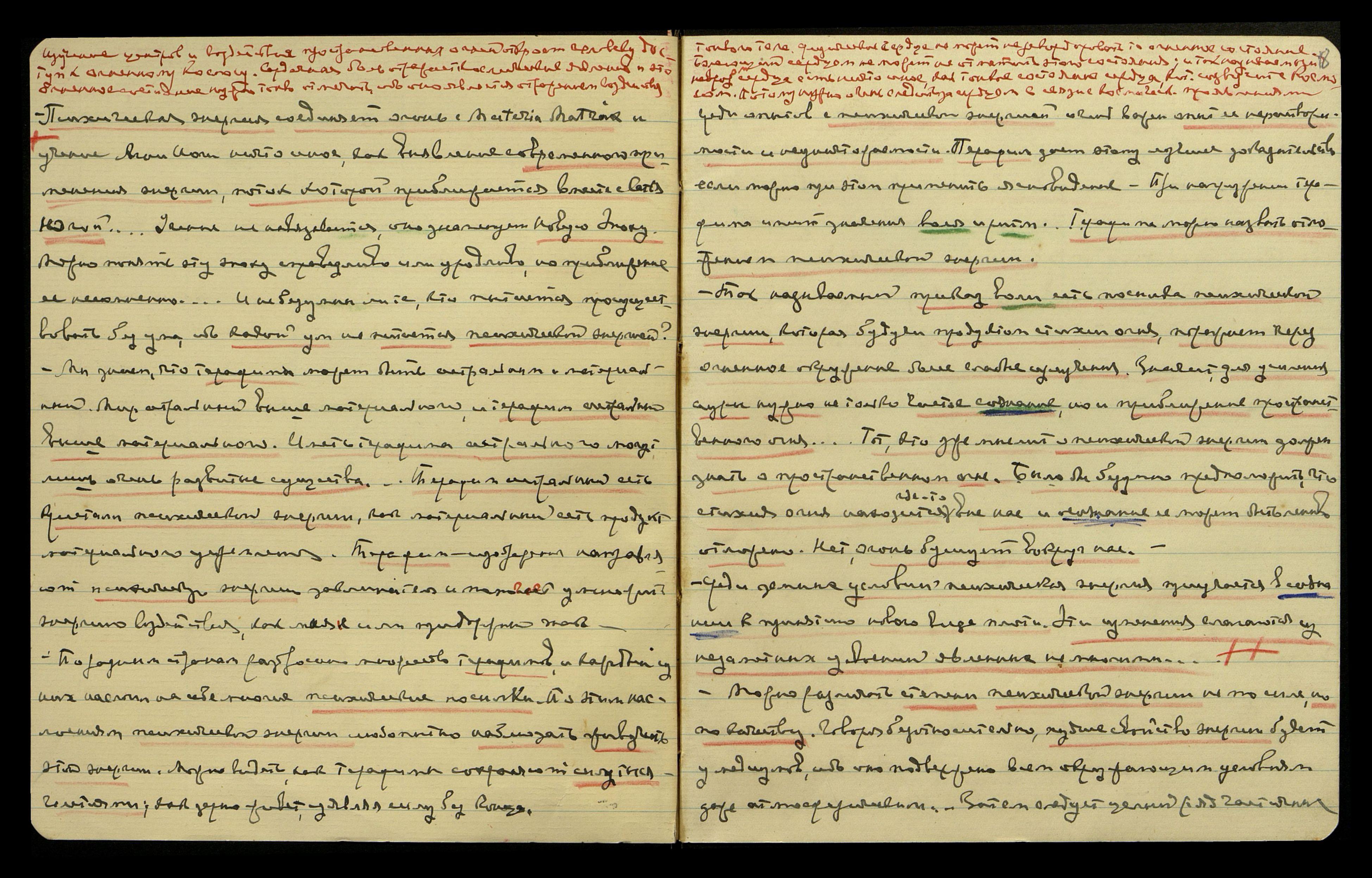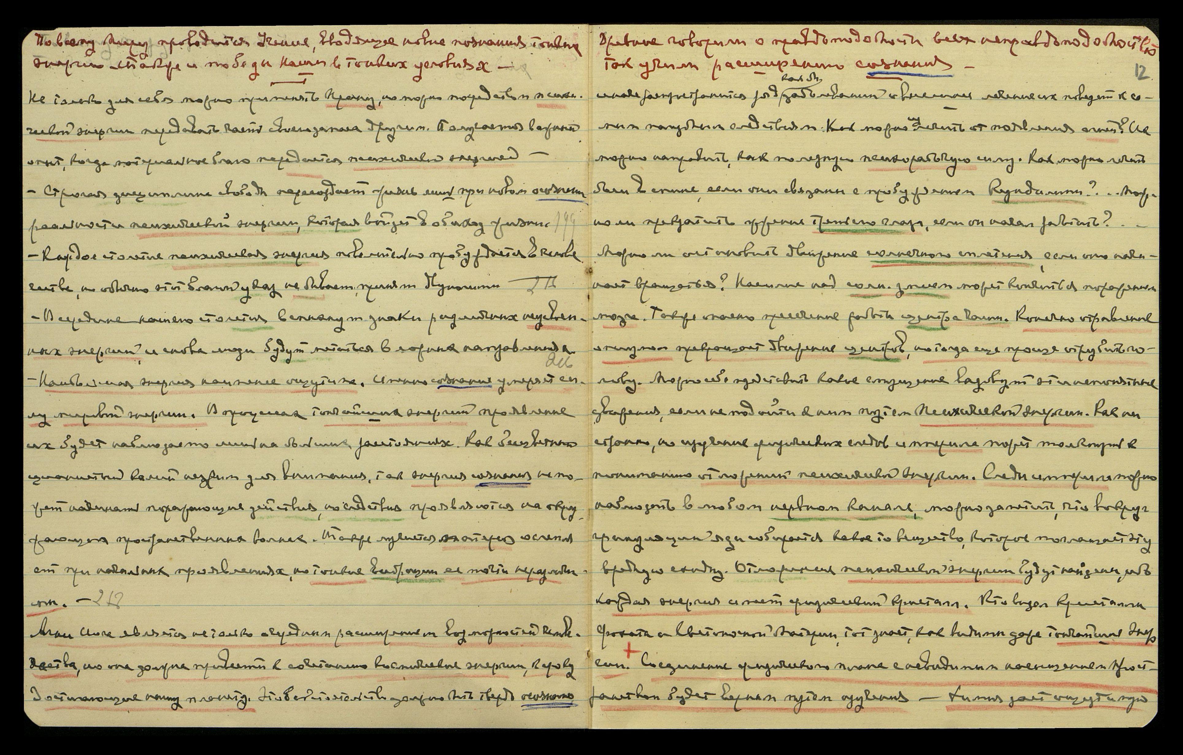 На верхнем поле правой страницы разворота написано: "Если бы наука углубилась в изыскания огненных атомов, кот[орые] служат жизнедателями каждому явлению, то можно было бы найти столько основных причин. Но каждое изыскание требует, чтобы явление самого насущного было утверждено, ибо устремлённые изыскания должны дойти до огненного атома. Изучая лишь внешние следы различных воздействий, невозможно достичь огненных решений".