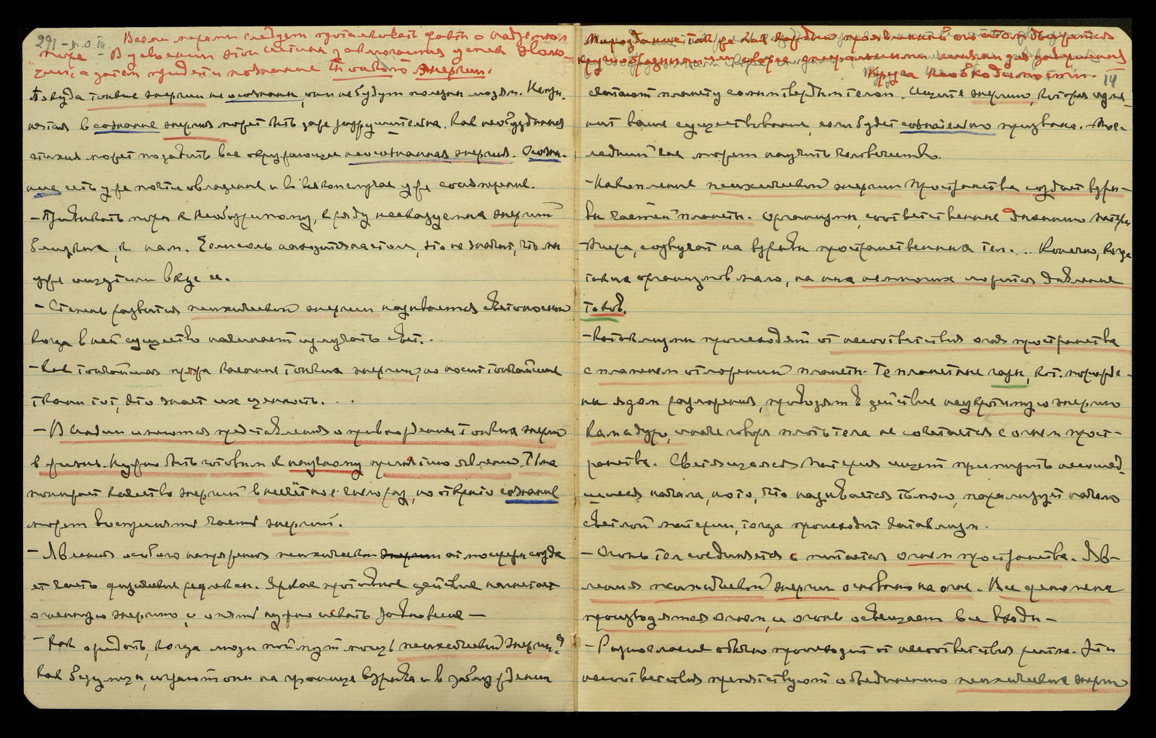 На верхнем поле левой страницы разворота написано: "291 − М[мир] О[гненный] III. "Всеми мерами следует проталкивать факты о надземном мире. В усвоении этой истины заключается успех эволюции, а затем придёт и познание тонкой энергии".