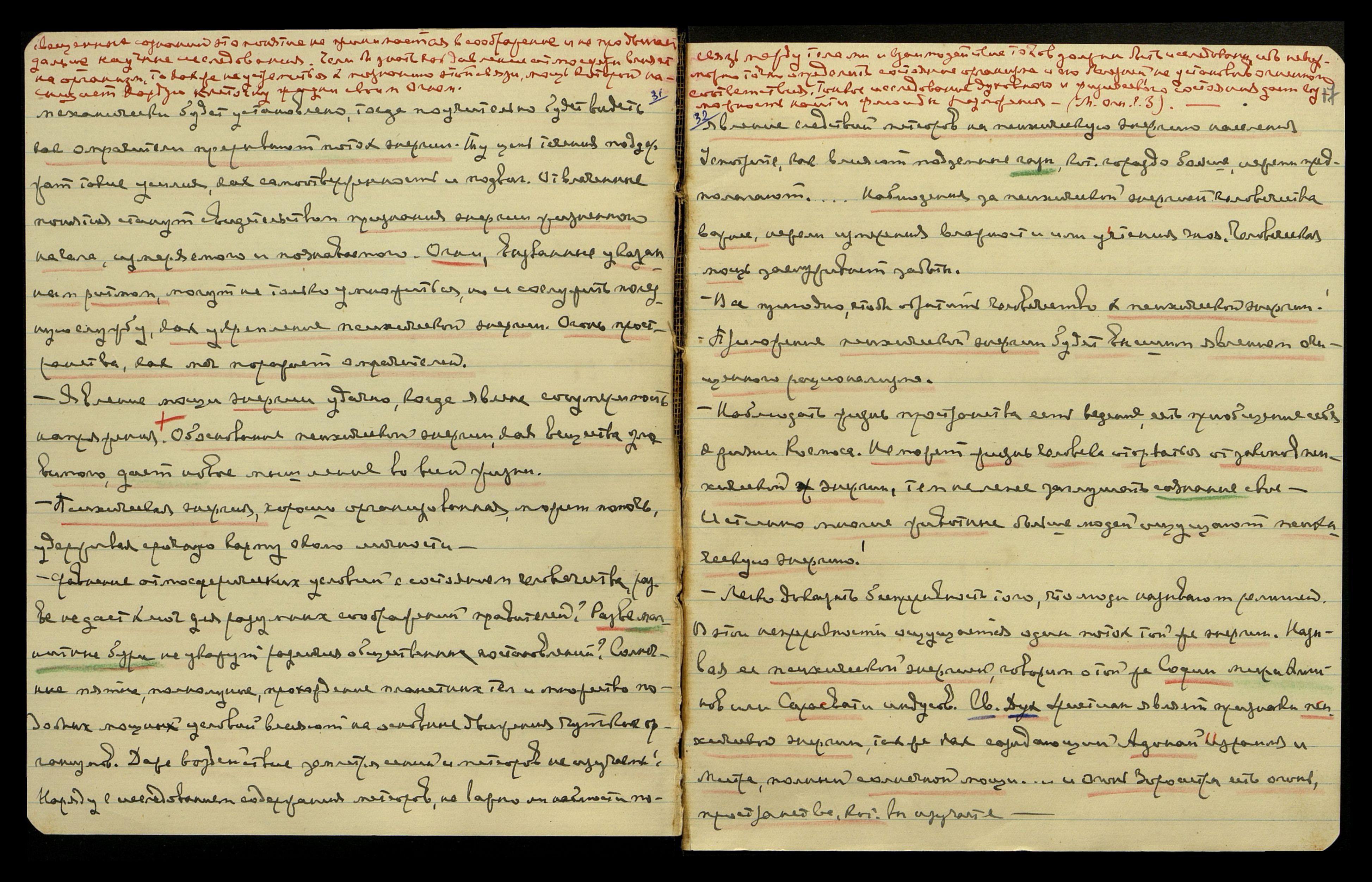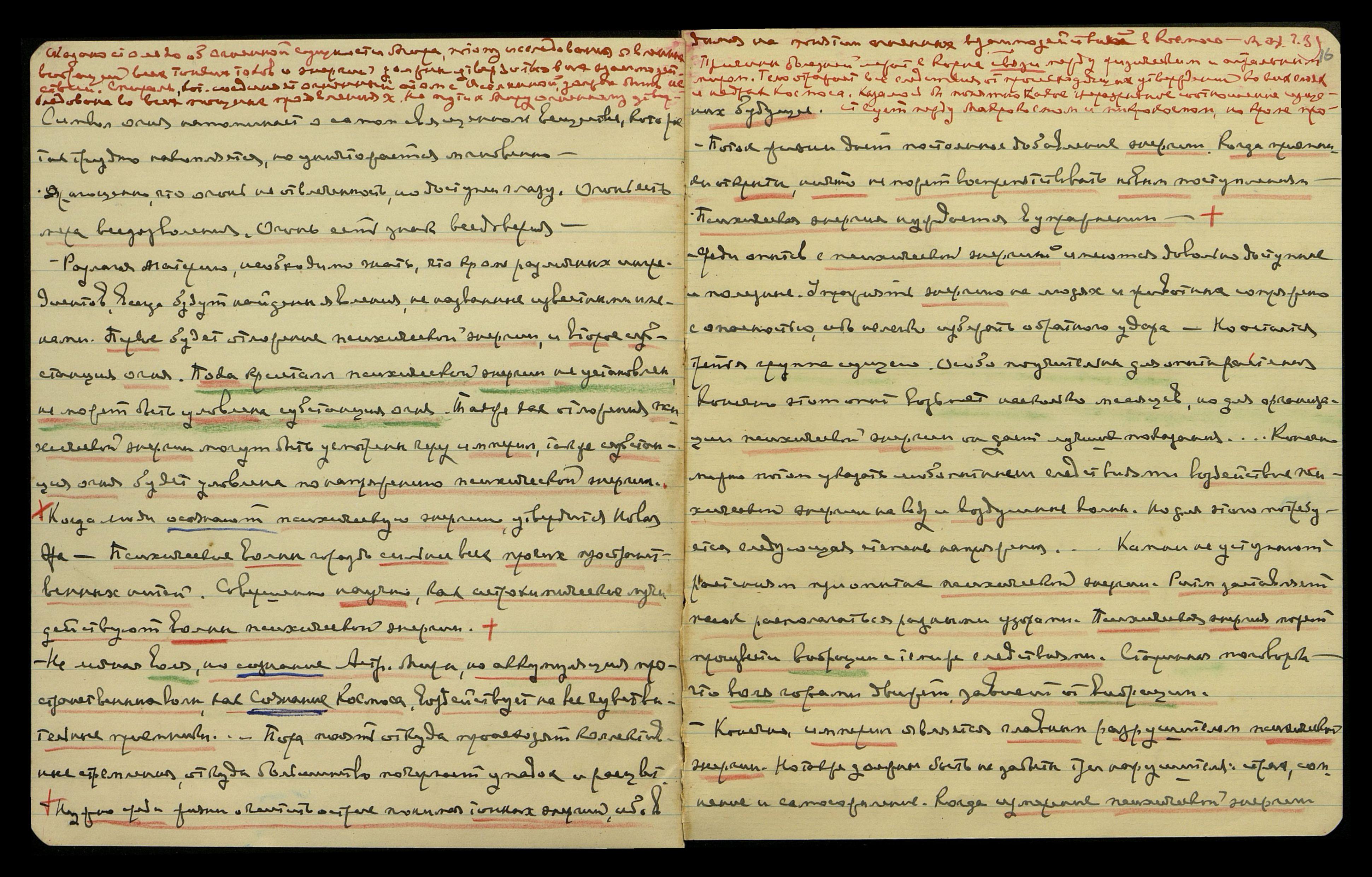 На верхнем поле правой страницы разворота написано: "тонкого тела. Физическое сердце не может не рекордировать то огненное состояние. Болеющий сердцем не может не отметить этого состояния, и так называемый невроз сердца есть ничто иное как тонкое состояние сердца, которое созвучит с Космосом. Потому нужно очень следить за сердцем в связи с Космическими проявлениями".