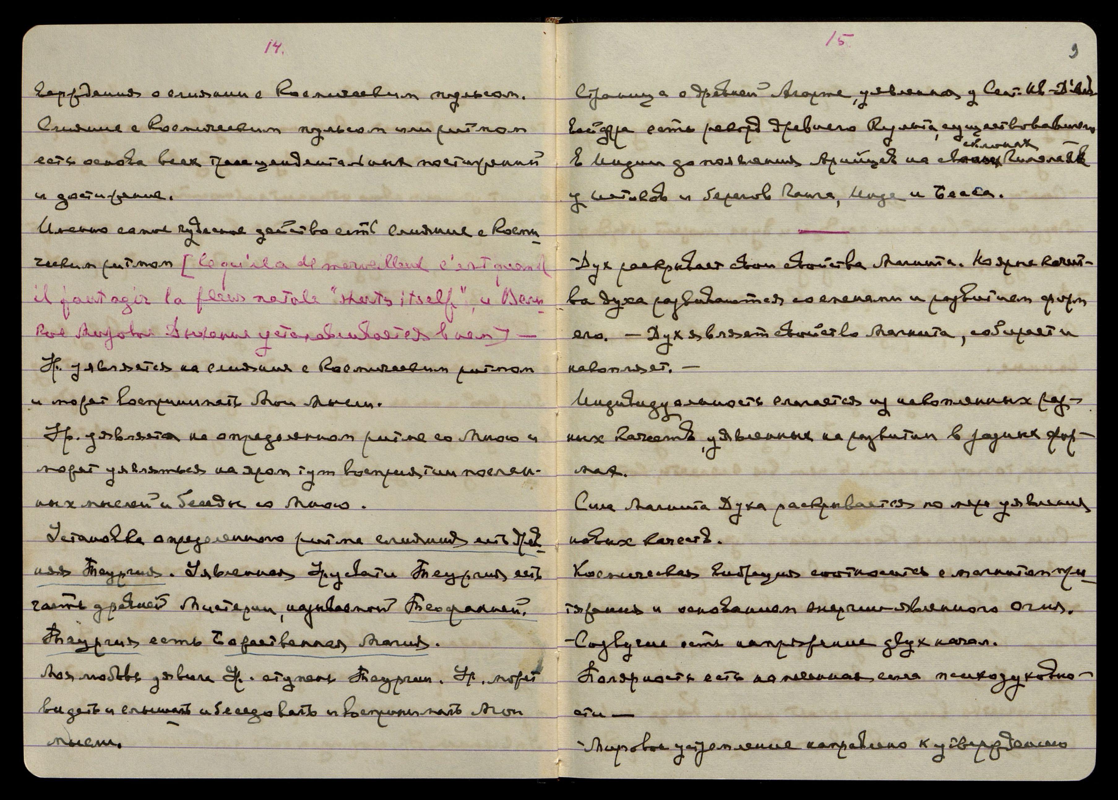 Урусвати имеет тут уже величайшее достижение - открытие Агни Йоги. Ступень яснослышания была временно на несколько лет заменена передачей мысленной, постоянной беседы. Яснослышание на протяжении всемирной войны оявляется редко и кратко. Передача мысли на первой ступени сопровождалась сильным напряжением в голове, ощущением сильного вращения центров головных. По мере усиления и развития процесса передачи мысли ощущение вращения центров стало уменьшаться и являлось только при начале передачи, но потом это ощущение почти прекратилось. Вращение иногда замечалось при особо сильной и быстрой передаче. Также и напряжение в голове и следующие за ним частые взрывы, или разряды, стали слабее - яснослышание снова усилилось.