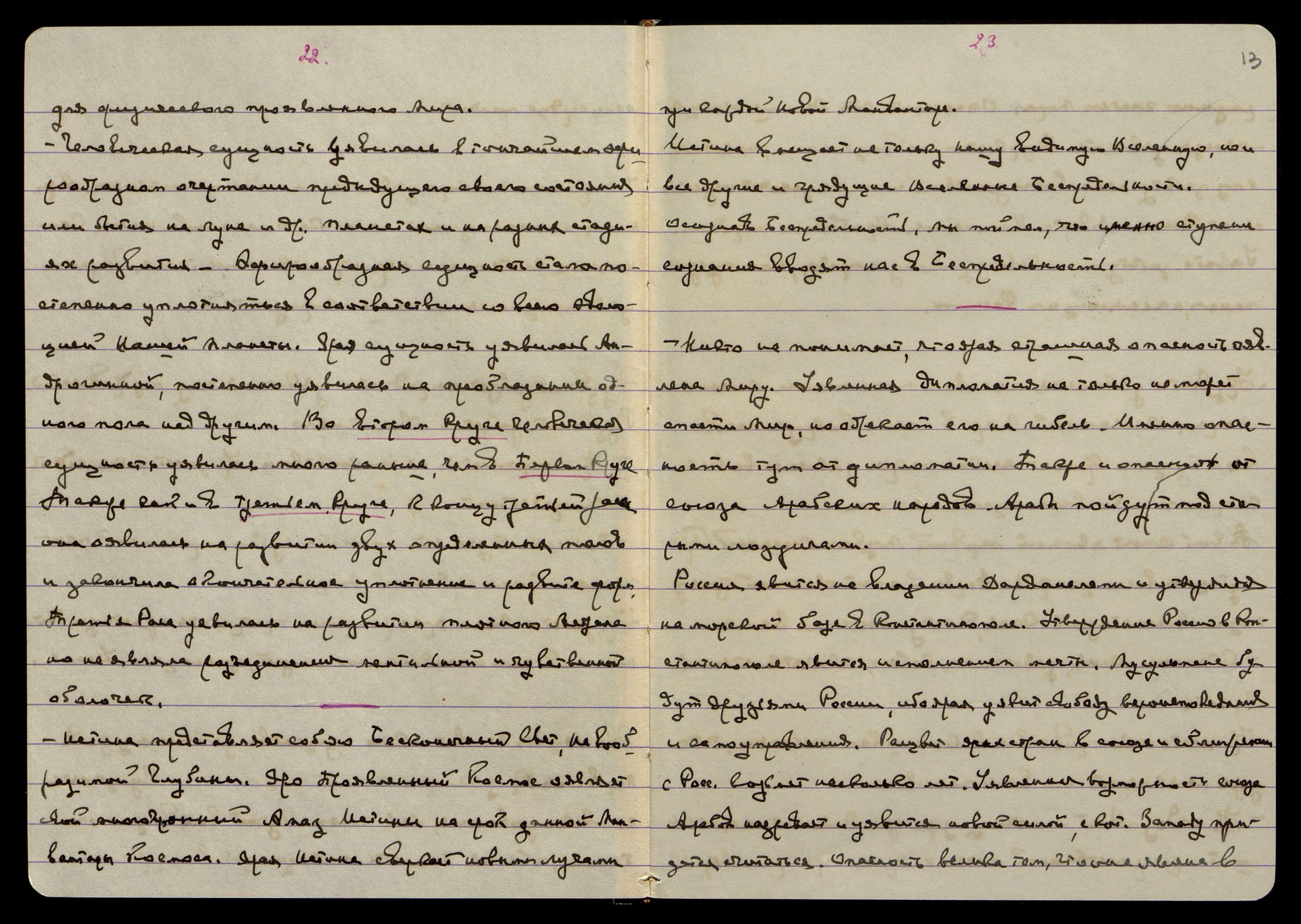 Россия явится на владении Дарданеллами и утвердится на морской базе в Константинополе. Утверждение России в Константинополе явится исполнением мечты. Мусульмане будут друзьями России, ибо ярая уявит свободу вероисповедания и самоуправления. Расцвет ярых стран в союзе и сближении с Росс[ией] возьмёт несколько лет. Уявленная возможность союза Арабов назревает и уявится новой силой, с кот[орой] Западу придётся считаться. Опасность велика тем, что она явлена в