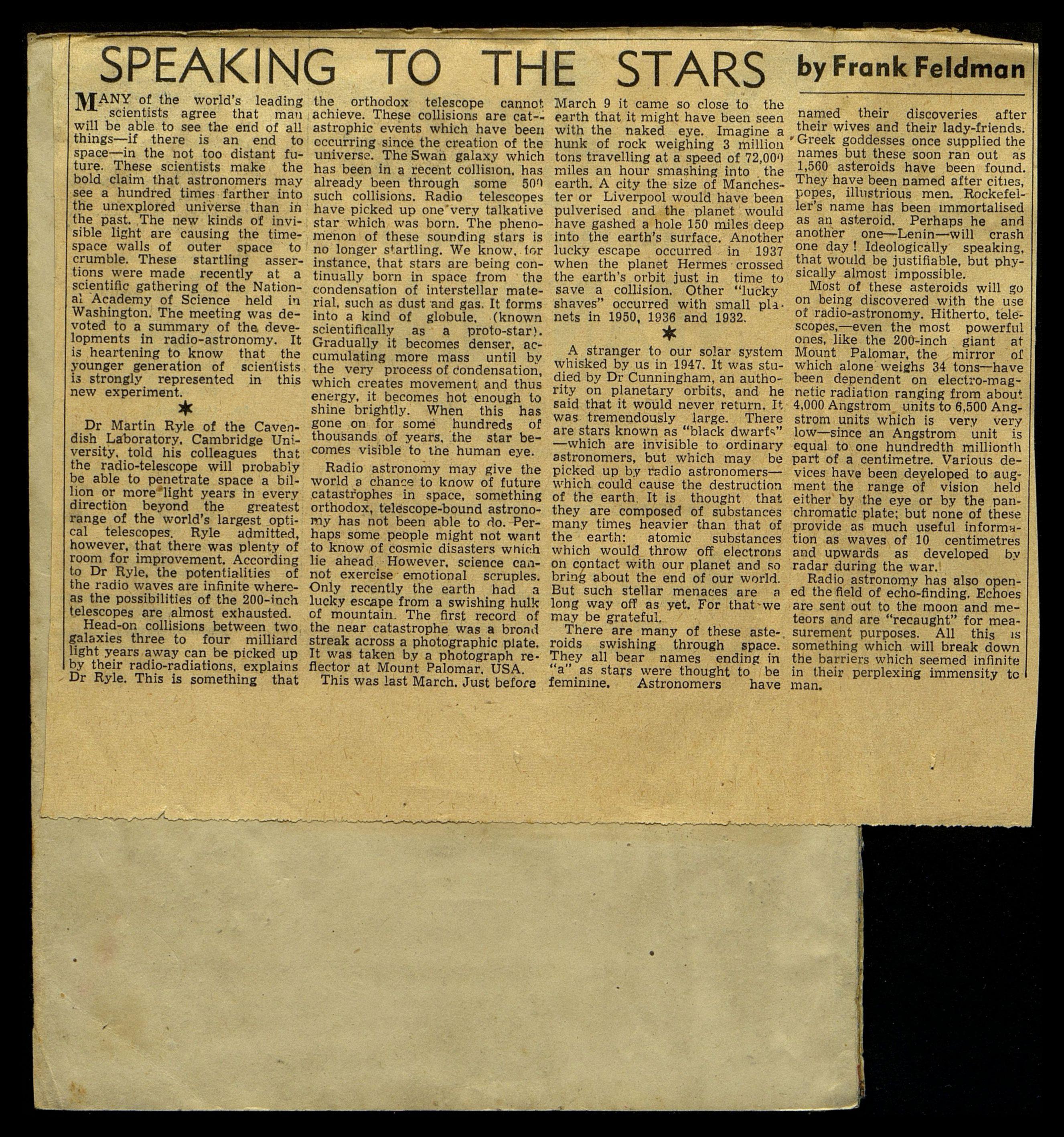 Radio astronomy may give the world a chance to know of future catastrophes in space, something orthodox, telescope-bound astronomy has not been able to do. Perhaps some people might not want to know of cosmic disasters which lie ahead However, science cannot exercise emotional scruples. Only recently the earth had a lucky escape from a swishing hulk of mountain. The first record of the near catastrophe was a broad streak across a photographic plate. It was taken by a photograph reflector at Mount Palomar. USA.