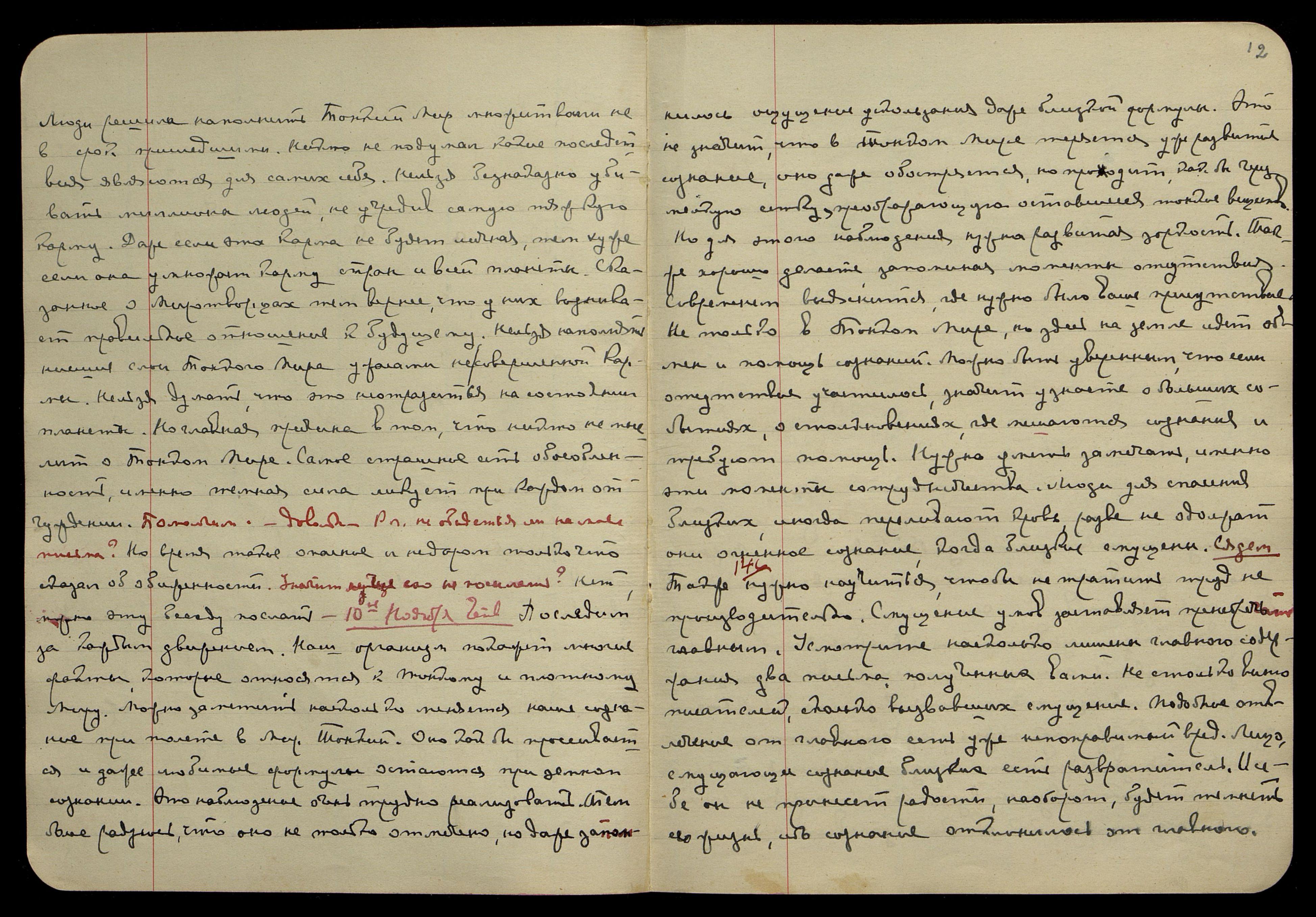 14-ое ноября, понед[ельник]. § 158. Психическая энергия, иначе говоря, огненная энергия, или Агни, явлена в каждом живом существе. Каждый человек может различить в себе элементы плотные, тонкие и огненные. Там, где мы чувствуем проявление психической энергии, там уже область огненная. Из этих осколков можно складывать целое огненное миропонимание. Каждый, при внимательном наблюдении за рефлексами его бытия, может усмотреть множество характеристик огненного обихода. Это нужно замечать, ибо таким образом мы перестаём понимать Огненный Мир как нечто отвлечённое. Такое понимание Огненного Мира особенно пагубно, но и все отвлечённые толкования не помогут эволюции. Теперь др[угое]. § 159. Можно отличить среди наших свойств черты Тонкого Мира. Они не всегда будут касаться психической энергии, но многие воспоминания, многие природные отвращения и склонности могут быть продуктами Тонкого Мира. Также и воспоминания о каких-то невиданных лицах или местностей могут быть не из Плотного Мира. Теперь др[угое]. § 160. Также можно на отдельных фактах познать Тонкий Мир как целое миросозерцание, но для этого нужна внимательность, иначе, утончённость − то, что называется культурностью. Сядем. Главное, нужно сохраниться в это переходное время. § 161. Вы правы, замечая, что именно внутреннее неблагополучие особенно губительно. Можно выиграть все процессы, можно встретить новых друзей, но внутреннее разложение может отогнать самого хорошего друга. Когда в воздухе пыль перца, все начинают чихать. Так империл может распространяться. Вы видели не раз, как подходили новые обстоятельства, но их нужно встретить. Так нужно, наконец, понять о заразе импе-