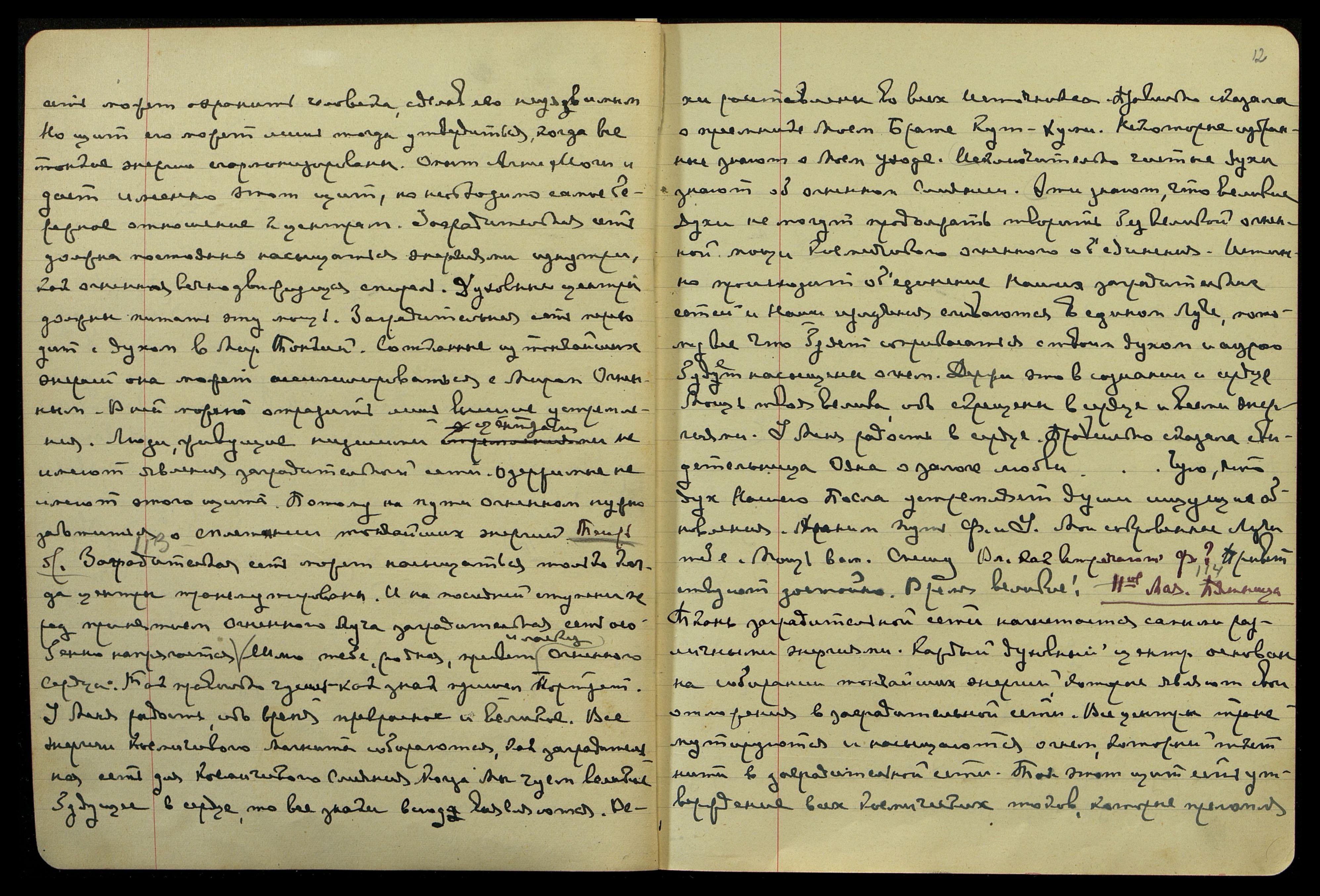 7-ое мая. Понед[ельник]. ["Мир Огненный". Часть III.] § 109. Связь между Мирами должна занять мысли человечества. Как же иначе объяснить некоторые невидимые процессы, которые насыщают жизнь? Можно проникнуться тем знанием, лишь когда дух примет в сердце явления Невидимого Мира. Как же объяснить жизнь и переход в Тонкий Мир, если не утвердиться на Огненном Мире? Ведь каждое земное проявление имеет за собою невидимую причину, которая и является потенциальной силой. Можно легко понять, что для огненного восприятия нужно, прежде всего, утвердить мысль на связи с надземными сферами. Явления в жизни могут осуществляться, лишь когда дух чует каждую высшую вибрацию. Конечно, человечество живёт без сознания сердца, которое движет силою Мира Огненного. Для лучших форм нужно смотреть на жизнь как на объединение двух Миров. Каждое устремление в этом направлении будет поучительно для восхождения в Мир Тонкий. Если принятие высших энергий устанавливается как жизненный процесс, то можно будет осознать, что жизнь земная продолжается со всеми болями на следующем Мире. Так поймём закон искупления на Земле в действиях и размышлениях. Теперь др[угое]. Такое великое время, такое грозное время. Такое строительное время. Так будем чтить творчество мысли и духа Нашей Урусвати. Так Мы охраняем Нашего Посла. Щит над ними. Лучи тебе. Мощь вам... Уявление чуда, уявление спасения России, уявление яркое у дверей. Спешу.