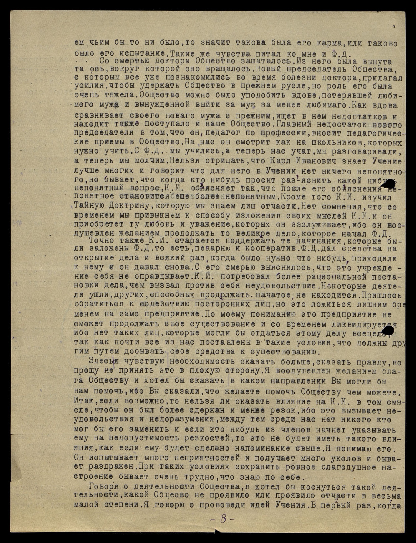 Здесь я чувствую необходимость сказать больше, сказать правду, но прошу не принять это в плохую сторону. Я воодушевлен желанием блага Обществу и хотел бы сказать в каком направлении Вы могли бы нам помочь, ибо Вы сказали, что желаете помочь Обществу чем можете. Итак, если возможно, нельзя ли оказать влияние на Карла Ивановича в том смысле, чтобы он был более сдержан и менее резок, ибо это вызывает неудовольствия и недоразумения, между тем среди нас нет никого кто мог бы его заменить и если кто-нибудь из членов начнет указывать ему на недопустимость резкостей, то это не будет иметь такого влияния, как если ему будет сделано напоминание свыше. Я понимаю его. Он испытывает много неприятностей и получает много уколов и бывает раздражен. При таких условиях сохранить ровное благодушное настроение бывает очень трудно, что знаю по себе.