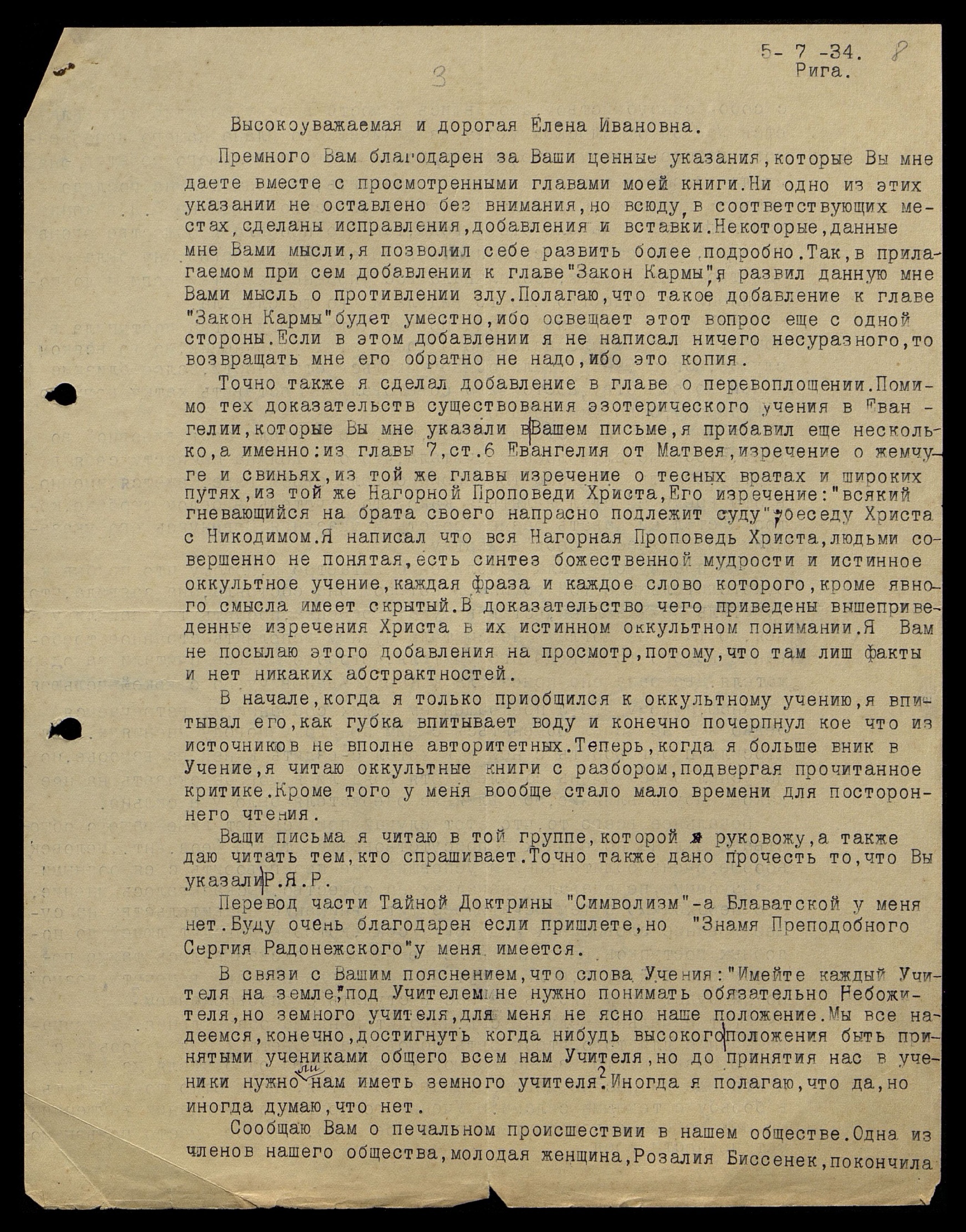 Премного Вам благодарен за Ваши ценные указания, которые Вы мне даете вместе с просмотренными главами моей книги. Ни одно из этих указаний не оставлено без внимания, но всюду, в соответствующих местах, сделаны исправления, добавления и вставки. Некоторые, данные мне Вами мысли, я позволил себе развить более подробно. Так, в прилагаемом при сем добавлении к главе "Закон Кармы" развил данную мне Вами мысль о противлении злу. Полагаю, что такое добавление к главе "Закон Кармы" будет уместно, ибо освещает этот вопрос еще с одной стороны. Если в этом добавлении я не написал ничего несуразного, то возвращать мне его обратно не надо, ибо это копия.