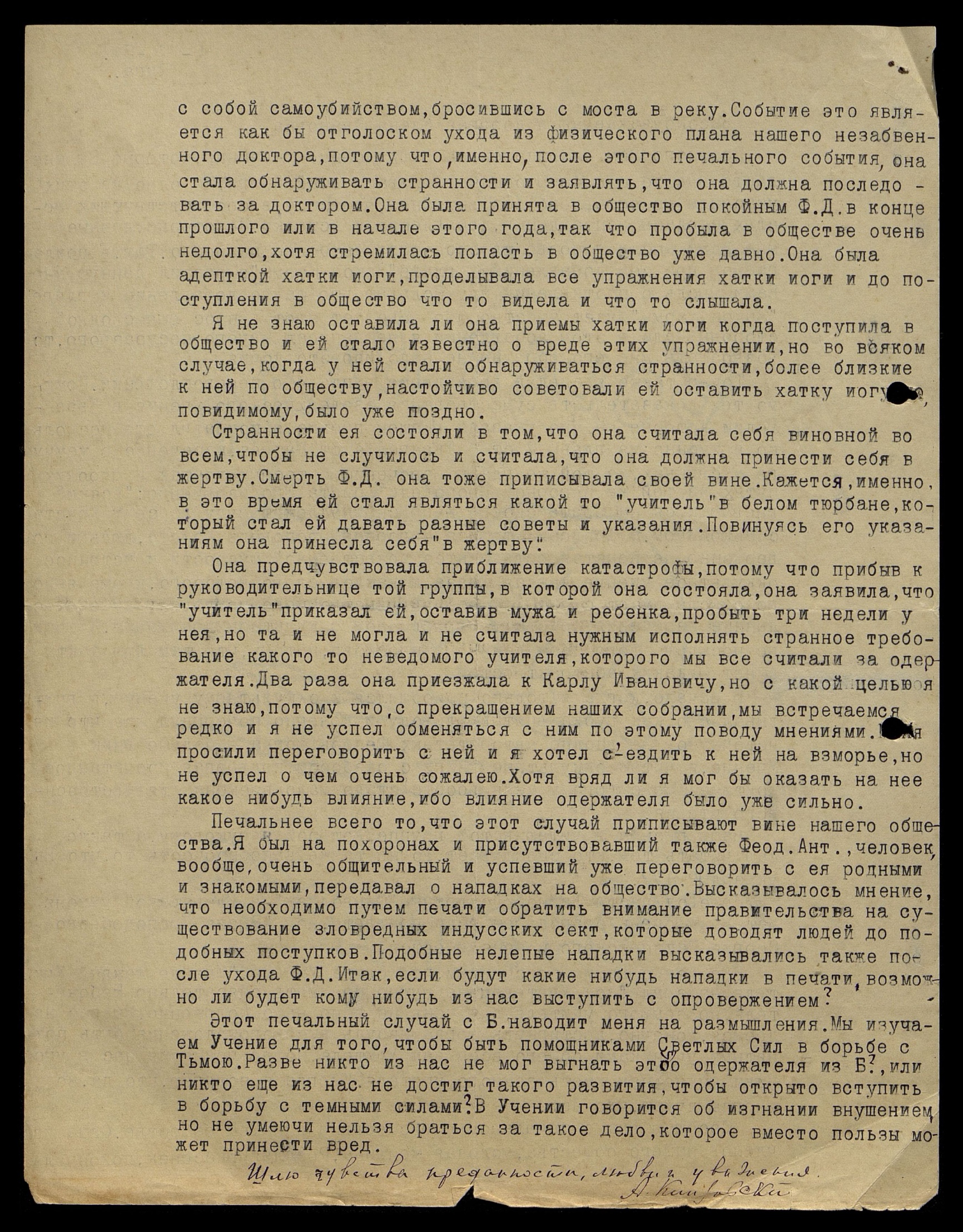 Печальнее всего то, что этот случай приписывают вине нашего общества. Я был на похоронах и присутствовавший также Федор Анатольевич [Буцен], человек вообще очень общительный и успевший уже переговорить с её родными и знакомыми, передавал о нападках на общество. Высказывалось мнение, что необходимо путем печати обратить внимание правительства на существование зловредных индусских сект, которые доводят людей до подобных поступков. Подобные нелепые нападки высказывались так же после ухода Феликса Денисовича. Итак, если будут какие-нибудь нападки в печати, возможно ли будет кому-нибудь из нас выступить с опровержением?