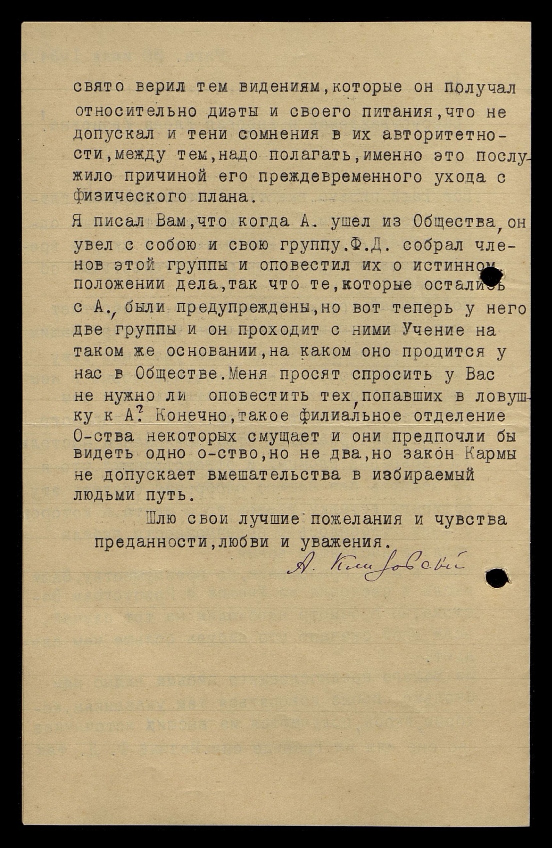 Я писал Вам, что когда Алексеев ушел из Общества, он увел с собою и свою группу. Феликс Денисович собрал членов этой группы и оповестил их о истинном положении дела, так что те, которые остались с Алексеевым были предупреждены, но вот теперь у него две группы и он проходит с ними Учение на таком же основании, на каком оно проходит у нас в Обществе. Меня просят спросить у Вас, не нужно ли оповестить тех попавших в ловушку к Алексееву? Конечно, такое филиальное отделение Общества некоторых смущает и они предпочли бы видеть одно Общество, но не два, но закон Кармы не допускает вмешательства в избираемый людьми путь.