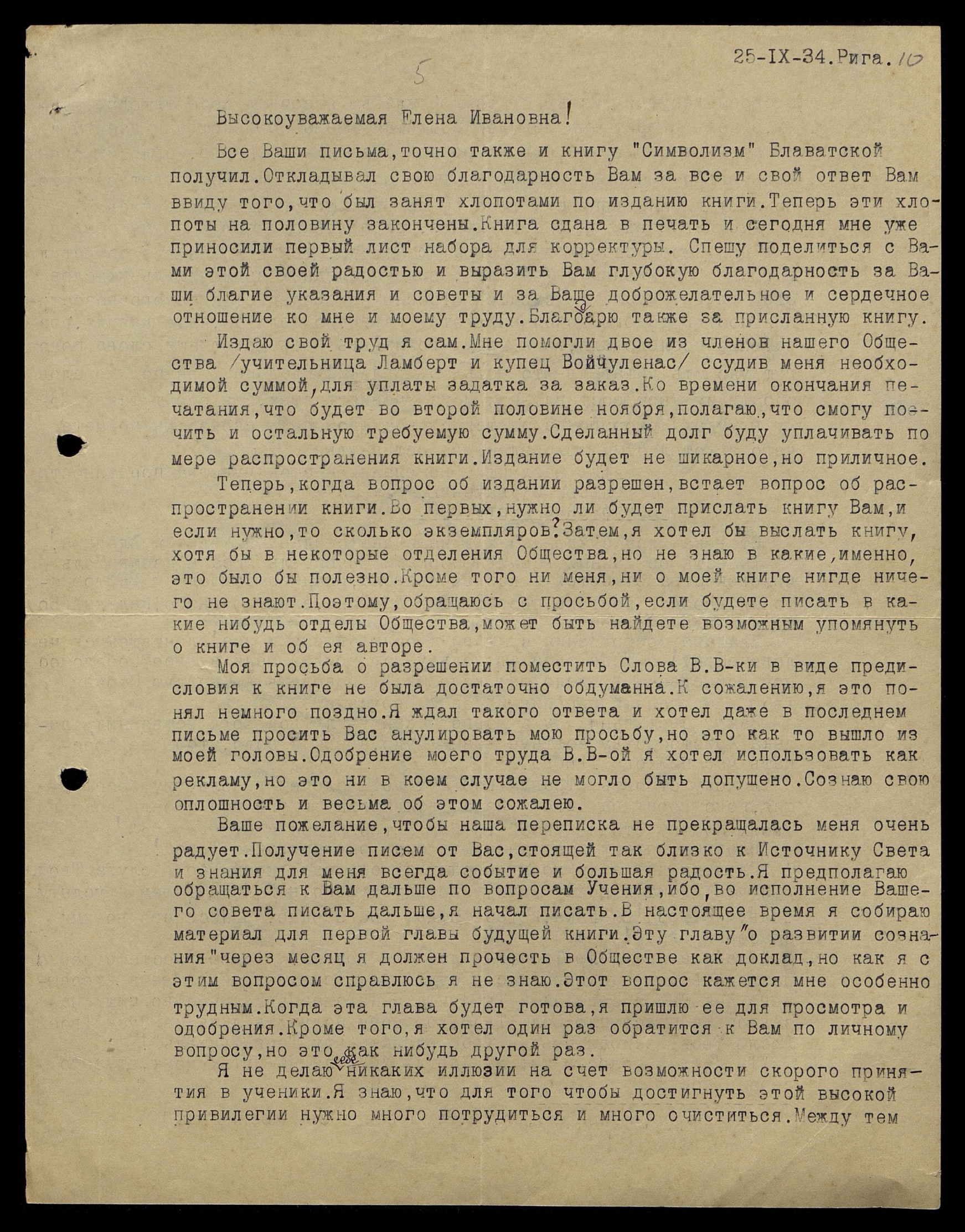 Все Ваши письма, точно также и книгу "Символизм" Блаватской получил. Откладывал свою благодарность Вам за все и свой ответ Вам ввиду того, что был занят хлопотами по изданию книги. Теперь эти хлопоты на половину закончены. Книга сдана в печать и сегодня мне уже приносили первый лист набора для корректуры. Спешу поделиться с Вами этой своей радостью и выразить Вам глубокую благодарность за Ваши благие указания и советы и за Ваше доброжелательное и сердечное отношение ко мне и моему труду. Благодарю также за присланную книгу.