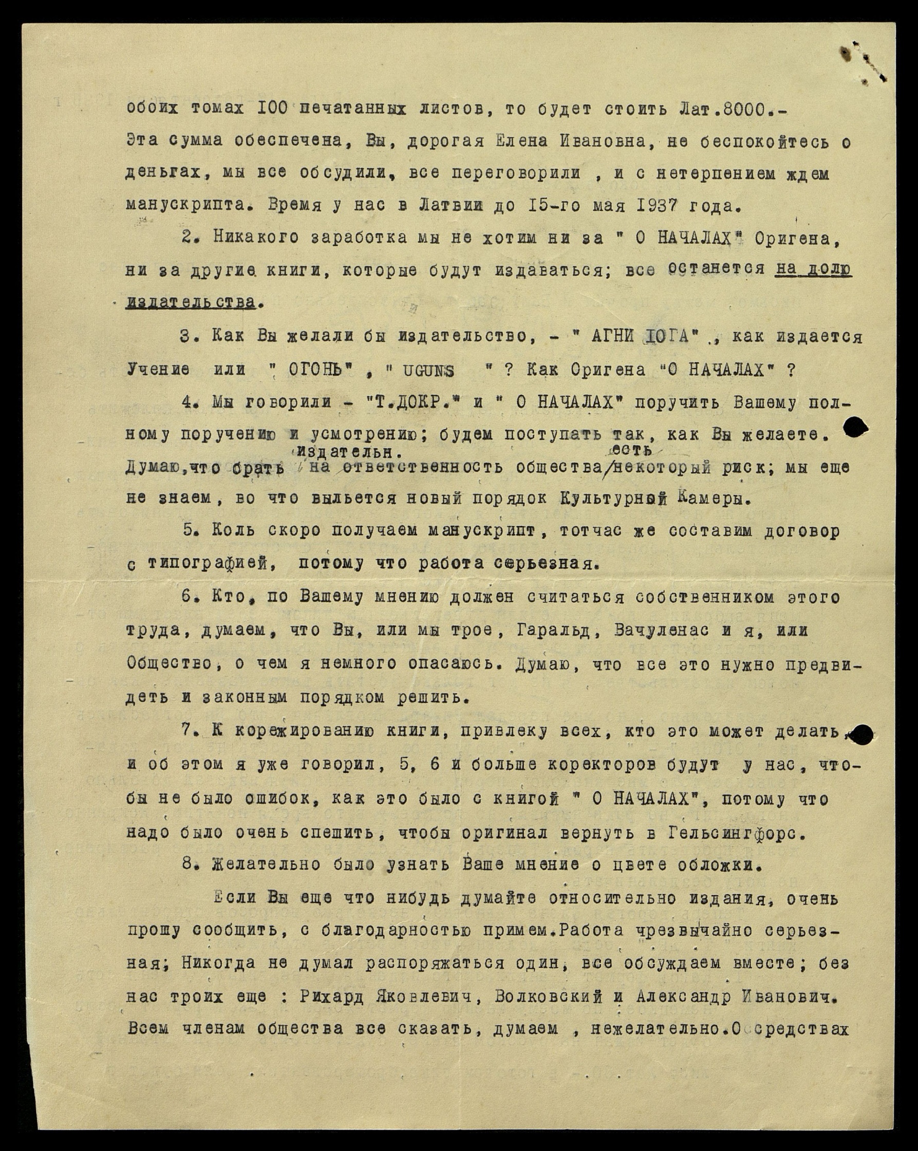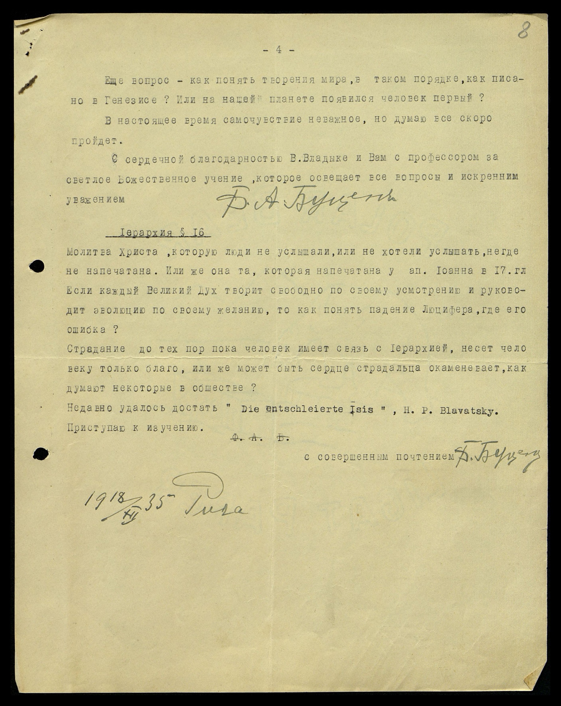 4. Мы говорили, "ТАЙНУЮ ДОКТРИНУ" и "О НАЧАЛАХ" поручить Вашему полному поручению и усмотрению; будем поступать так, как Вы желаете. Думаю, что брать издательство на ответственность общества есть некоторый риск; мы еще не знаем, во что выльется новый порядок Культурной Камеры.