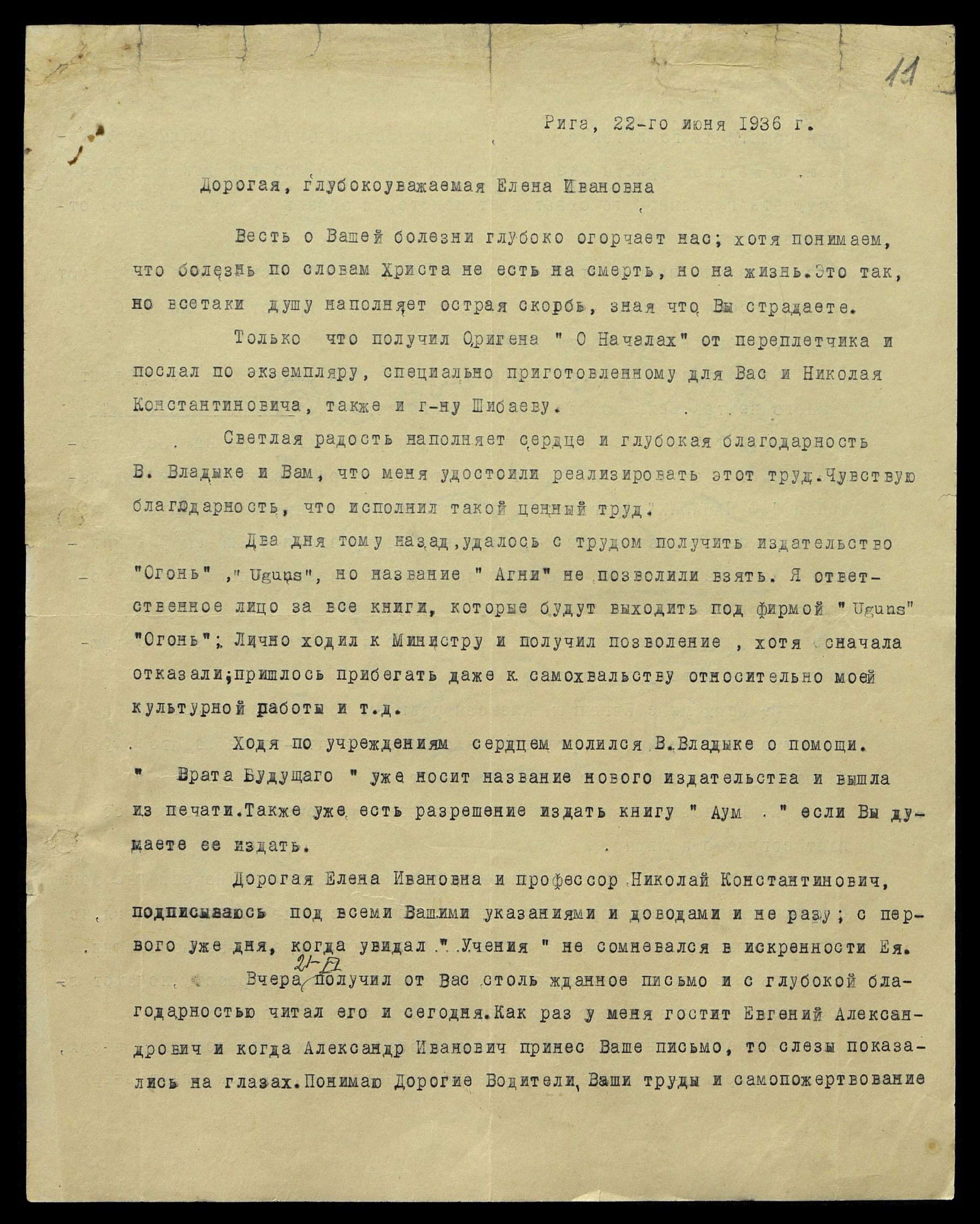 обоих томах 100 печатанных листов, то будет стоить латов 8000. Эта сумма обеспечена. Вы, дорогая Елена Ивановна, не беспокойтесь о деньгах, мы все обсудили, все переговорили, и с нетерпением ждем манускрипта. Время у нас в Латвии до 15-го мая 1937 года.