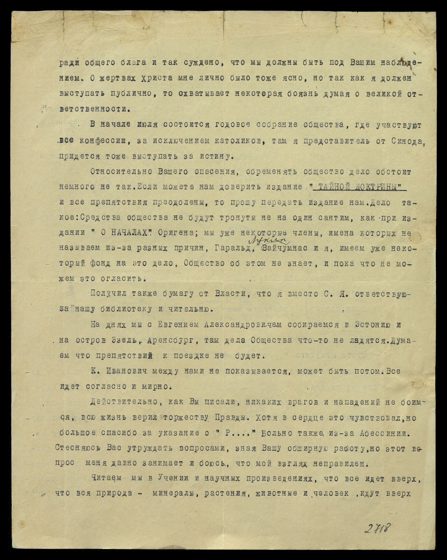 Относительно Вашего опасения обременять общество дело обстоит немного не так. Если можете нам доверить издание "ТАЙНОЙ ДОКТРИНЫ", и все препятствия преодолены, то прошу передать издание нам. Дело такое: средства общества не будут тронуты не на один сантим, как при издании "О НАЧАЛАХ" Оригена; мы, уже некоторые члены, имена которых не называем из-за разных причин, Гаральд Лукин, Вайчумнас и я, имеем уже некоторый фонд на это дело. Общество об этом не знает, и пока что не можем это огласить.