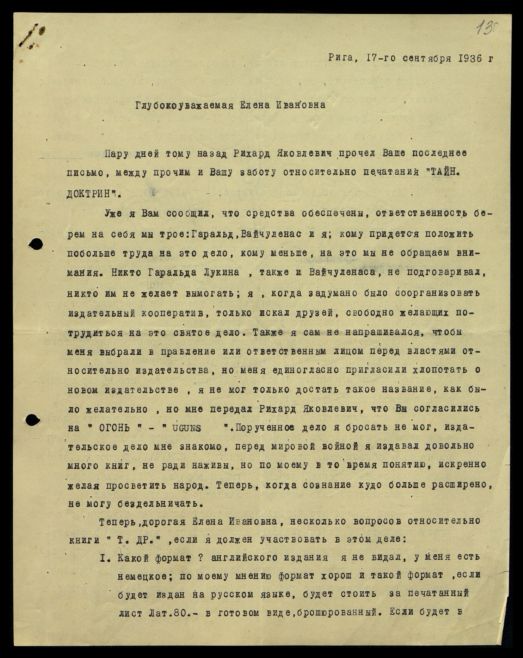 Пару дней тому назад Рихард Яковлевич прочел Ваше последнее письмо, между прочим и Вашу заботу относительно печатания "ТАЙНОЙ ДОКТРИНЫ".