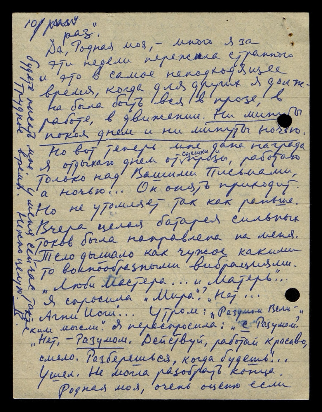 Но теперь это у меня было только один раз и даже тогда без немедленного тихого засыпания, но с сознательными вопросами, ответами, размышлениями. Я теперь поняла, что таким резким вторжением в мой сон, в моё сознание В[еликий] У[читель] должен был прекратить некоторый образ мыслей — не плохих, но и не достаточно больших, нужно было совсем выбить меня из земной колеи. Это было достигнуто в течении нескольких дней. Но изнурение организма было острейшее… Теперь мне дан полный отдых. Я сплю по ночам, а днём усиленно работаю над «Письмами». Ярко синие, любимые пятна время от времени подтверждают любовное Присутствие и Одобрение.