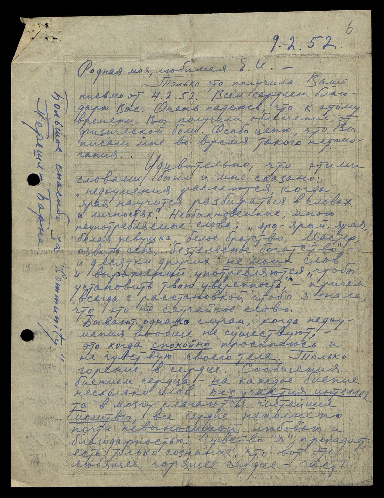 Только что получила Ваше письмо от 4.02.52. Всем сердцем благодарю Вас. Очень надеюсь, что к этому времени Вы получили облегчение от физической боли. Особо ценю, что Вы писали мне во время такого недомогания…