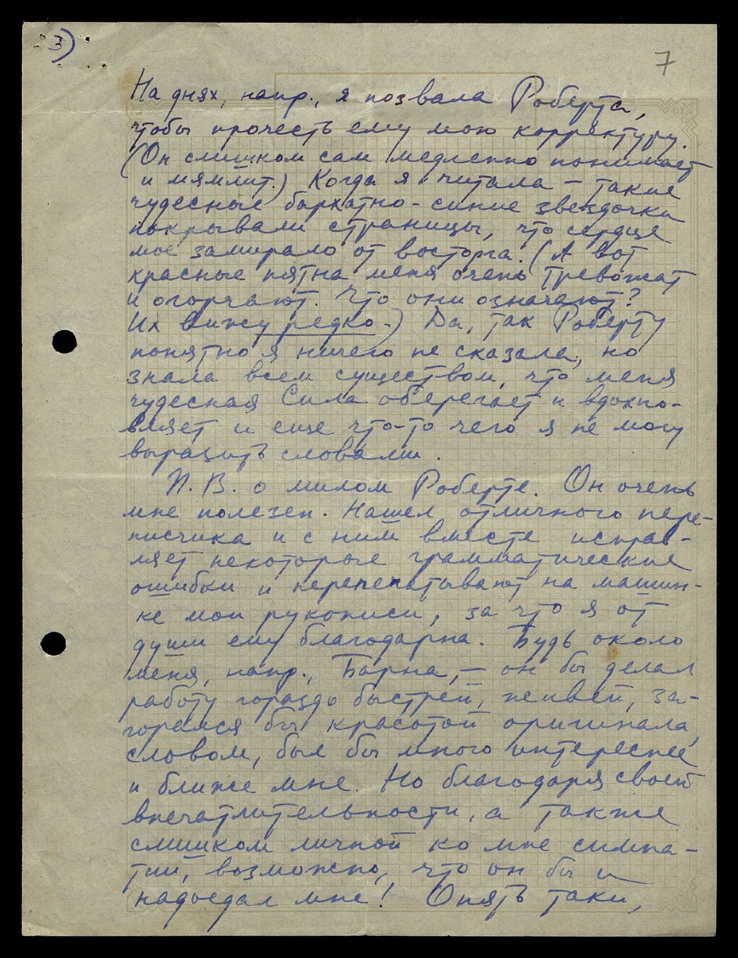 [Сокращение слова неразборчиво]. В. о милом Роберте. Он очень мне полезен. Нашёл отличного переписчика и с ним вместе исправляет некоторые грамматические ошибки и перепечатывают на машинке мои рукописи, за что я от души ему благодарна. Будь около меня, напр[имер], Барна, он бы делал работу гораздо быстрей, живей, загорелся бы красотой оригинала, словом, был бы много интереснее и ближе мне. Но благодаря своей впечатлительности, а также слишком личной ко мне симпатии, возможно, что он бы и надоедал мне! Опять-таки,