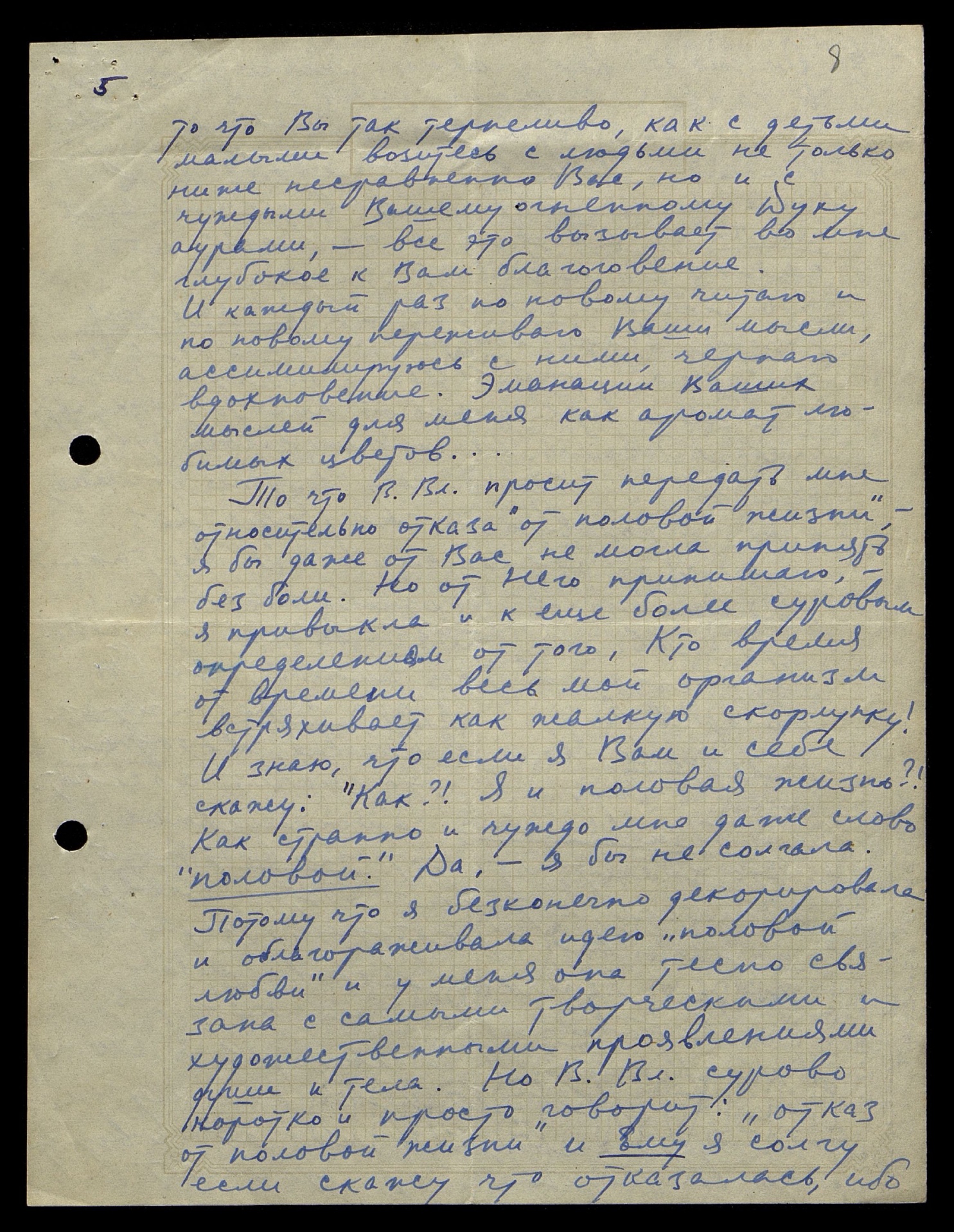 Потому что я бесконечно декорировала и облагораживала идею «половой любви» и у меня она тесно связана с самыми творческими и художественными проявлениями души и тела. Но В[еликий] Вл[адыка] сурово коротко и просто говорит: «Отказ от половой жизни» и Ему я солгу, если скажу, что отказалась, ибо