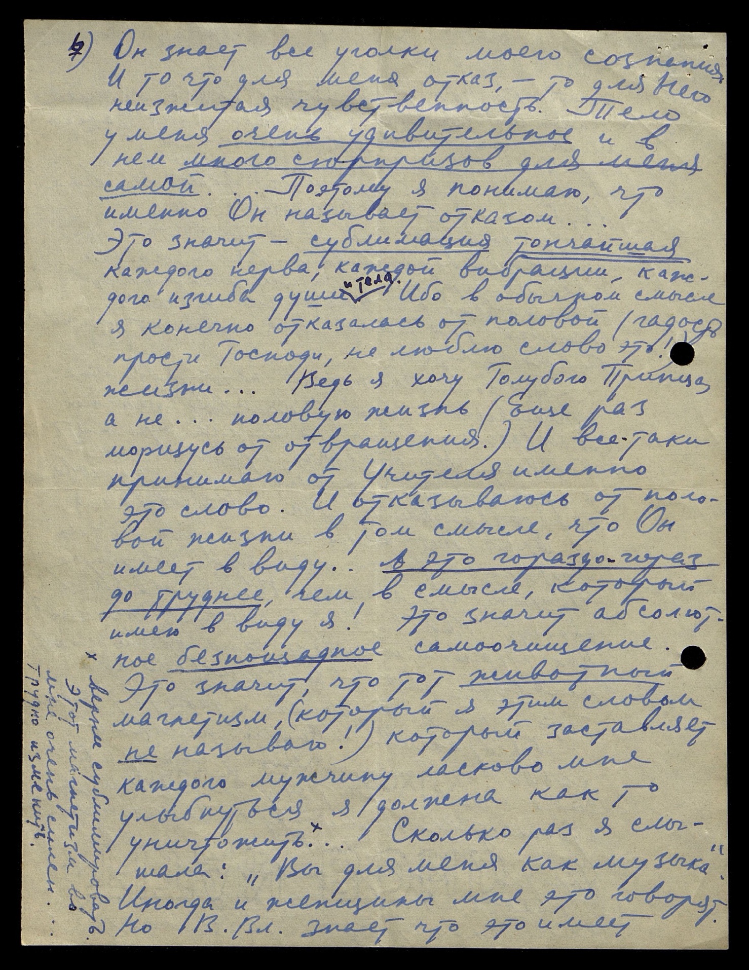 Он знает все уголки моего сознания и то, что для меня отказ, то для него неизжитая чувственность. Тело у меня очень удивительное и в нём много сюрпризов для меня самой... Поэтому я понимаю, что именно Он называет отказом… Это значит — сублимация тончайшая каждого нерва, каждой вибрации, каждого изгиба души и тела. Ибо в обычном смысле я, конечно, отказалась от половой (гадость, прости Господи, не люблю слово это!) жизни… Ведь я хочу Голубого Принца а не… половую жизнь (ещё раз морщусь от отвращения). И всё-таки принимаю от Учителя именно это слово. И отказываюсь от половой жизни в том смысле, что Он имеет в виду. А это гораздо, гораздо труднее, чем в смысле, который имею в виду я! Это значит — абсолютное, беспощадное самоочищение. Это значит, что тот животный магнетизм, (который я этим словом не называю!) который заставляет каждого мужчину ласково мне улыбнуться, я должна как-то уничтожить*… Сколько раз я слышала: «Вы для меня как музыка». Иногда и женщины мне это говорят. Но В[еликий Вл[адыка] знает, что это имеет