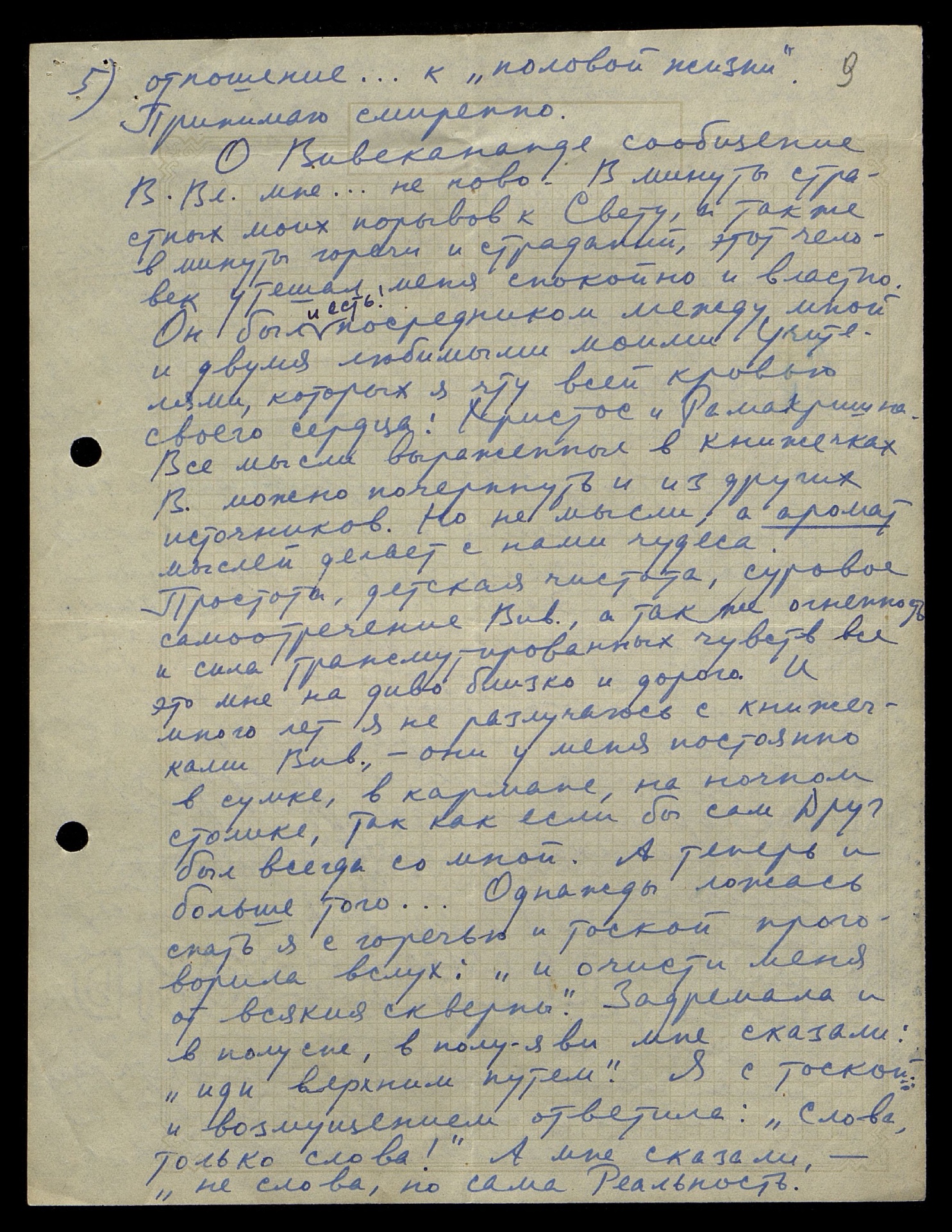О Вивекананде сообщение В[еликого] Вл[адыки] мне… не ново. В минуты страстных моих порывов к Свету, а также в минуты горечи и страданий, этот человек утешал меня спокойно и властно. Он был и есть посредником между мной и двумя любимыми моими Учителями, которых я чту всей кровью своего сердца: Христос и Рамакришна. Все мысли, выраженные в книжечках В[ивекананды] можно почерпнуть и из других источников. Но не мысли, а аромат мыслей делает с нами чудеса. Простота, детская чистота, суровое самоотречение Вив[екананды], а также огненность и сила трансмутированных чувств — всё это мне на диво близко и дорого. И много лет я не разлучаюсь с книжечками Вив[екананды], — они у меня постоянно в сумке, в кармане, на ночном столике, так как если бы сам Друг был всегда со мной. А теперь и больше того…