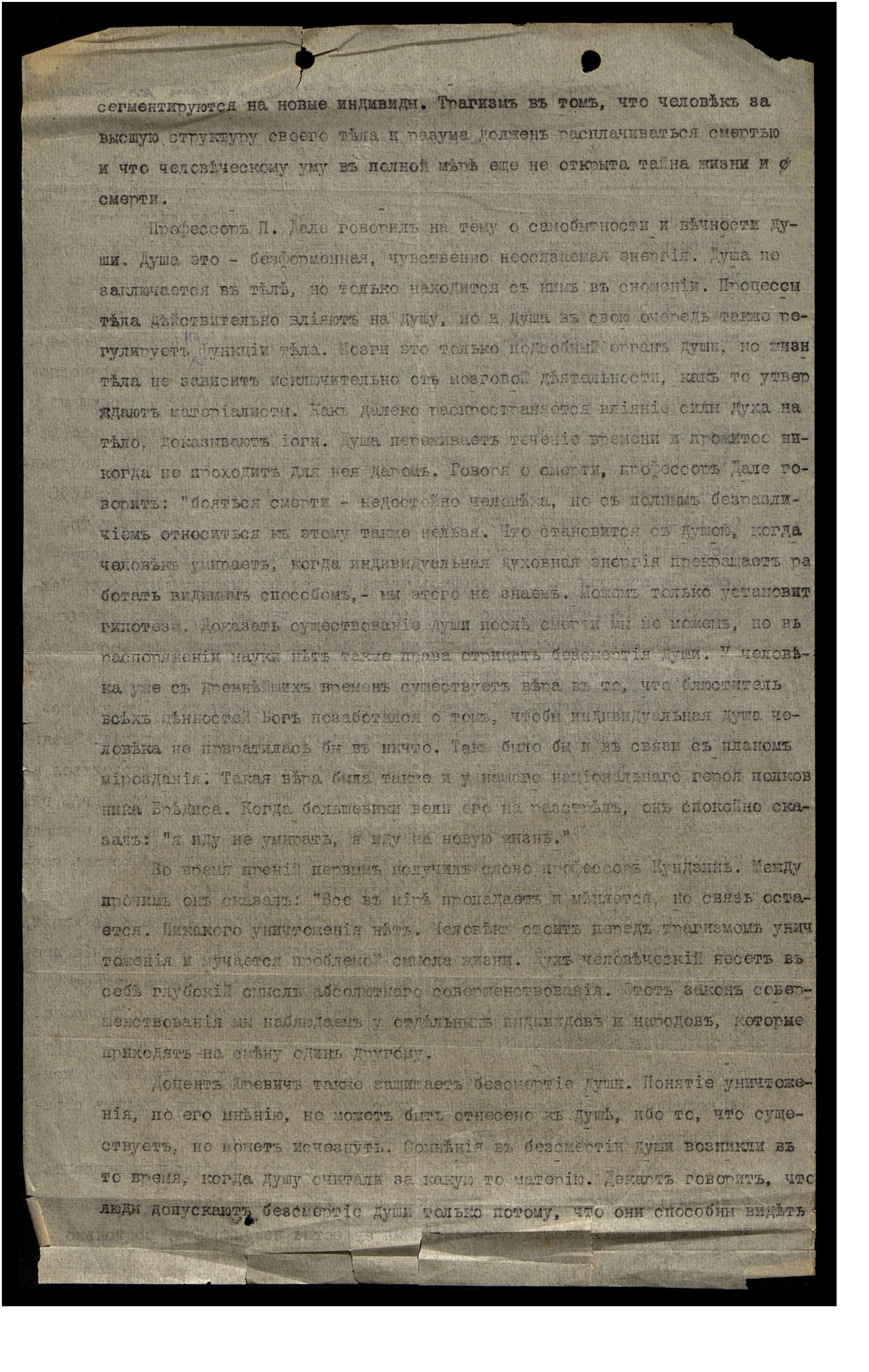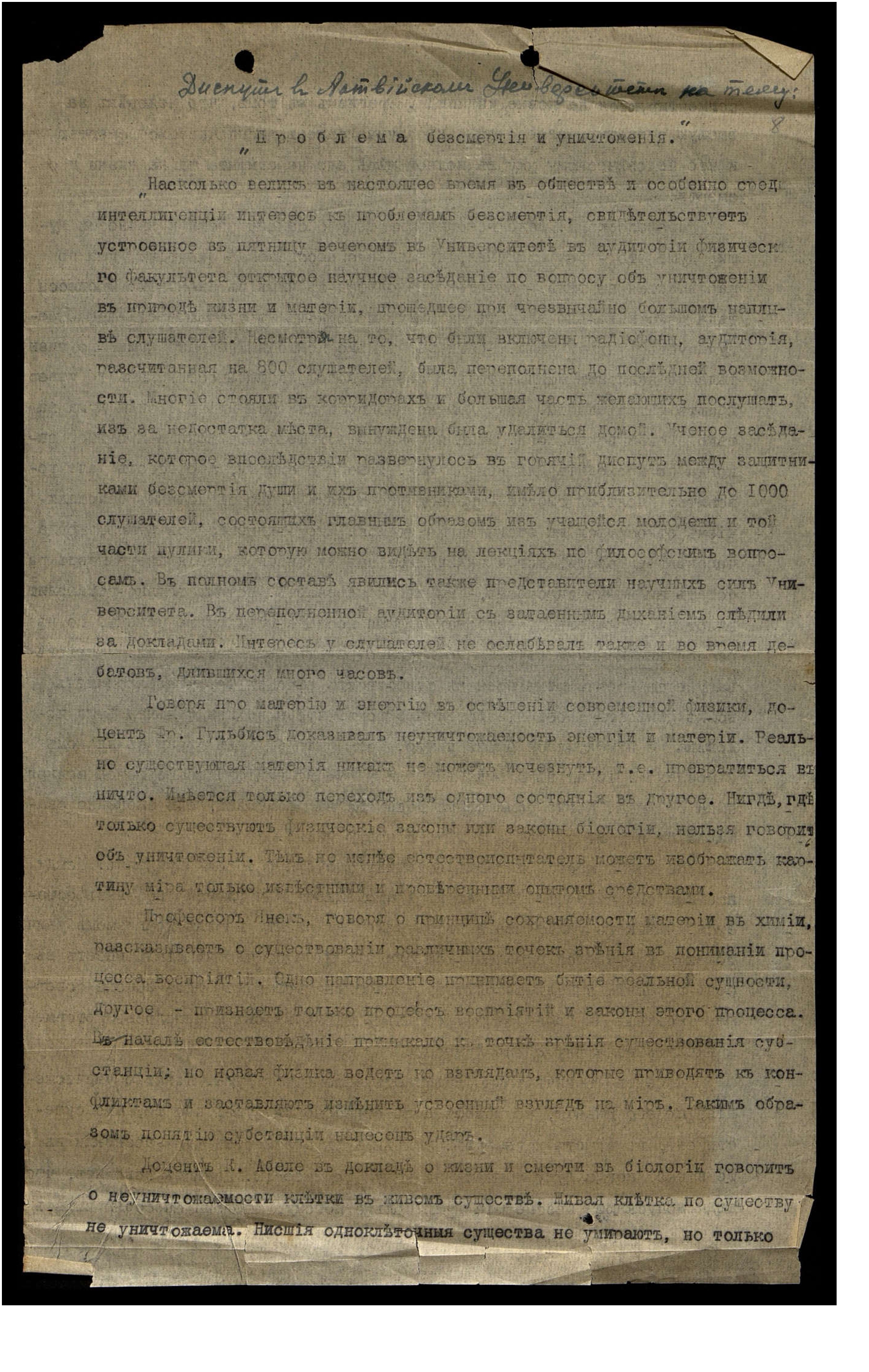 "Насколько велик в настоящее время в обществе и особенно среди интеллигенции интерес к проблемам бессмертия, свидетельствует устроенное в пятницу вечером в Университете в аудитории физического факультета открытое научное заседание по вопросу об уничтожении в природе жизни и материи, прошедшее при чрезвычайно большом наплыве слушателей. Несмотря на то, что были включены радиофоны, аудитория, рассчитанная на 800 слушателей, была переполнена до последней возможности. Многие стояли в коридорах и большая часть желающих послушать из-за недостатка места вынуждена была удалиться домой. Ученое заседание, которое впоследствии развернулось в горячий диспут между защитниками бессмертия души и их противниками, имело приблизительно до 1000 слушателей, состоящих главным образом из учащейся молодежи и той части публики, которую можно видеть на лекциях по философским вопросам. В полном составе явились также представители научных сил Университета. В переполненной аудитории с затаенным дыханием следили за докладами. Интерес у слушателей не ослабевал также и во время дебатов, длившихся много часов.