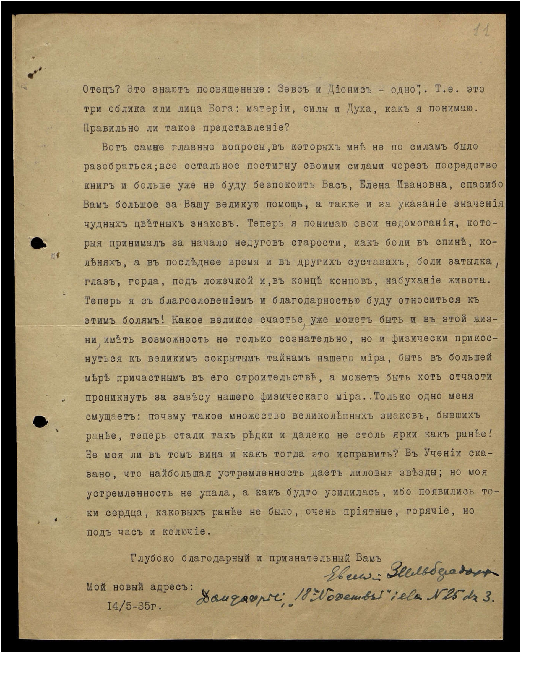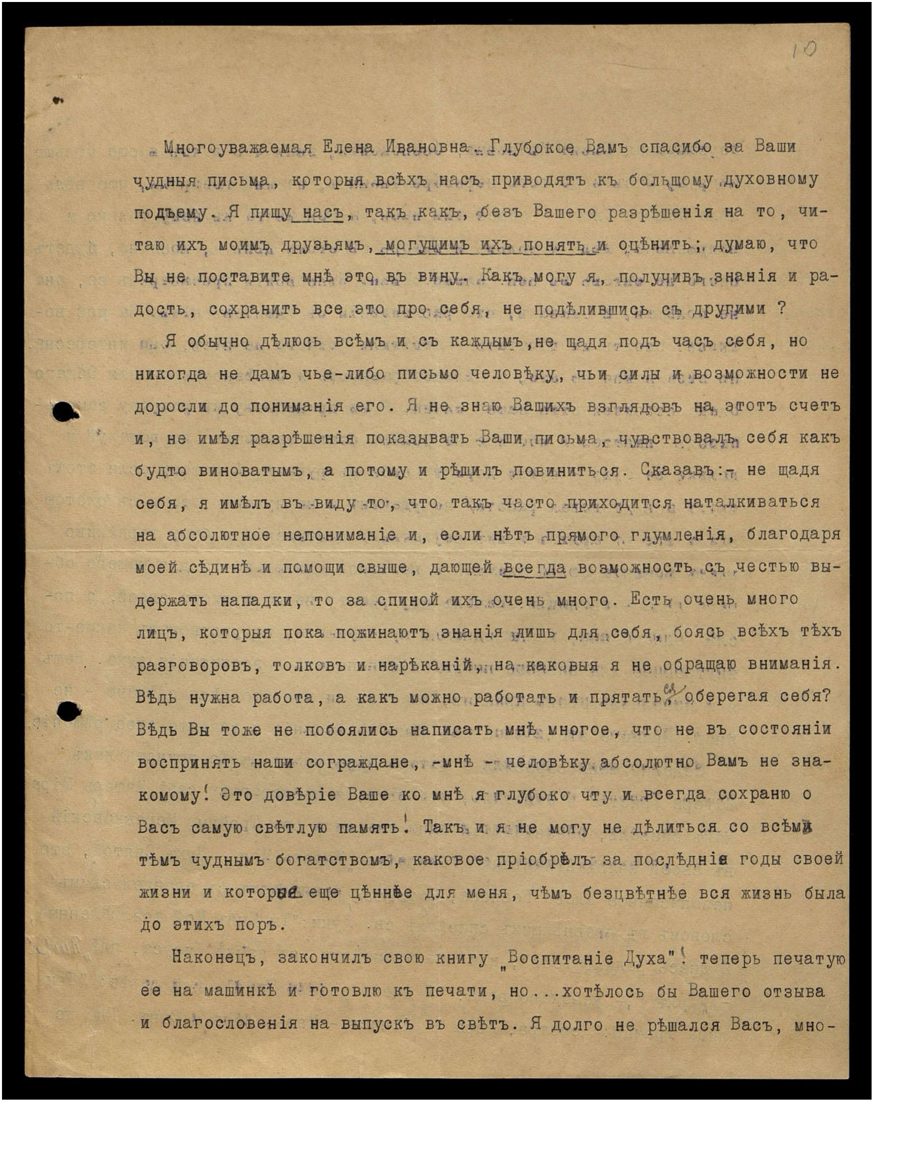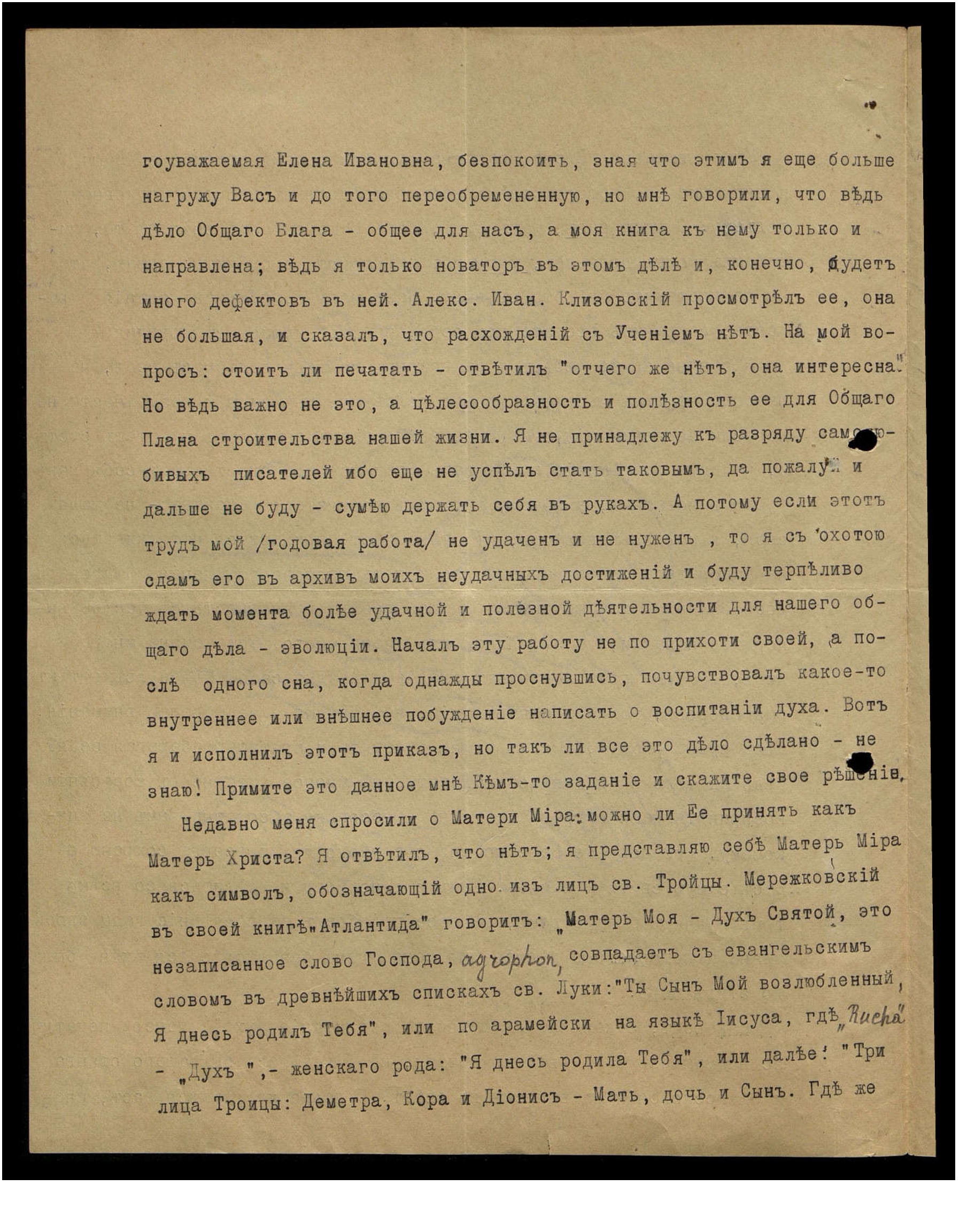 гоуважаемая Елена Ивановна, беспокоить, зная, что этим я еще больше нагружу Вас и до того переобремененную, но мне говорили, что ведь дело Общего Блага − общее для нас, а моя книга к нему только и направлена; ведь я только новатор в этом деле и, конечно, будет много дефектов в ней. Александр Иванович Клизовский просмотрел её, она не большая, и сказал, что расхождений с Учением нет. На мой вопрос: "Стоит ли печатать?" − ответил: "Отчего же нет, она интересна". Но ведь важно не это, а целесообразность и полезность её для Общего Плана строительства нашей жизни. Я не принадлежу к разряду самолюбивых писателей, ибо еще не успел стать таковым, да пожалуй и дальше не буду − сумею держать себя в руках. А потому если этот труд мой (годовая работа) не удачен и не нужен, то я с охотою сдам его в архив моих неудачных достижений и буду терпеливо ждать момента более удачной и полезной деятельности для нашего общего дела − эволюции. Начал эту работу не по прихоти своей, а после одного сна, когда однажды проснувшись, почувствовал какое-то внутреннее или внешнее побуждение написать о воспитании духа. Вот я и исполнил этот приказ, но так ли всё это дело сделано − не знаю. Примите это данное мне Кем-то задание и скажите своё решение.