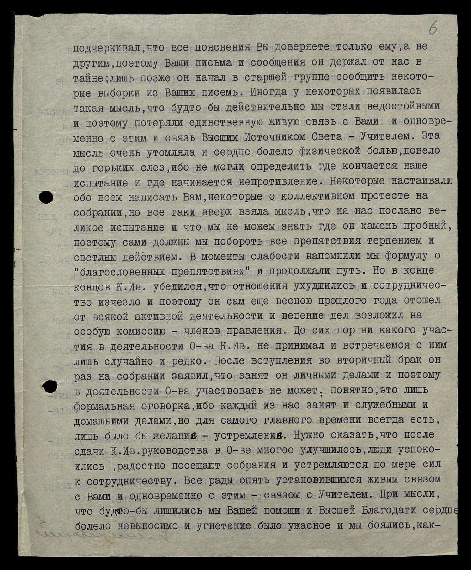 подчеркивал, что все пояснения Вы доверяете только ему, а не другим, поэтому Ваши письма и сообщения он держал от нас втайне; лишь позже он начал в старшей группе сообщать некоторые выборки из Ваших писем. Иногда у некоторых появилась такая мысль, что будто бы действительно мы стали недостойными и поэтому потеряли единственную живую связь с Вами и одновременно с этим и связь с Высшим Источником Света − Учителем. Эта мысль очень утомляла и сердце болело физической болью, довело до горьких слез, ибо не могли определить, где кончается наше испытание и где начинается непротивление. Некоторые настаивали обо всем написать Вам, некоторые о коллективном протесте на собрании, но все-таки вверх взяла мысль, что на нас послано великое испытание и что мы не можем знать, где он камень пробный, поэтому сами должны мы побороть все препятствия терпением и светлым действием. В моменты слабости напомнили мы формулу о "благословенных препятствиях" и продолжали путь. Но в конце концов Карл Иванович убедился, что отношения ухудшились и сотрудничество исчезло, и поэтому он сам еще весною прошлого года отошел от всякой активной деятельности и ведение дел возложил на особую комиссию − членов правления. До сих пор никакого участия в деятельности Общества Карл Иванович не принимал и встречаемся с ним лишь случайно и редко. После вступления во вторичный брак он раз на собрании заявил, что занят он личными делами, и поэтому в деятельности Общества участвовать не может; понятно, это лишь формальная оговорка, ибо каждый из нас занят и служебными, и домашними делами, но для самого главного времени всегда есть, лишь было бы желание и устремление. Нужно сказать, что после сдачи Карла Ивановича руководства в Обществе многое улучшилось, люди успокоились, радостно посещают собрания и устремляются по мере сил к сотрудничеству. Все рады опять установившимся живым связям с Вами и одновременно с этим связью с Учителем. При мысли, что будто бы лишились мы Вашей помощи и Высшей Благодати сердце болело невыносимо и угнетение было ужасное, и мы боялись, как