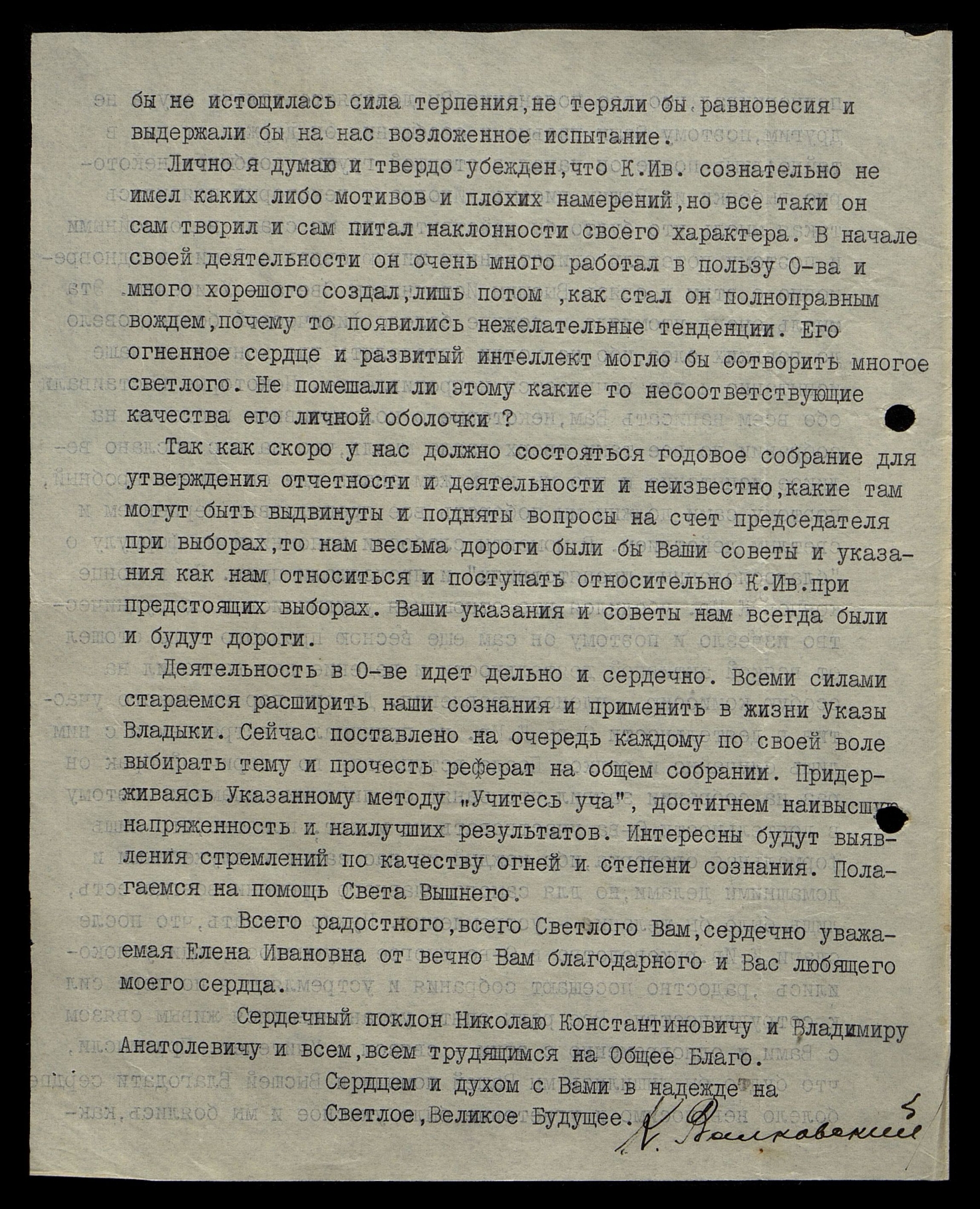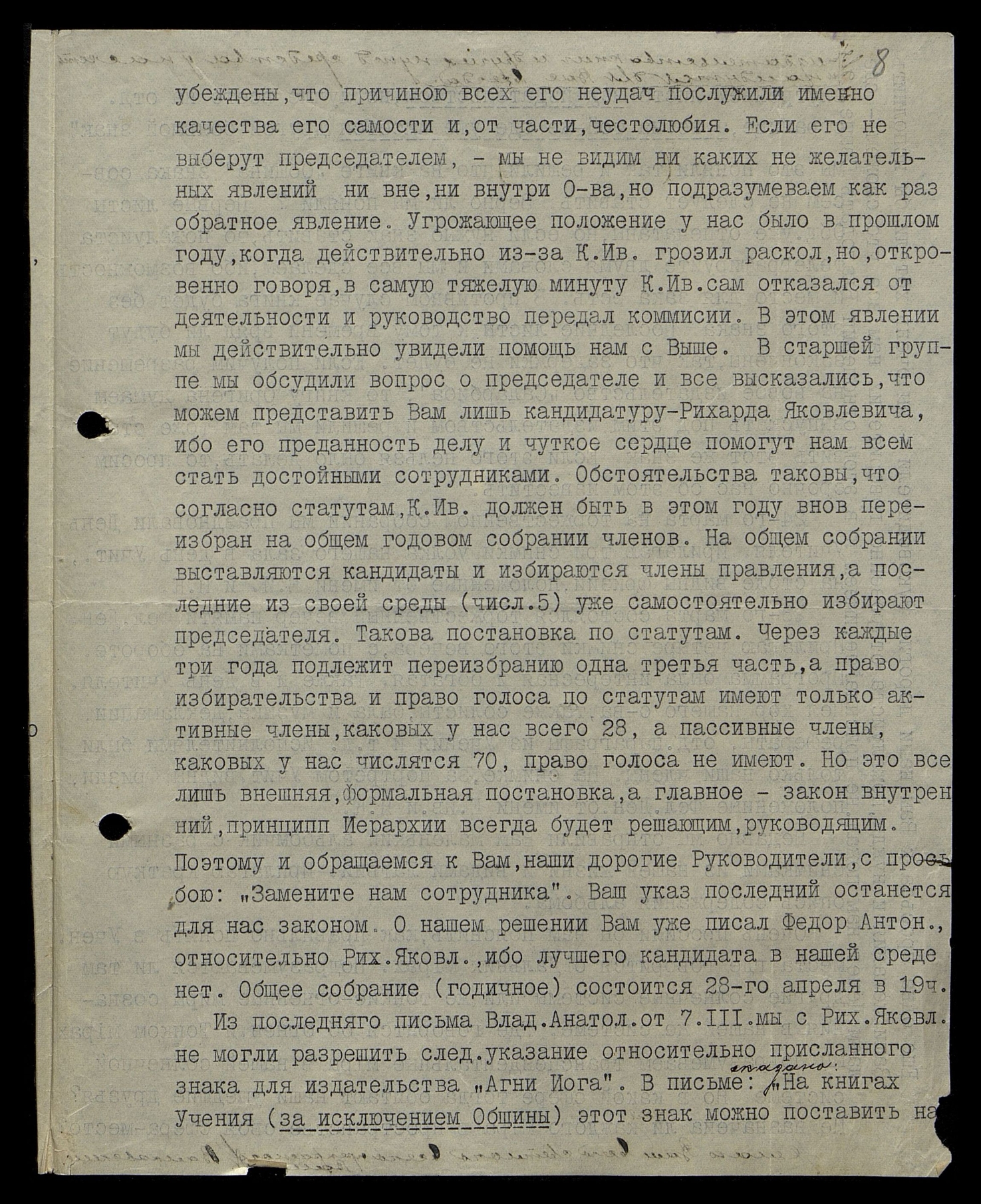 убеждены, что причиною всех его неудач послужили именно качества его самости и отчасти честолюбия. Если его не выберут председателем, мы не видим никаких нежелательных явлений ни вне, ни внутри Общества, но подразумеваем как раз обратное явление. Угрожающее положение у нас было в прошлом году, когда действительно из-за Карла Ивановича [Стуре] грозил раскол, но, откровенно говоря, в самую тяжелую минуту Карл Иванович сам отказался от деятельности и руководство передал комиссии. В этом явлении мы действительно увидели помощь нам свыше. В старшей группе мы обсудили вопрос о председателе и все высказались, что можем представить Вам лишь кандидатуру Рихарда Яковлевича [Рудзитиса], ибо его преданность делу и чуткое сердце помогут нам всем стать достойными сотрудниками. Обстоятельства таковы, что согласно статутам [уставам], Карл Иванович должен быть в этом году вновь переизбран на общем годовом собрании членов. На общем собрании выставляются кандидаты и избираются члены правления, а последние из своей среды (числом 5) уже самостоятельно избирают председателя. Такова постановка по статутам. Через каждые три года подлежит переизбранию одна третья часть, а право избирательства и право голоса по статутам имеют только активные члены, каковых у нас всего 28, а пассивные члены, каковых у нас числятся 70, право голоса не имеют. Но это все лишь внешняя, формальная постановка, а главное − закон внутренний, принцип Иерархии всегда будет решающим, руководящим. Поэтому и обращаемся к Вам, наши дорогие Руководители, с просьбою: "Замените нам сотрудника". Ваш указ последний останется для нас законом. О нашем решении Вам уже писал Фёдор Антонович [Буцен] относительно Рихарда Яковлевича [Рудзитиса], ибо лучшего кандидата в нашей среде нет. Общее собрание (годичное) состоится 28-го апреля в 19 ч.