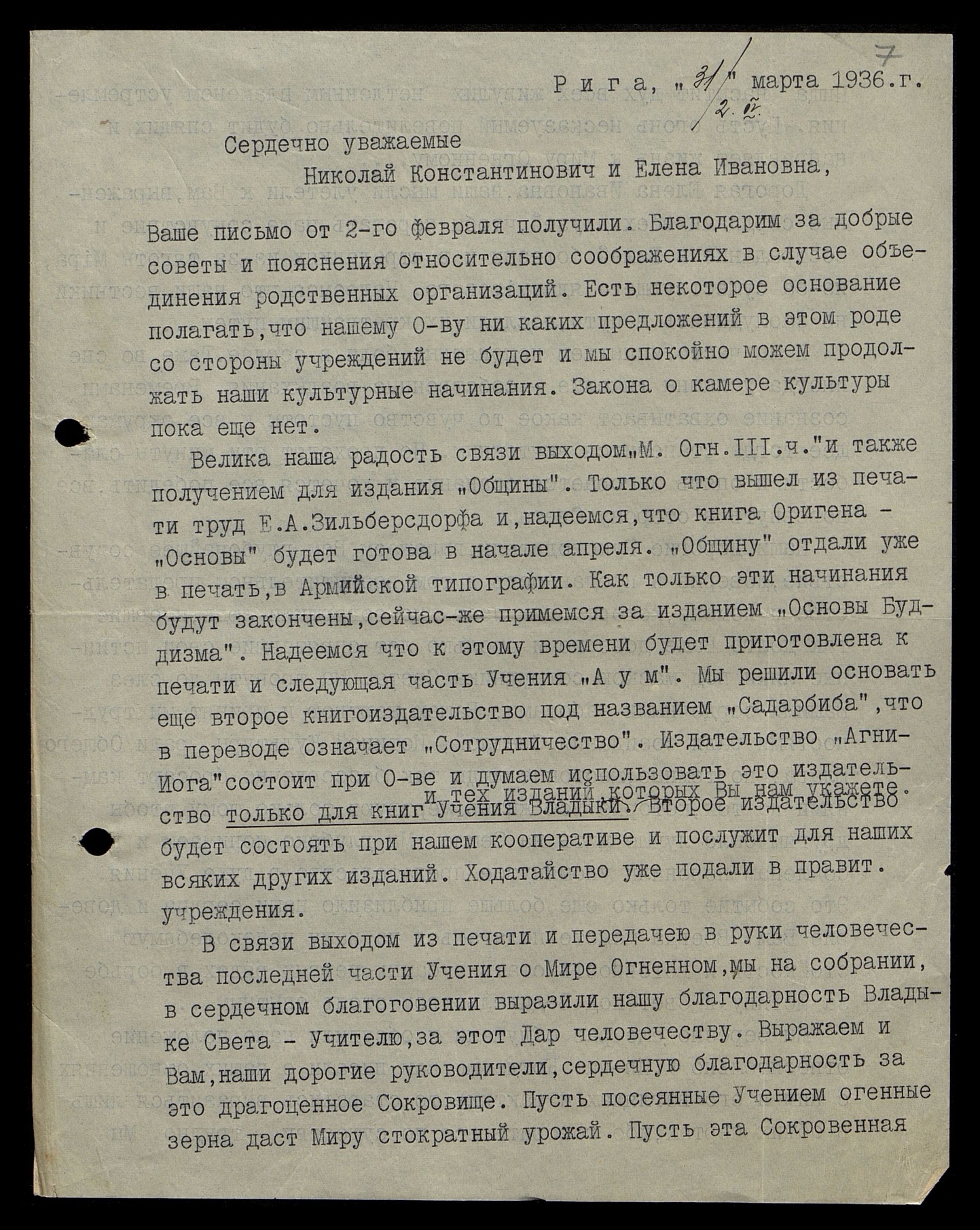Велика наша радость в связи с выходом [книги] "Мир Огненный, III часть" и также получением для издания "Общины". Только что вышел из печати труд Е.А. Зильберсдорфа и надеемся, что книга Оригена "Основы" будет готова в начале апреля. "Общину" отдали уже в печать в Армийской типографии. Как только эти начинания будут закончены, сейчас же примемся за издание [книги] "Основы Буддизма". Надеемся что к этому времени будет приготовлена к печати и следующая часть Учения − "Аум". Мы решили основать еще второе книгоиздательство под названием "Садарбиба", что в переводе означает "Сотрудничество". Издательство "Агни-Йога" состоит при Обществе, и думаем использовать это издательство только для книг Учения Владыки и тех изданий, которые Вы нам укажете. Второе издательство будет состоять при нашем кооперативе и послужит для наших всяких других изданий. Ходатайство уже подали в правительственные учреждения.