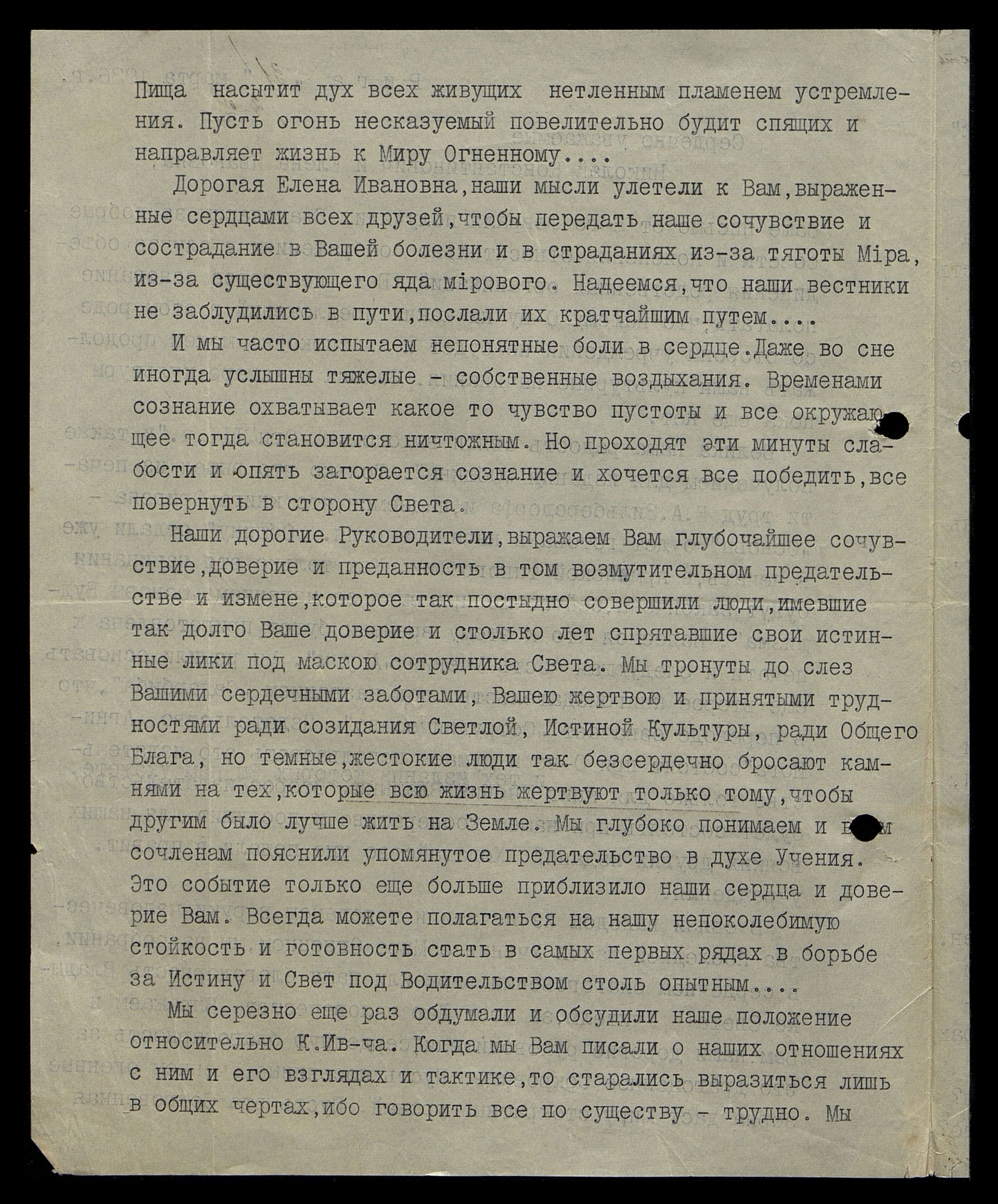 Наши дорогие Руководители, выражаем Вам глубочайшее сочувствие, доверие и преданность в том возмутительном предательстве и измене, которое так постыдно совершили люди, имевшие так долго Ваше доверие и столько лет прятавшие свои истинные лики под маскою сотрудника Света. Мы тронуты до слез Вашими сердечными заботами, Вашею жертвою и принятыми трудностями ради созидания Светлой, Истиной Культуры, ради Общего Блага, но темные, жестокие люди так бессердечно бросают камнями на тех, которые всю жизнь жертвуют только тому, чтобы другим было лучше жить на Земле. Мы глубоко понимаем и всем членам пояснили упомянутое предательство в духе Учения. Это событие только еще больше приблизило наши сердца и доверие Вам. Всегда можете полагаться на нашу непоколебимую стойкость и готовность стать в самых первых рядах в борьбе за Истину и Свет под Водительством столь опытным...