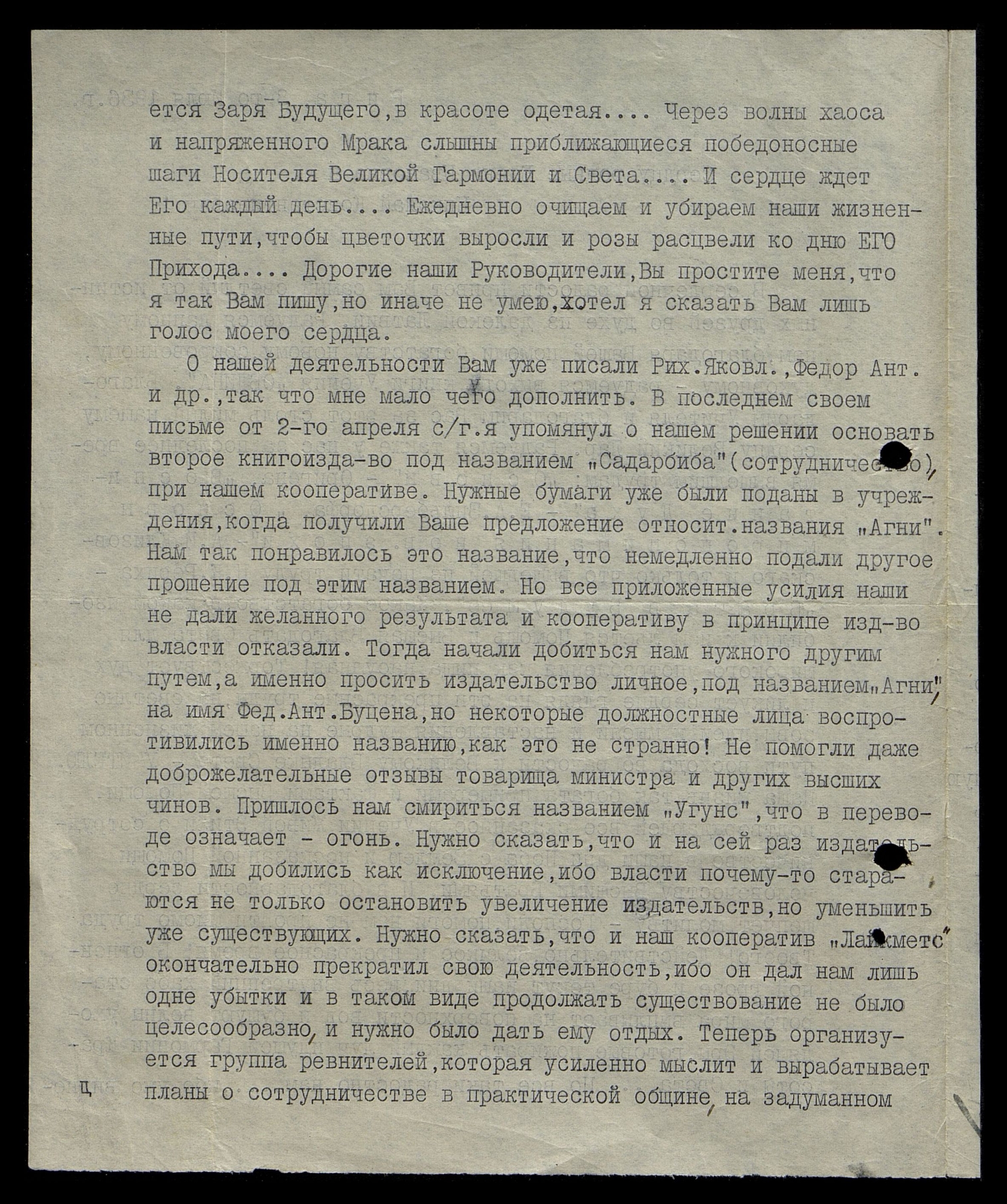 О нашей деятельности Вам уже писали Рихард Яковлевич [Рудзитис], Фёдор Антонович [Буцен] и др., так что мне мало чего дополнить. В последнем своем письме от 2-го апреля с/г. я упомянул о нашем решении основать второе книгоиздательство под названием "Садарбиба" ("Сотрудничество") при нашем кооперативе. Нужные бумаги уже были поданы в учреждения, когда получили Ваше предложение относительно названия "Агни". Нам так понравилось это название, что немедленно подали другое прошение под этим названием. Но все приложенные усилия наши не дали желанного результата и кооперативу в принципе [иметь] издательство власти отказали. Тогда начали добиваться нам нужного другим путем, а именно просить издательство личное, под названием "Агни", на имя Фёдора Антоновича Буцена, но некоторые должностные лица воспротивились именно названию, как это не странно! Не помогли даже доброжелательные отзывы товарища министра и других высших чинов. Пришлось нам смириться с названием "Угунс", что в переводе означает "огонь". Нужно сказать, что и на сей раз издательство мы добились как исключение, ибо власти почему-то стараются не только остановить увеличение издательств, но уменьшить [количество] уже существующих. Нужно сказать, что и наш кооператив "Лайкметс" окончательно прекратил свою деятельность, ибо он дал нам лишь одни убытки и в таком виде продолжать существование не было целесообразно, и нужно было дать ему отдых. Теперь организуется группа ревнителей, которая усиленно мыслит и вырабатывает планы о сотрудничестве в практической общине, на задуманном