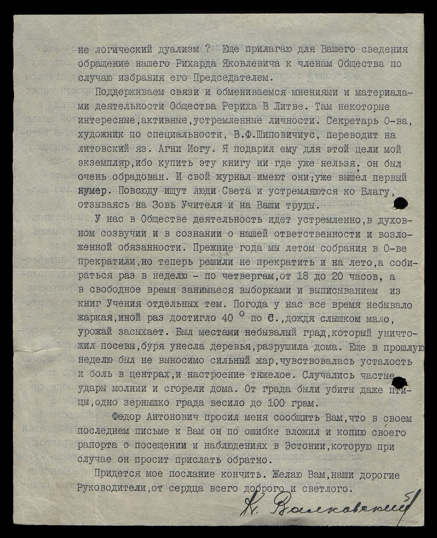 Поддерживаем связи и обмениваемся мнениями и материалами деятельности Общества Рериха в Литве. Там некоторые интересные, активные, устремленные личности. Секретарь Общества, художник по специальности, В.Ф. Шиповичиус, переводит на литовский язык Агни Йогу. Я подарил ему для этой цели мой экземпляр, ибо купить эту книгу нигде уже нельзя; он был очень обрадован. И свой журнал имеют они; уже вышел первый номер. Повсюду ищут люди Света и устремляются ко Благу, отзываясь на Зов Учителя и на Ваши труды.