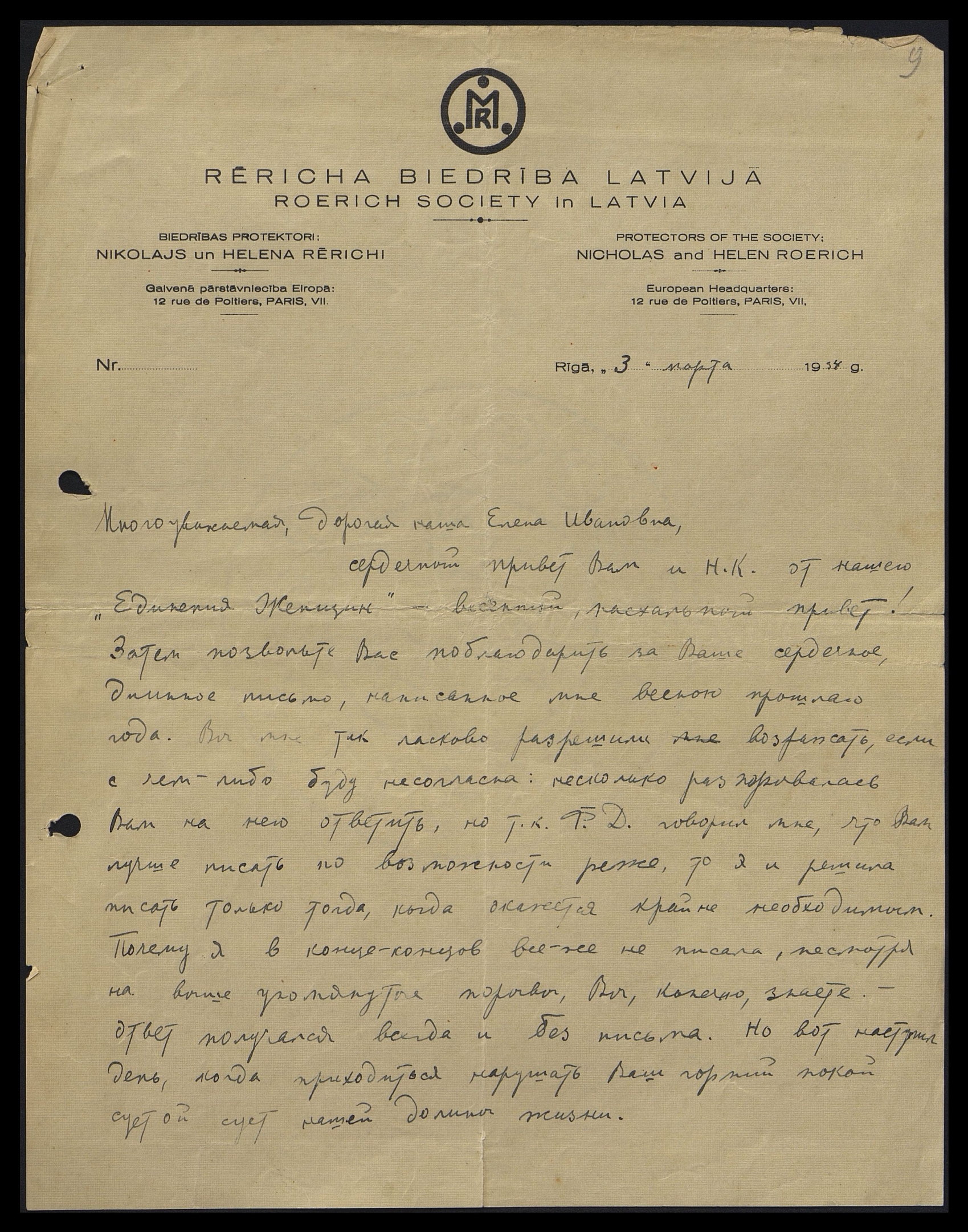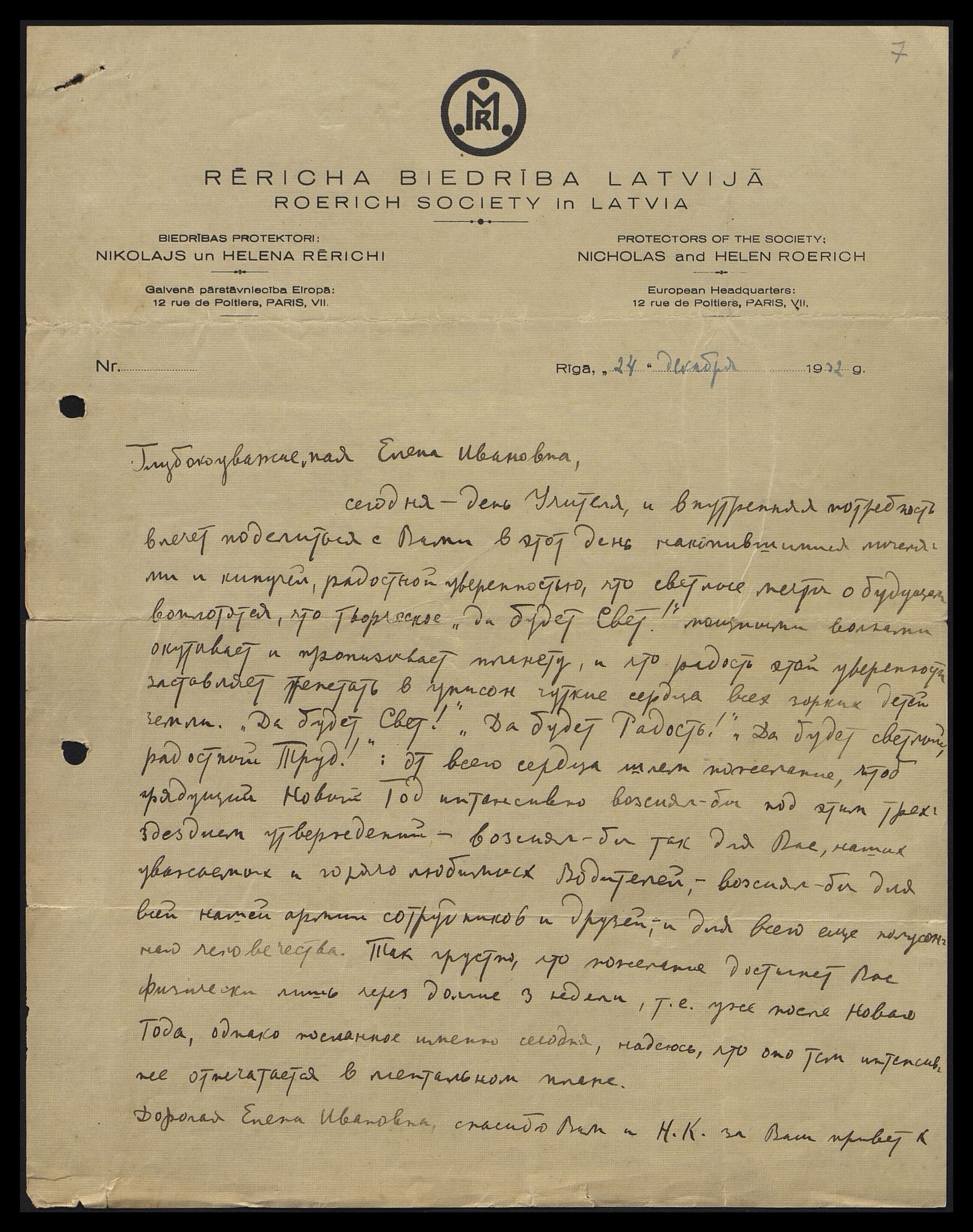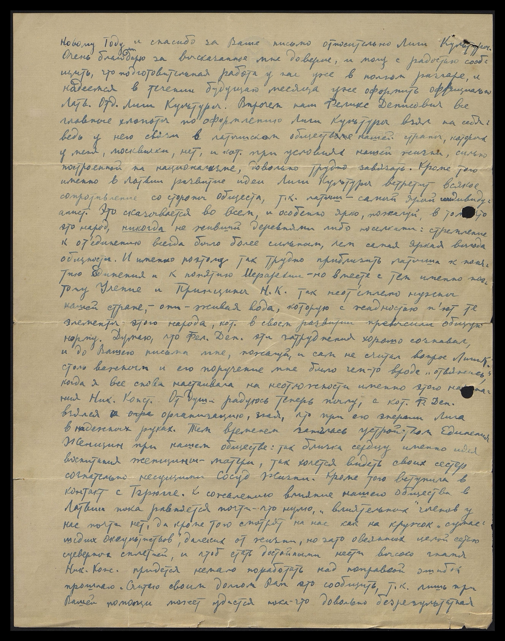 Новому Году и спасибо за Ваше письмо относительно Лиги Культуры. Очень благодарю за высказанное мне доверие и могу с радостью сообщить, что подготовительная работа у нас уже в полном разгаре, и надеемся в течении будущего месяца уже оформить официально Латвийское Отделение Лиги Культуры. Впрочем, наш Феликс Денисович все главные хлопоты по оформлению Лиги Культуры взял на себя, ведь у него связи в латышском обществе нашей страны, которых у меня, москвички, нет, и которые при условиях нашей жизни, сильно построенной на национализме, довольно трудно завязать. Кроме того, именно в Латвии развитие идеи Лиги Культуры встретит всякое сопротивление со стороны общества, т.к. латыш − самый ярый индивидуалист. Это сказывается во всём и особенно ярко, пожалуй, в том, что это народ, никогда не живший деревнями либо поселками, стремление к отъединению всегда было более сильным, чем самая яркая выгода общности. И именно поэтому так трудно приблизить латыша к понятию Единения и к понятию Иерархии, но вместе с тем именно поэтому Учение и Принципы Николая Константиновича так неотъемлемо нужны нашей стране, они − живая вода, которую с жадностью пьют те элементы этого народа, которые в своём развитии превысили общую норму. Думаю, что Феликс Денисович эти затруднения хорошо сознавал, и до Вашего письма мне, пожалуй, и сам не считал вопрос Лиги Культуры столь важным, и его поручение мне было чем-то вроде "отвяжись", когда я всё снова настаивала на неотложности именно этого назначения Николая Константиновича. От души радуюсь теперь пылу, с которым Феликс Денисович взялся за организацию, зная, что при его энергии Лига в надежных руках. Тем временем занялась устройством Единения Женщин при нашем обществе, так хочется видеть своих сестер, сознательно несущими Сосуд Жизни. Кроме того, вступила в контакт с Терюлле. К сожалению, влияние нашего общества в Латвии пока равняется почти что нулю, и влиятельных членов у нас почти нет, да кроме того смотрят на нас как на кружок "сумасшедших оккультистов", далеких от жизни, но зато овеянных целой сетью суеверных сплетней, и чтоб стать достойными нести высоко знамя Ник[олая] Конс[тантиновича] придется поработать над поправкой ошибок прошлого. Считаю своим долгом Вам это сообщить, т.к. лишь при Вашей помощи может удастся пока что довольно безрезультатная